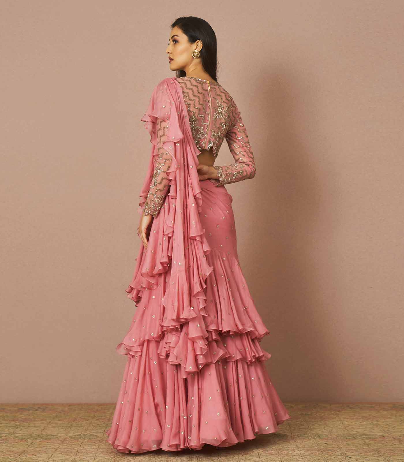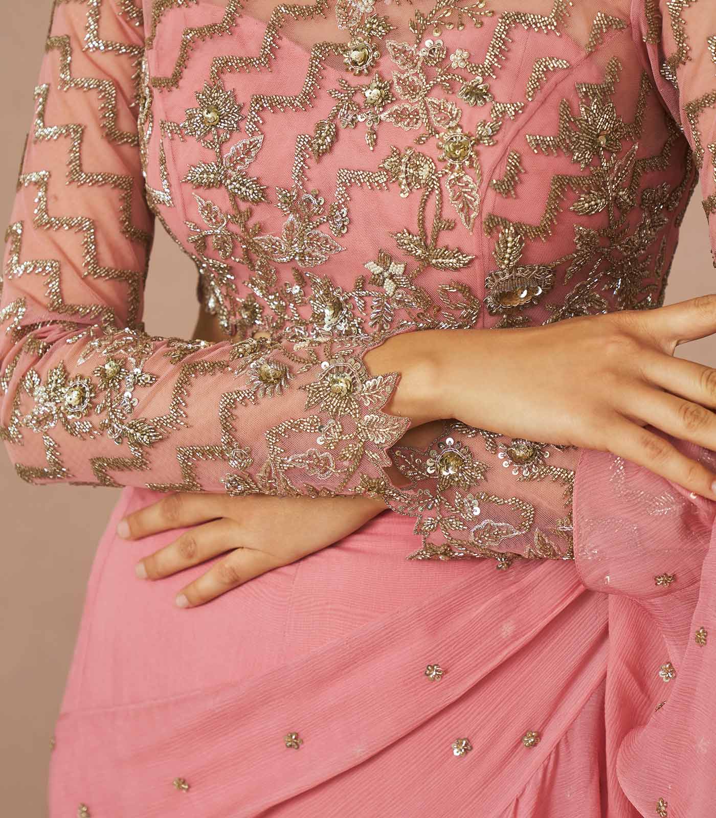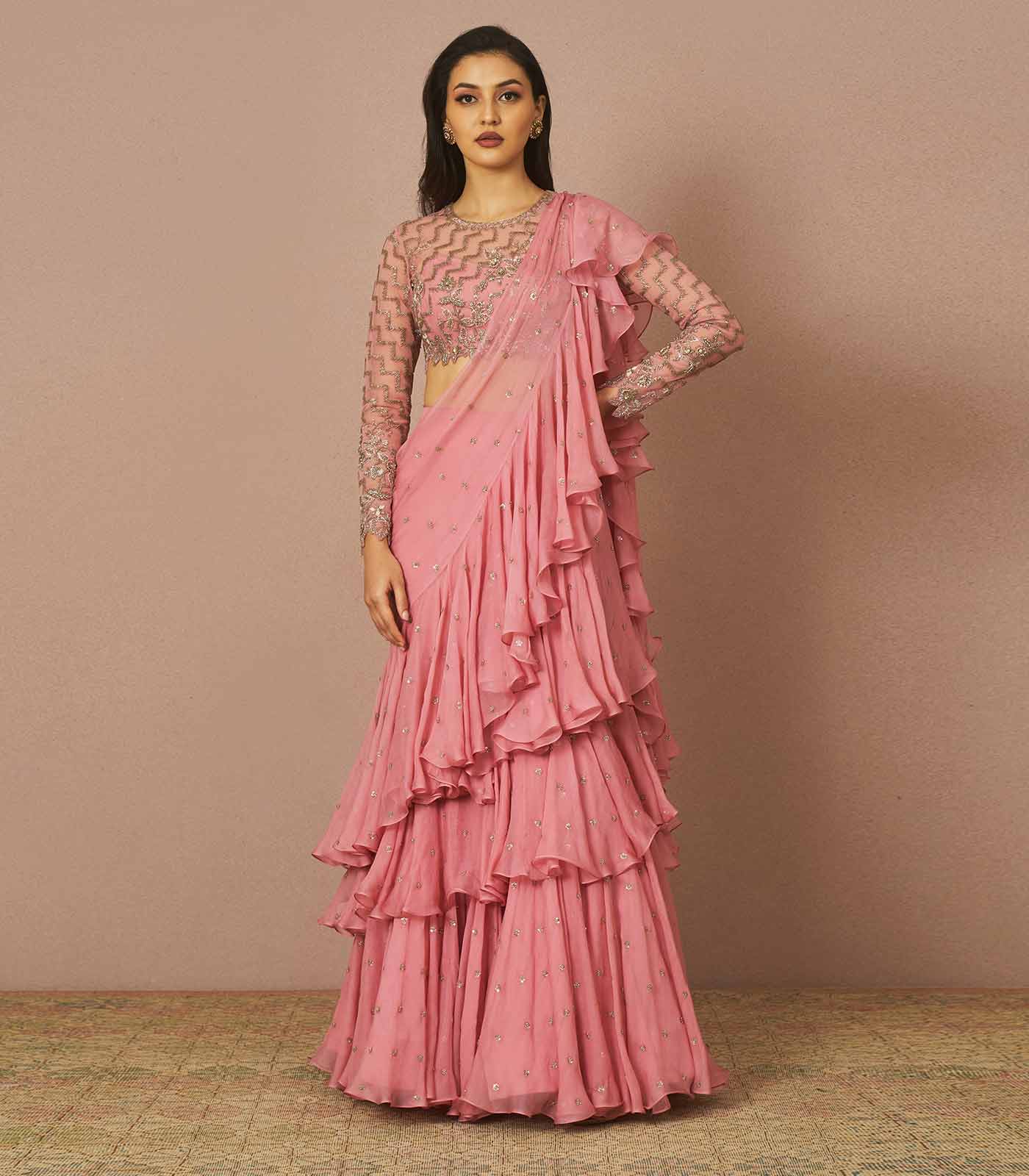 Pink is our full sleeved cutdana embroidered blouse in ivory with the chiffon saree set adorned with chitta embroidery all over with ably stitched ruffles.