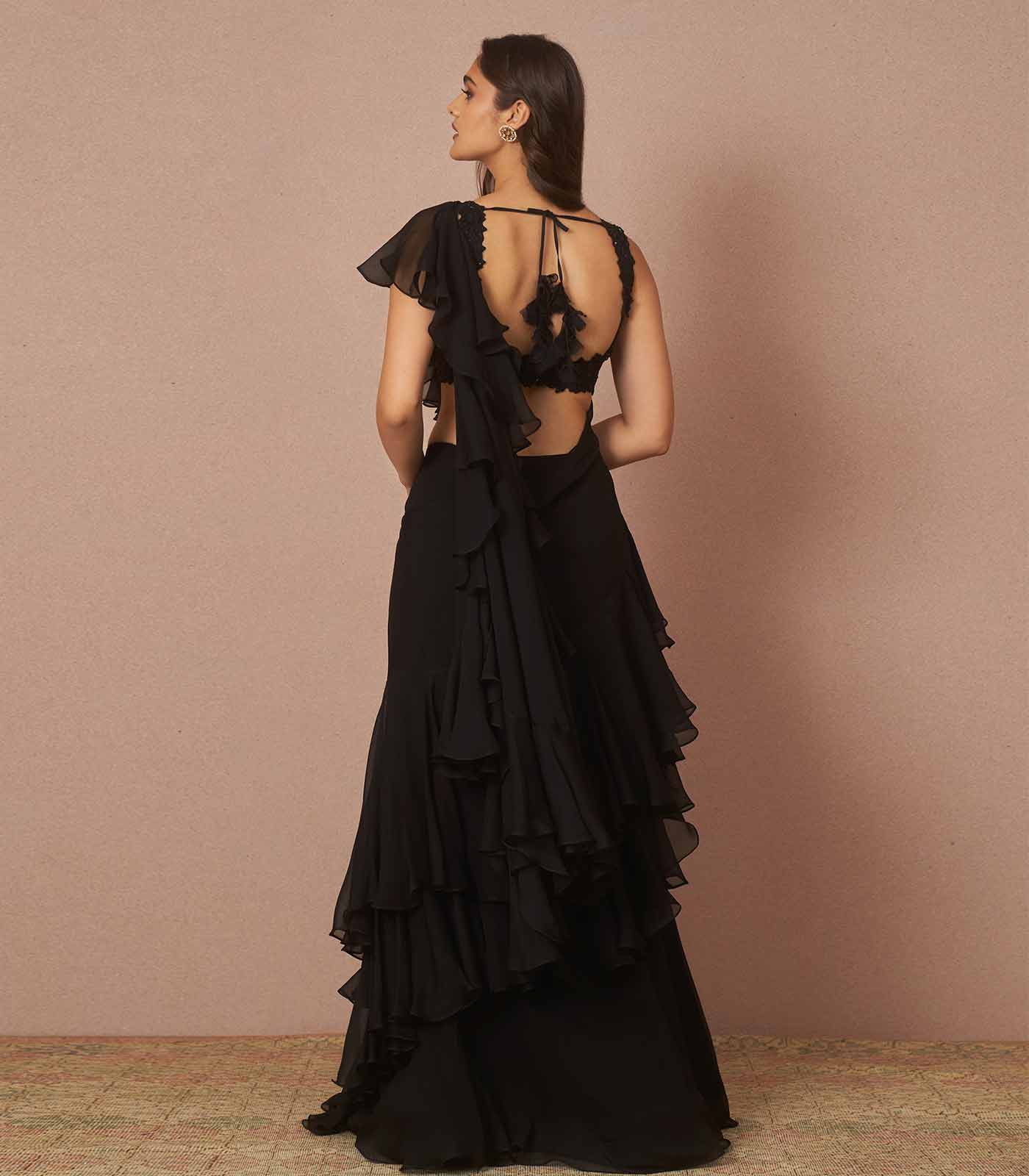 Our black staple organza ruffle saree set Aalia is adorned with cutdana embroidery detailed with intricate cutwork.