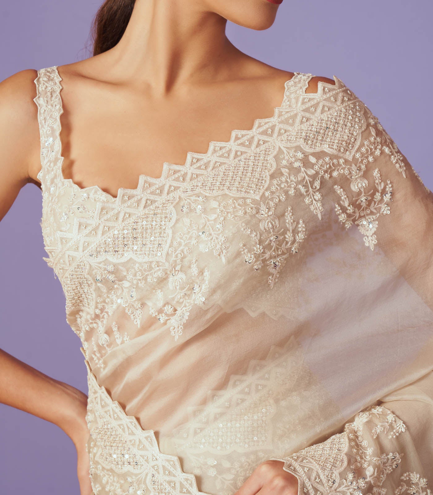 IVORY ORGANZA AARI SAREE SET