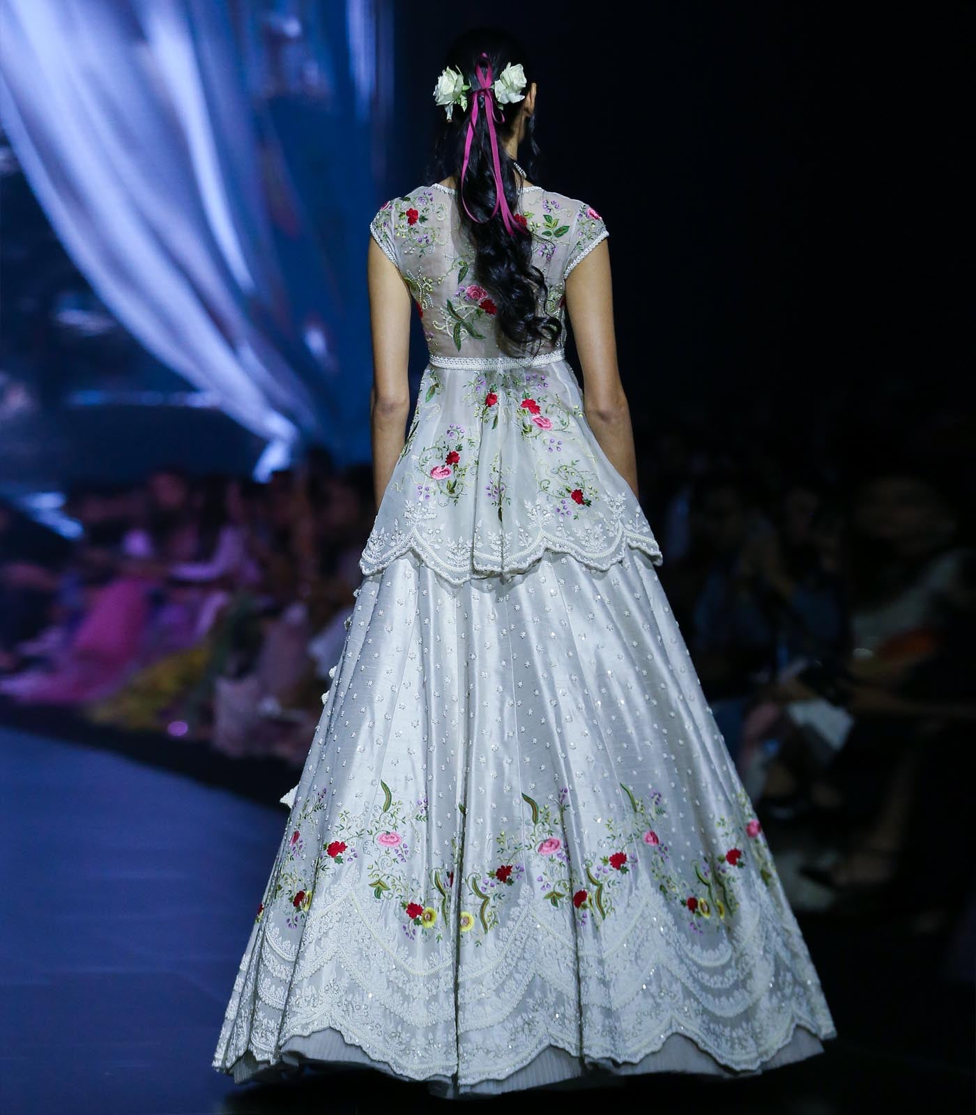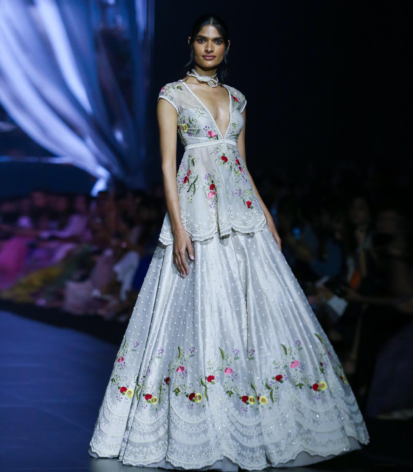 GREYISH IVORY RAWSILK MULTITHREAD PEARL EMB "AIRAH" PEPLUM JACKET LEHENGA SET