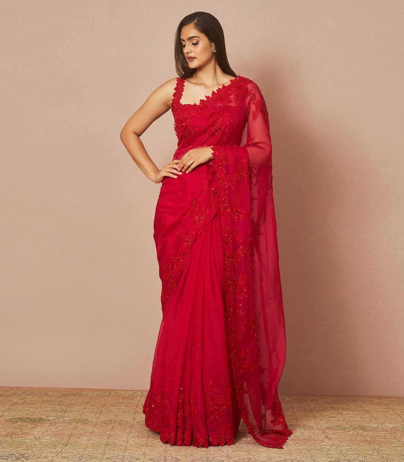 Our signature red organza sheer saree set with intricate cutwork and cutdana adorned Amaryllis saree set.