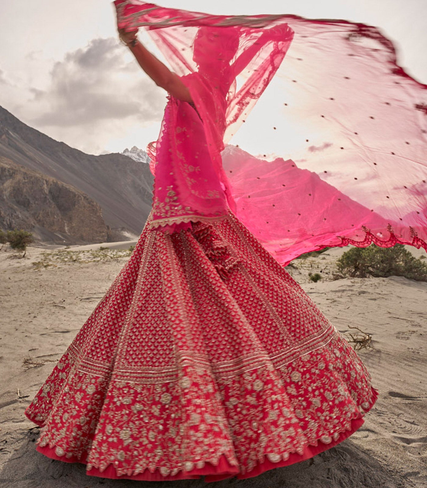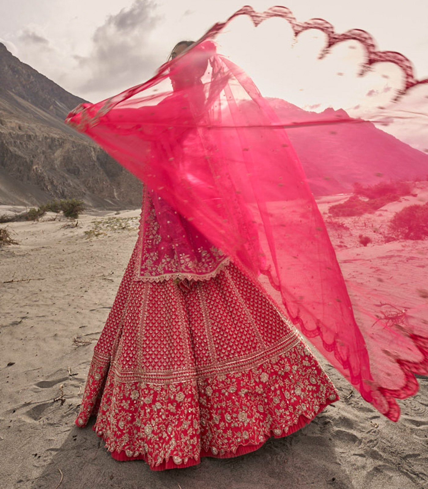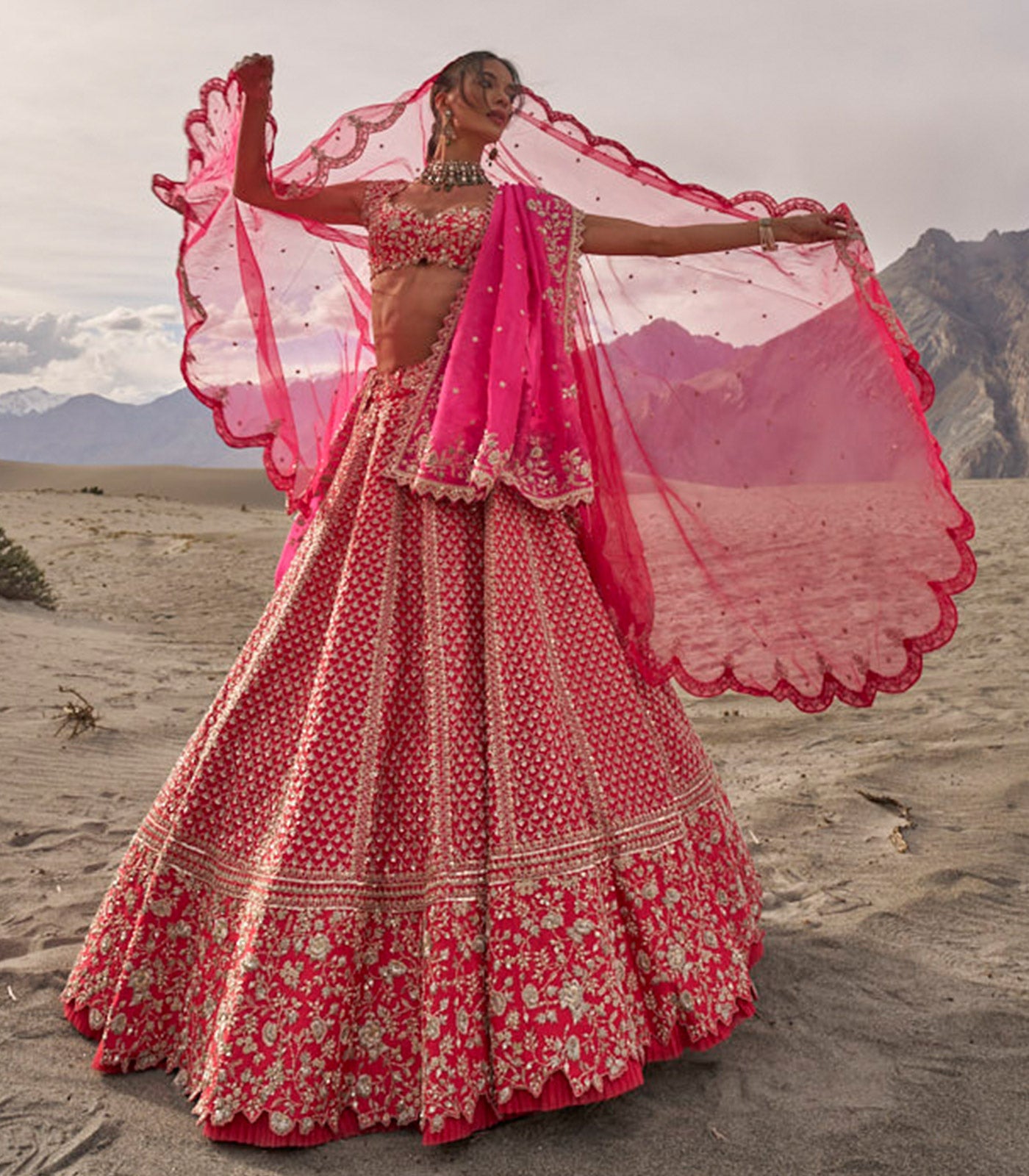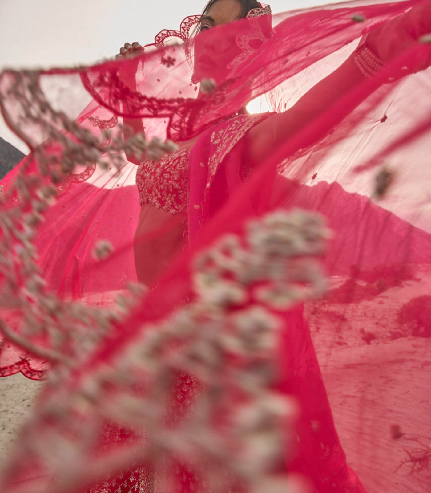 DEEP PEACHISH PINK ORGANZA AMEEN LEHENGA SET WITH HOT PINK DUPATTA