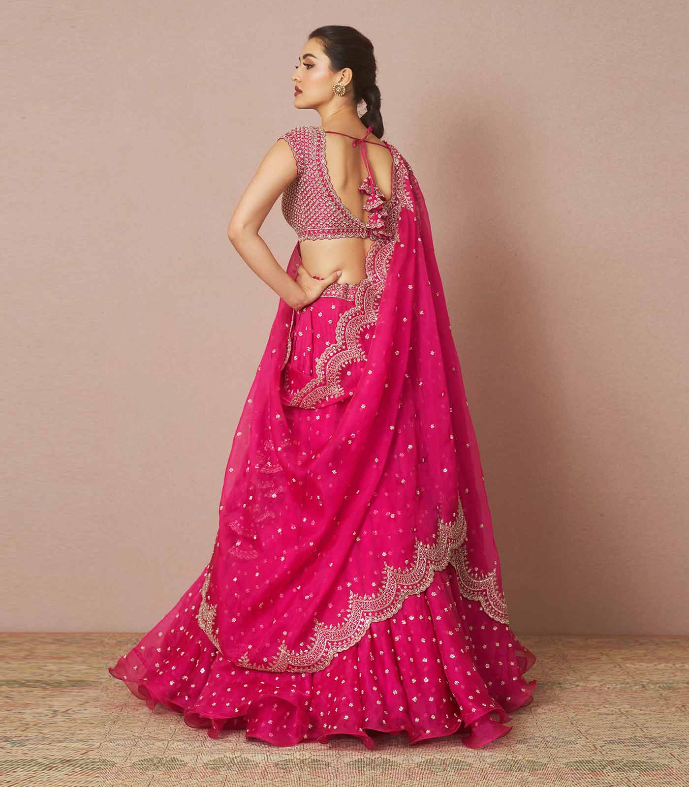 Reviving the colour of traditional Indian couture, our pink 'Narin' organza-pico lehenga set is paired with a heavily embroidered blouse and scallop dupatta.