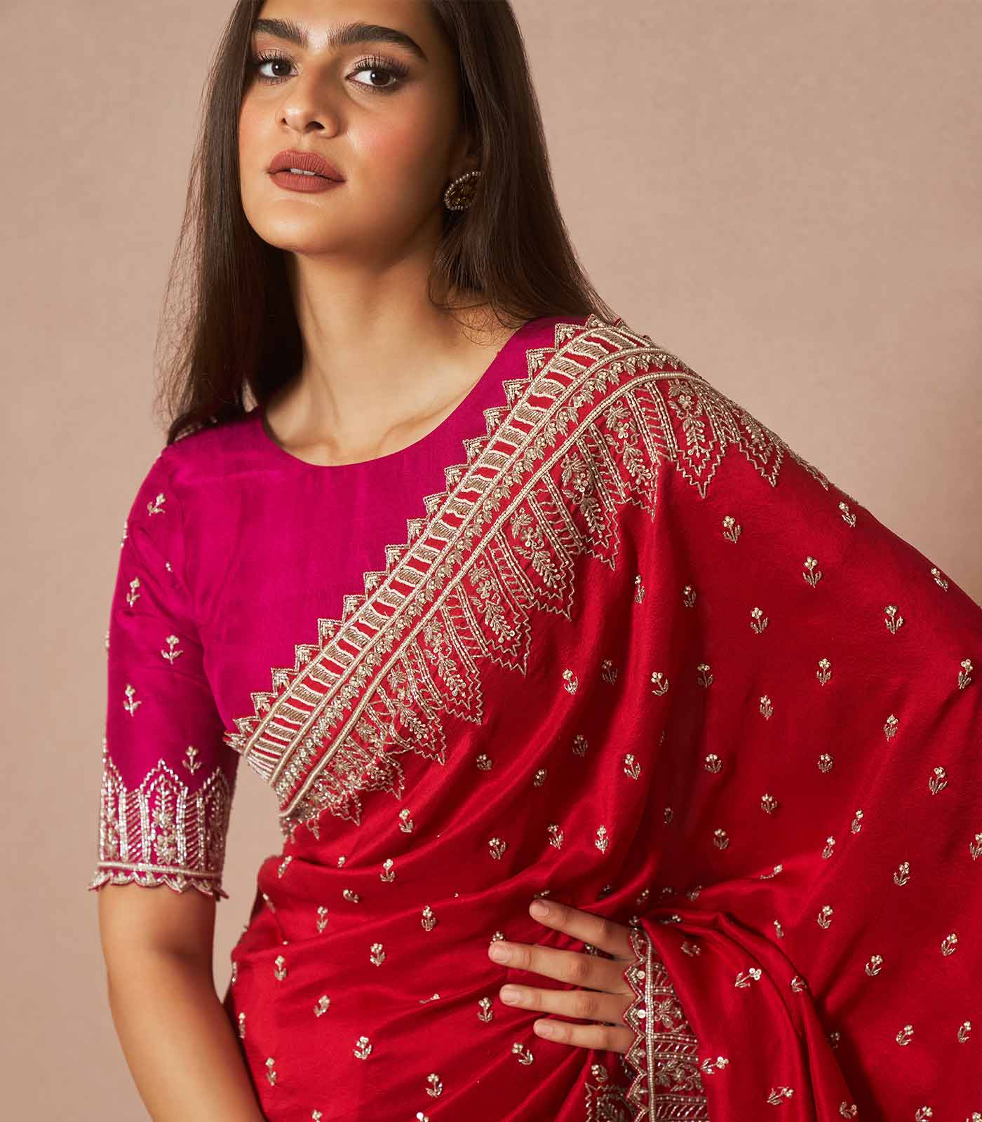 Cherry red Avalin is a silk saree set adorned with all over Chitta embroidery with a heavy border embroidered with cutdana.