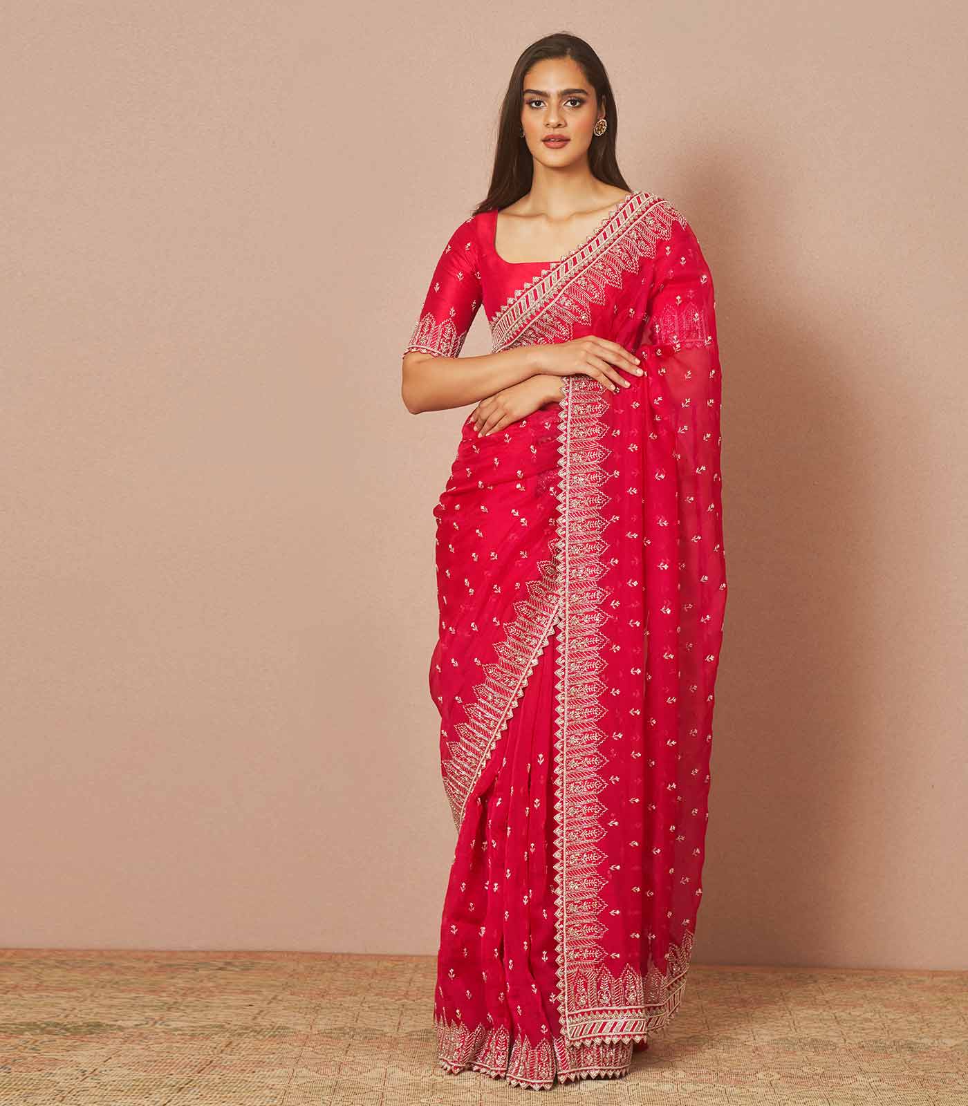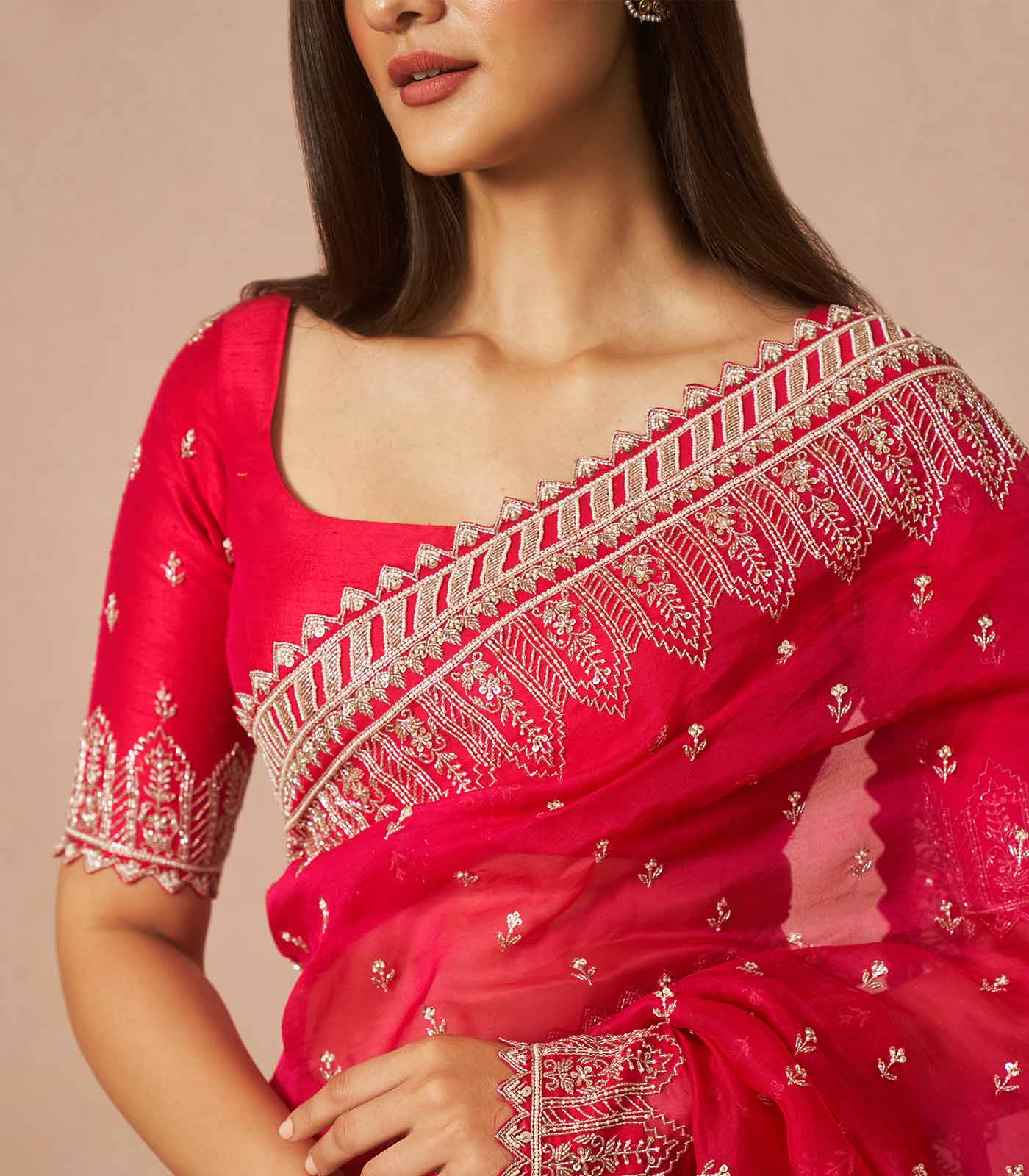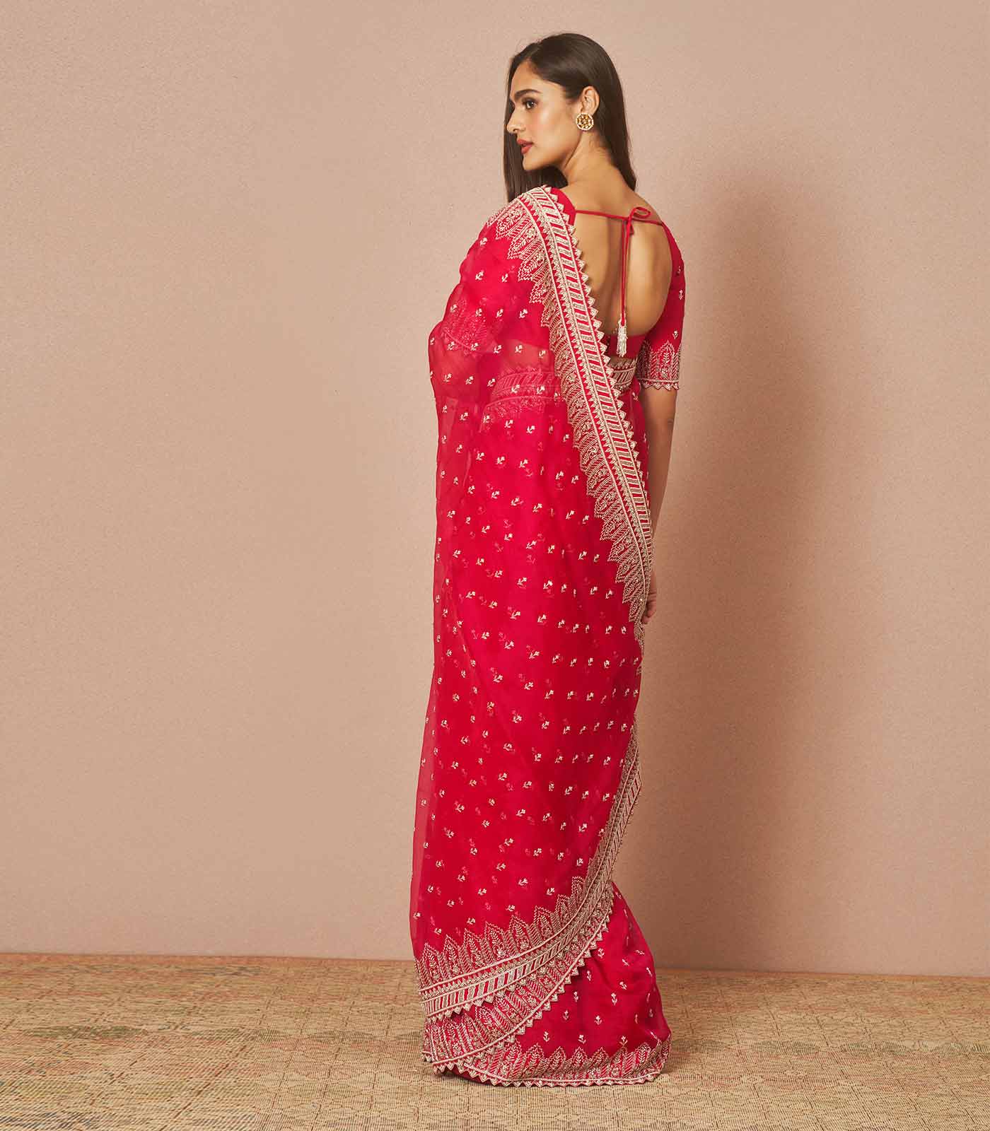 Cherry red Avalon is an organza saree set adorned with all over Chitta embroidery with a heavy border embroidered with cutdana.
