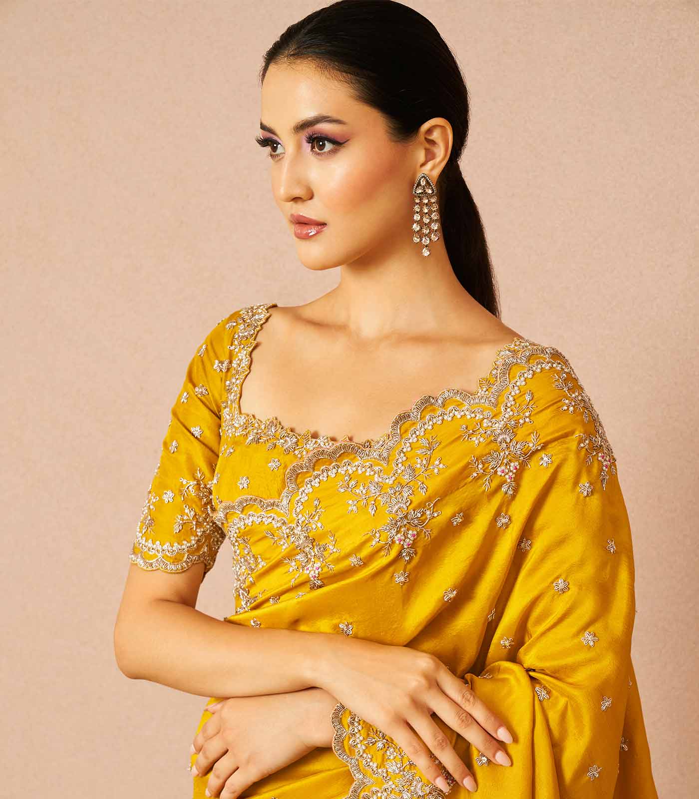 Our 'Azra' saree set with beautifully done scallop border work made with yellow dupion silk accompanied with raw silk matching blouse.