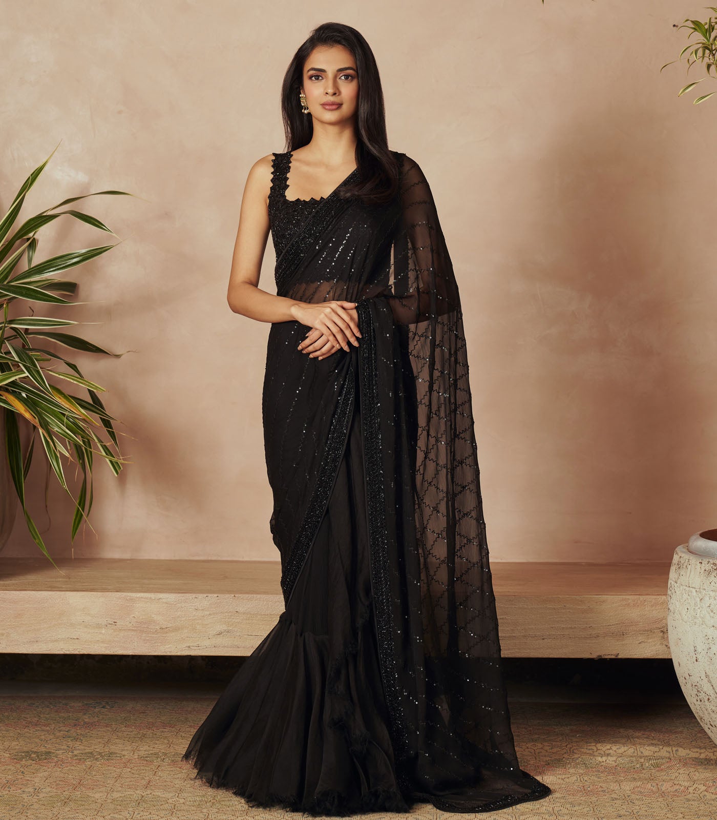 BLACK CHIFFON SEQUIN RUFFLE SAREE SET