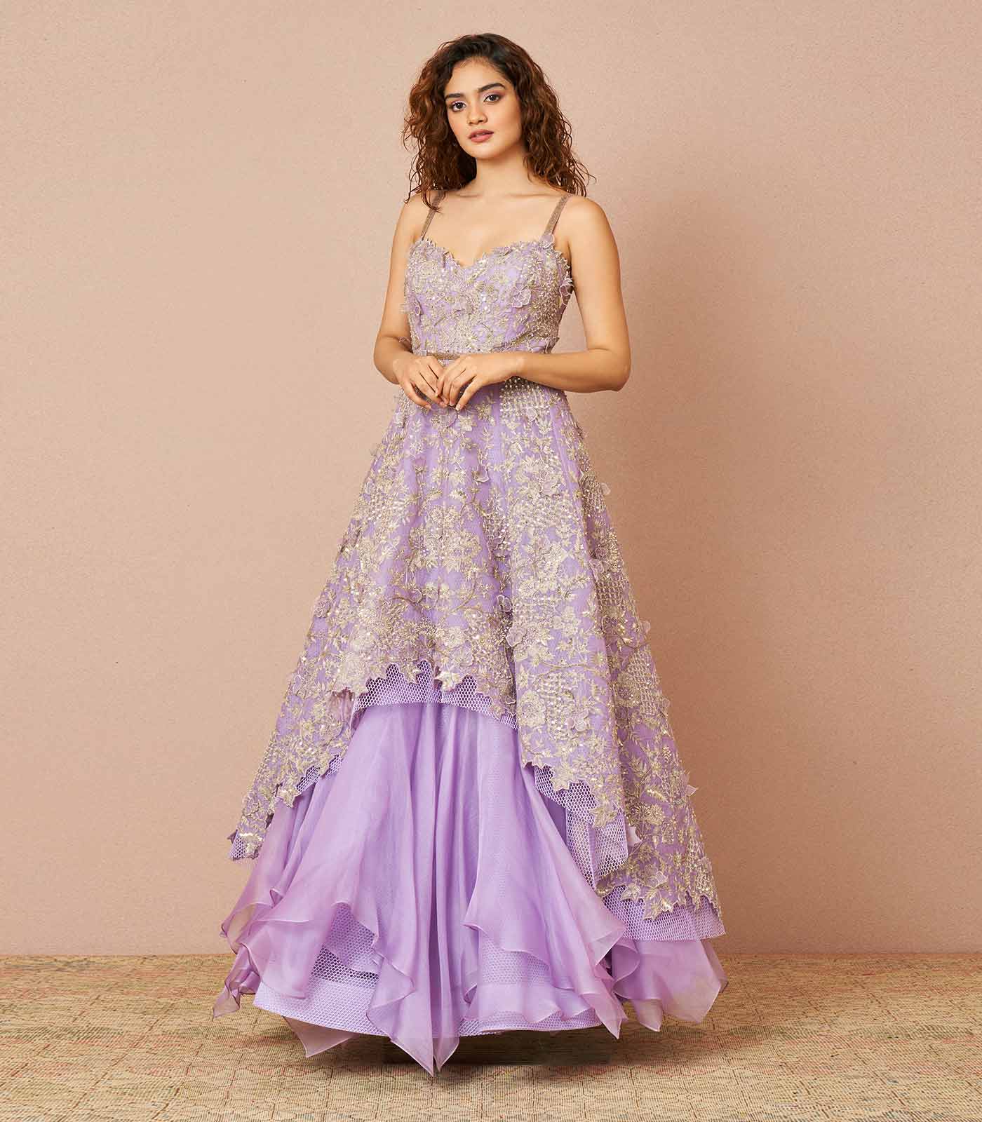 A lavender organza co-ord set with red tonal 3D embroidered high low kurta and skirt sure to turn heads.