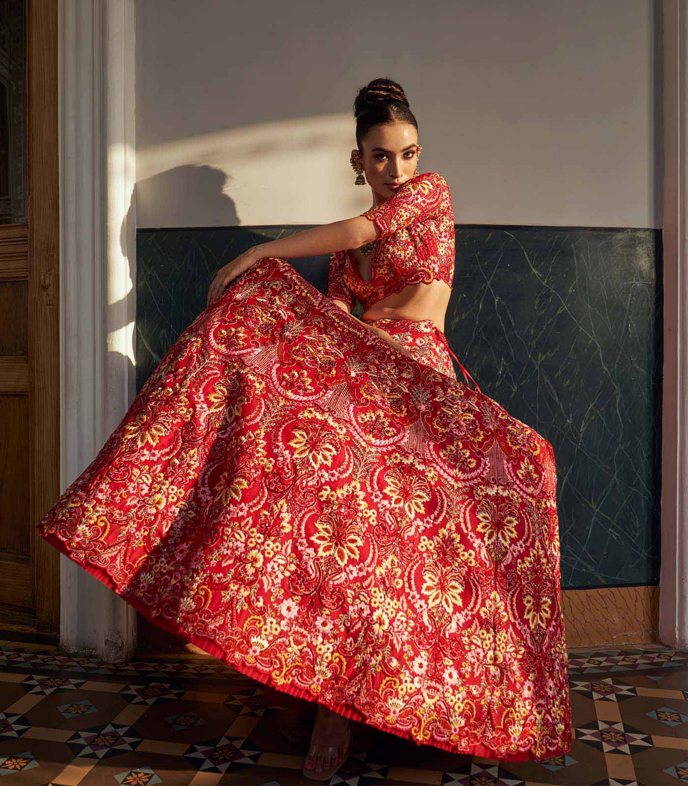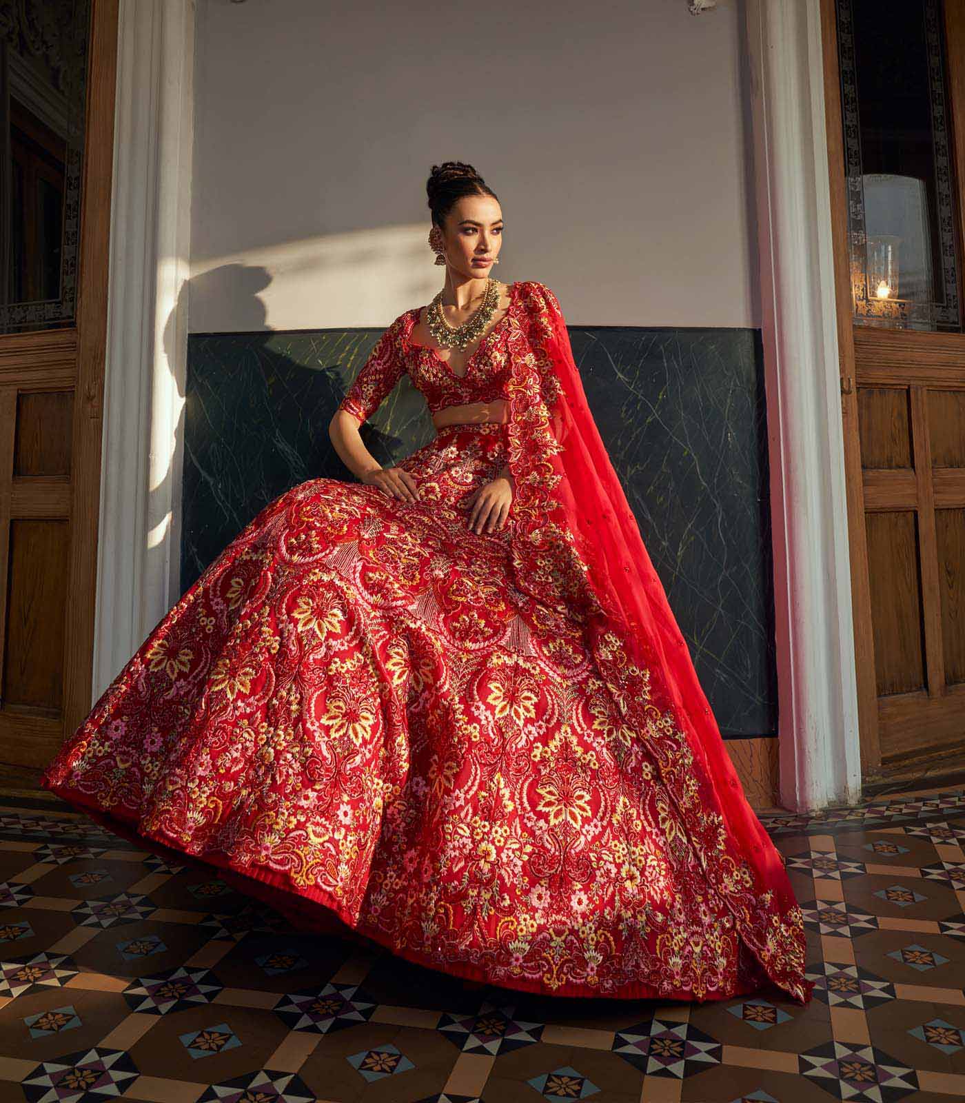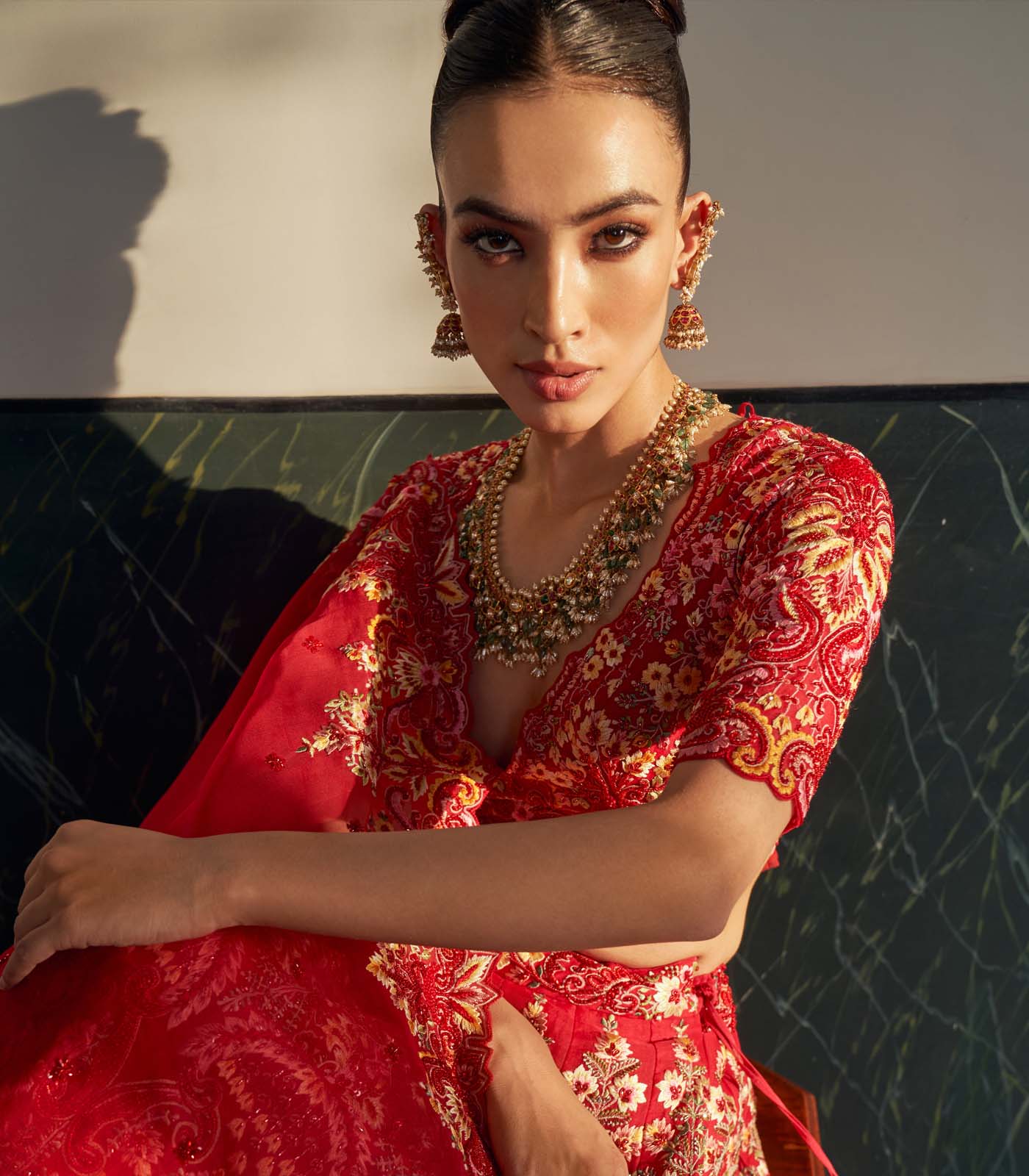 RED MUTLI THREAD EMB ORGANZA HILITED "CARNATION" LEHENGA SET