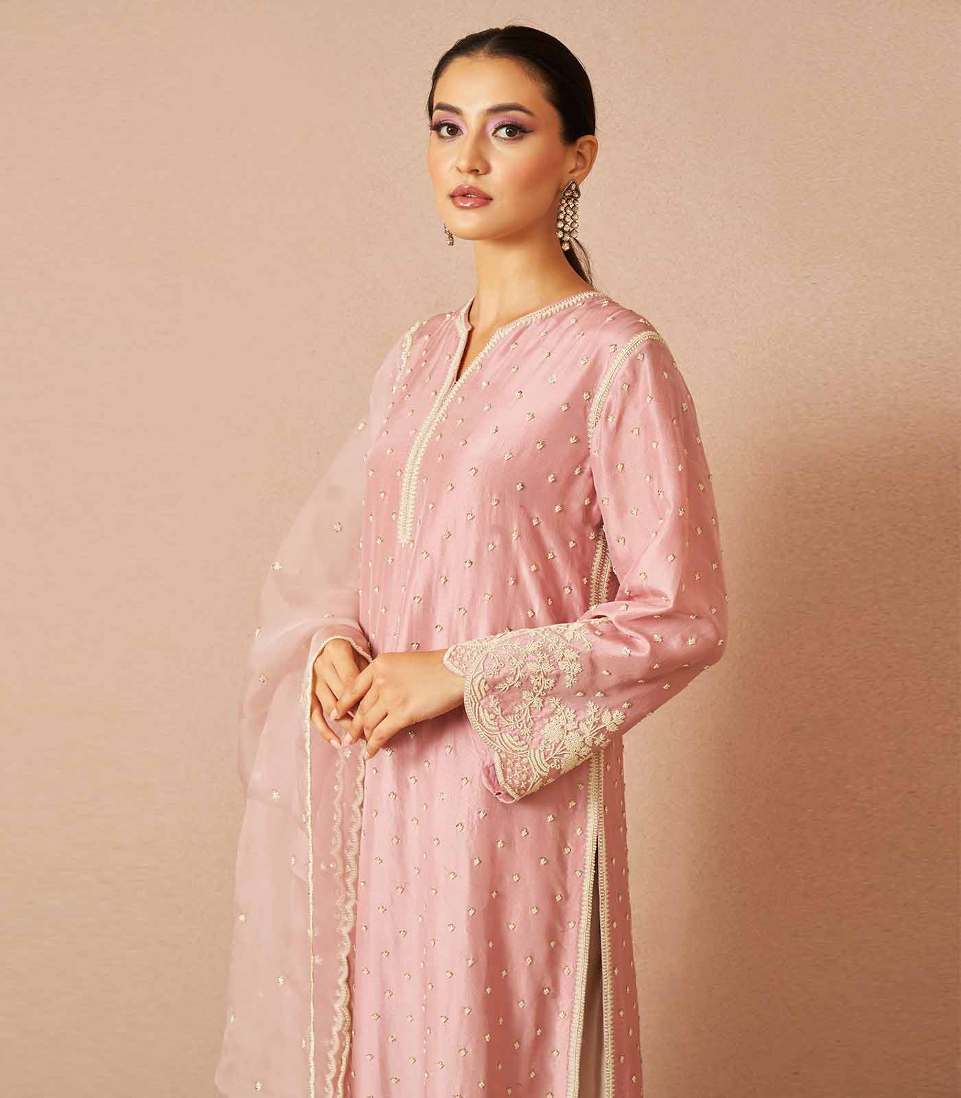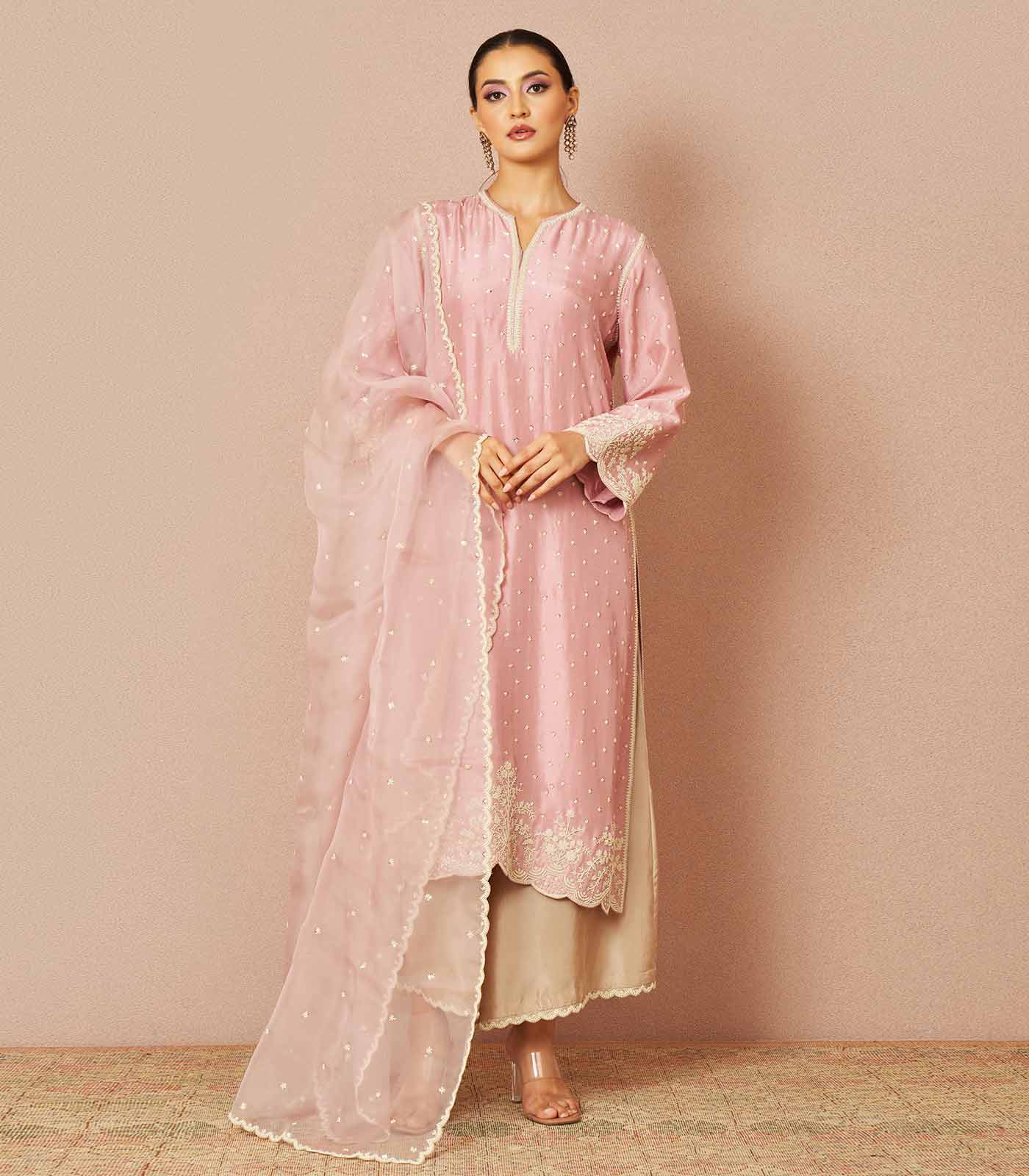 A beautiful rose pink silk kurta set with intricate pearl embroidery paired with eye-catching embroidered ivory silk pants and rose pink organza dupatta.