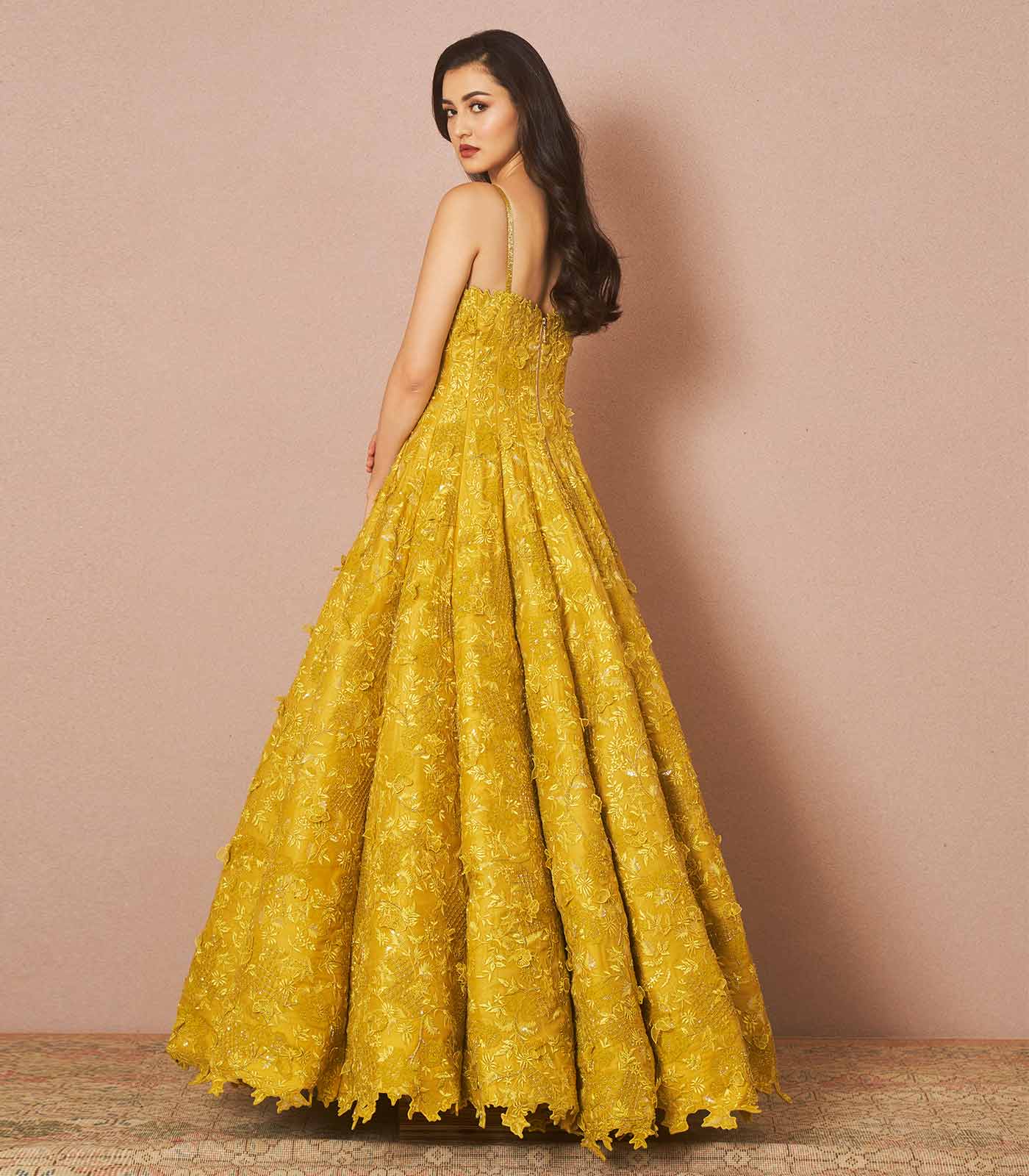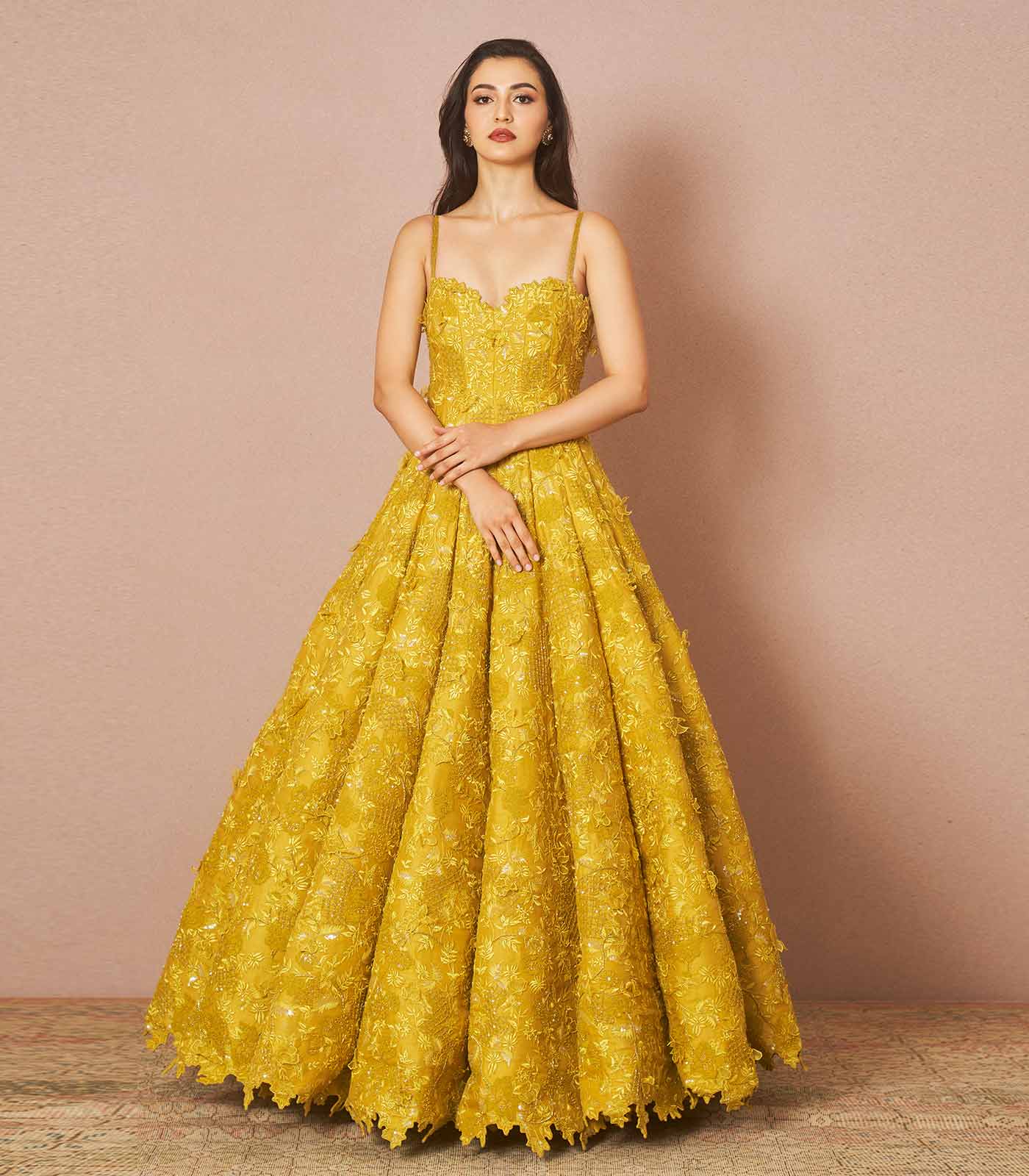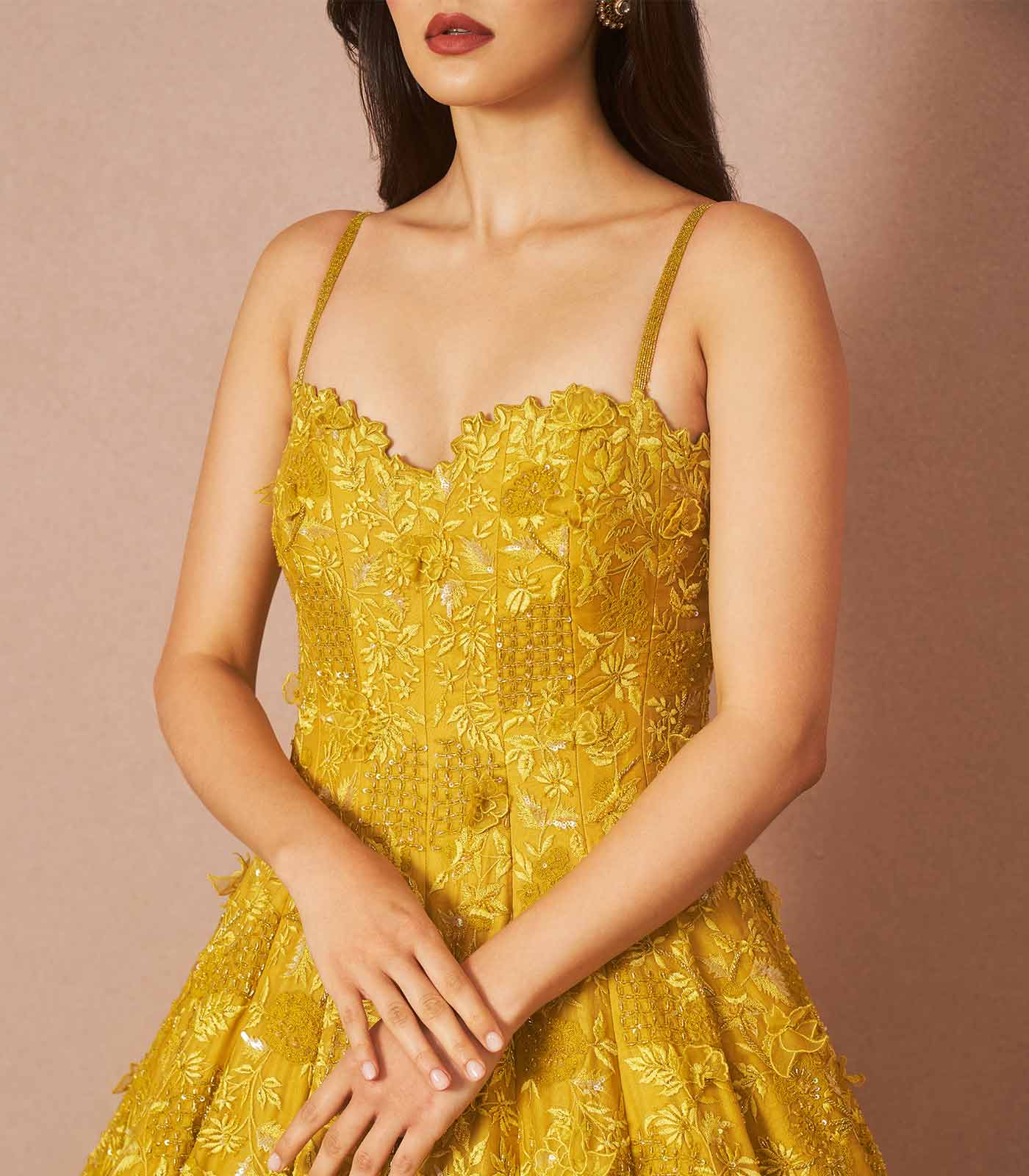 An alluring floor sweeping sculpted gown is adorned with floral branched with geometric patterns chinched at the waist and further embellished with cut organza flowers and embellishment to adorn the beauty of the sculptued aura.