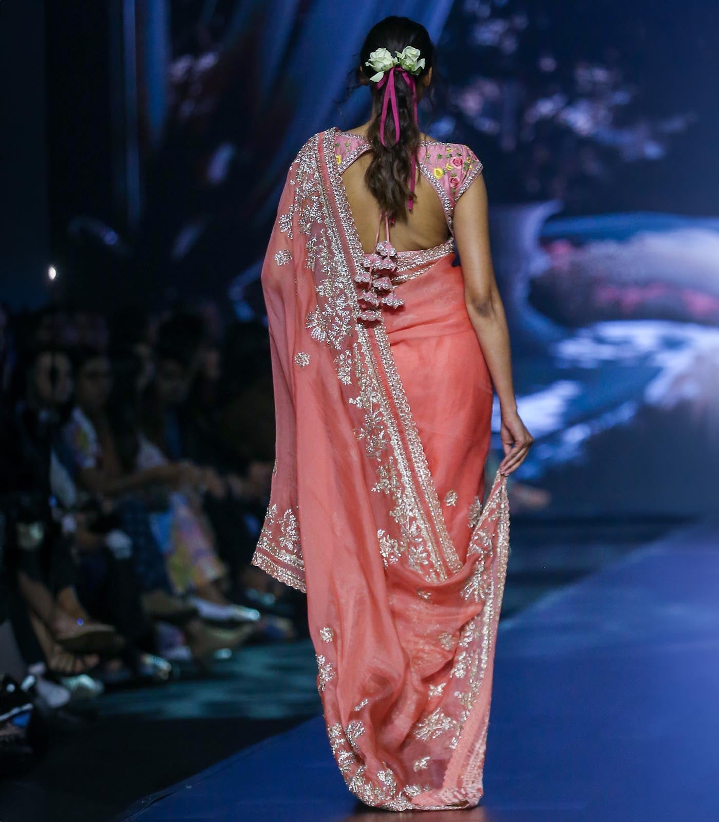 CORAL ORGANZA ZARDOZI FLORAL SCALLOP "THITHLI" SAREE SET