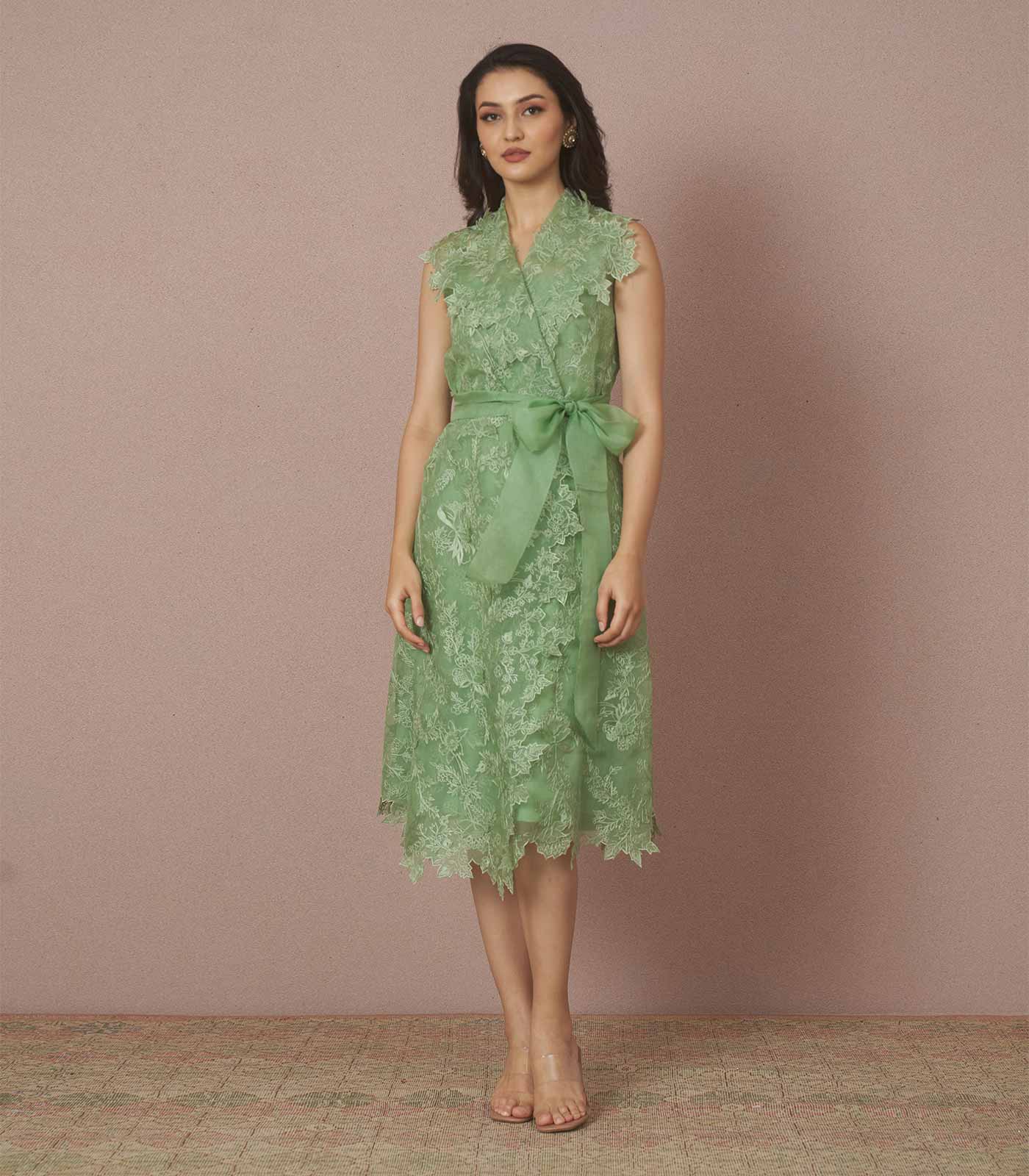 A Parisian dream, an ode to classic blazzer dress, our Sea green tonal embroidery Cyra wrap dress is beautifully embroidered in fine silk thread and features a exagerated collar and a self tie organza belt that beautifully shapes the waist and enhances grace.