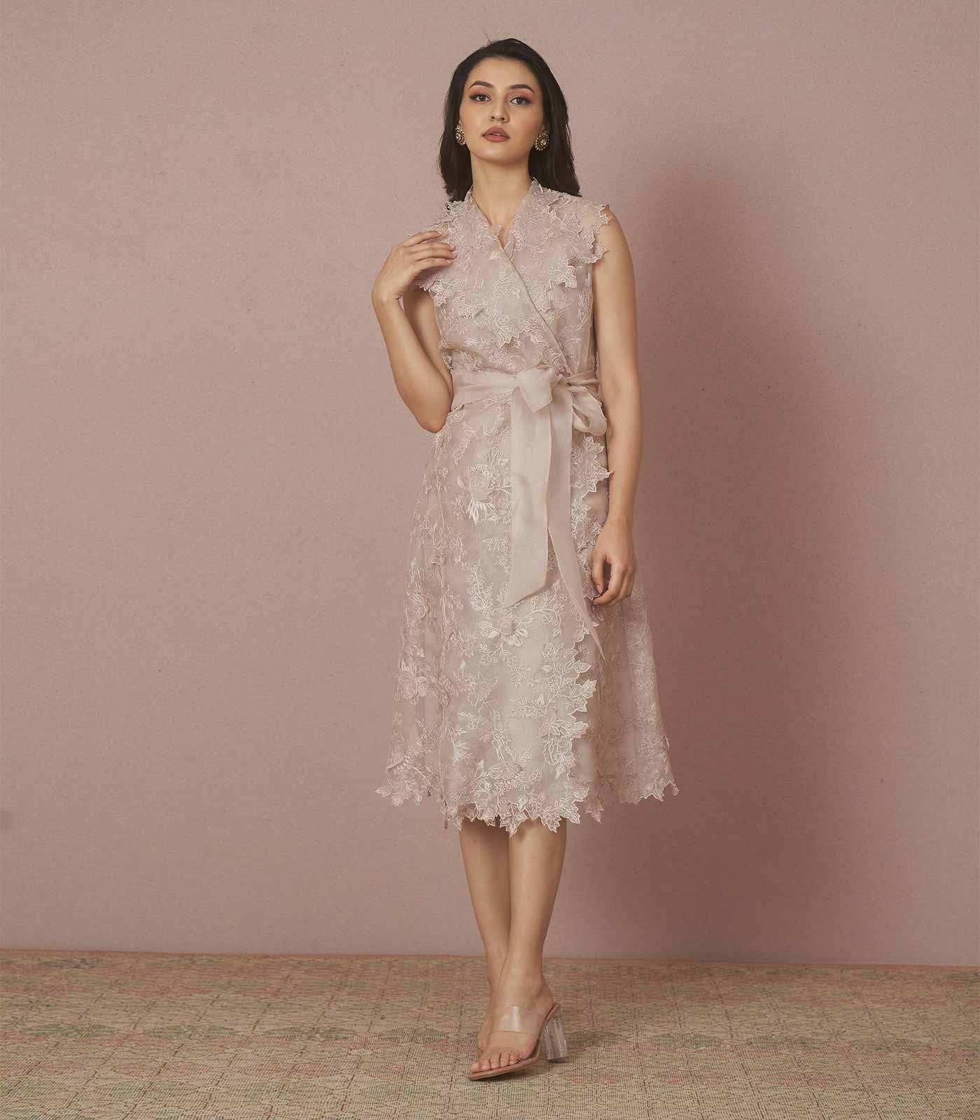 A Parisian dream, an ode to classic blazzer dress, our Ivory tonal embroidery Cyra wrap dress is beautifully embroidered in fine silk thread and features a exagerated collar and a self tie organza belt that beautifully shapes the waist and enhances grace.