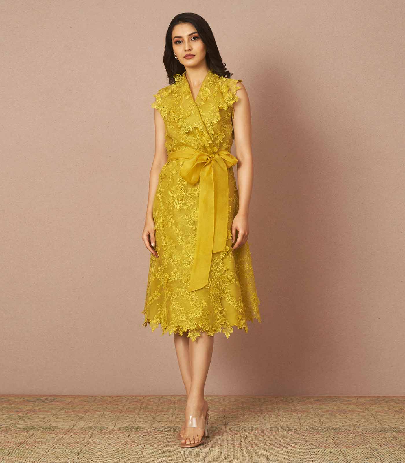 A Parisian dream, an ode to classic blazzer dress, our Yellow tonal embroidery Cyra wrap dress is beautifully embroidered in fine silk thread and features a exagerated collar and a self tie organza belt that beautifully shapes the waist and enhances grace.