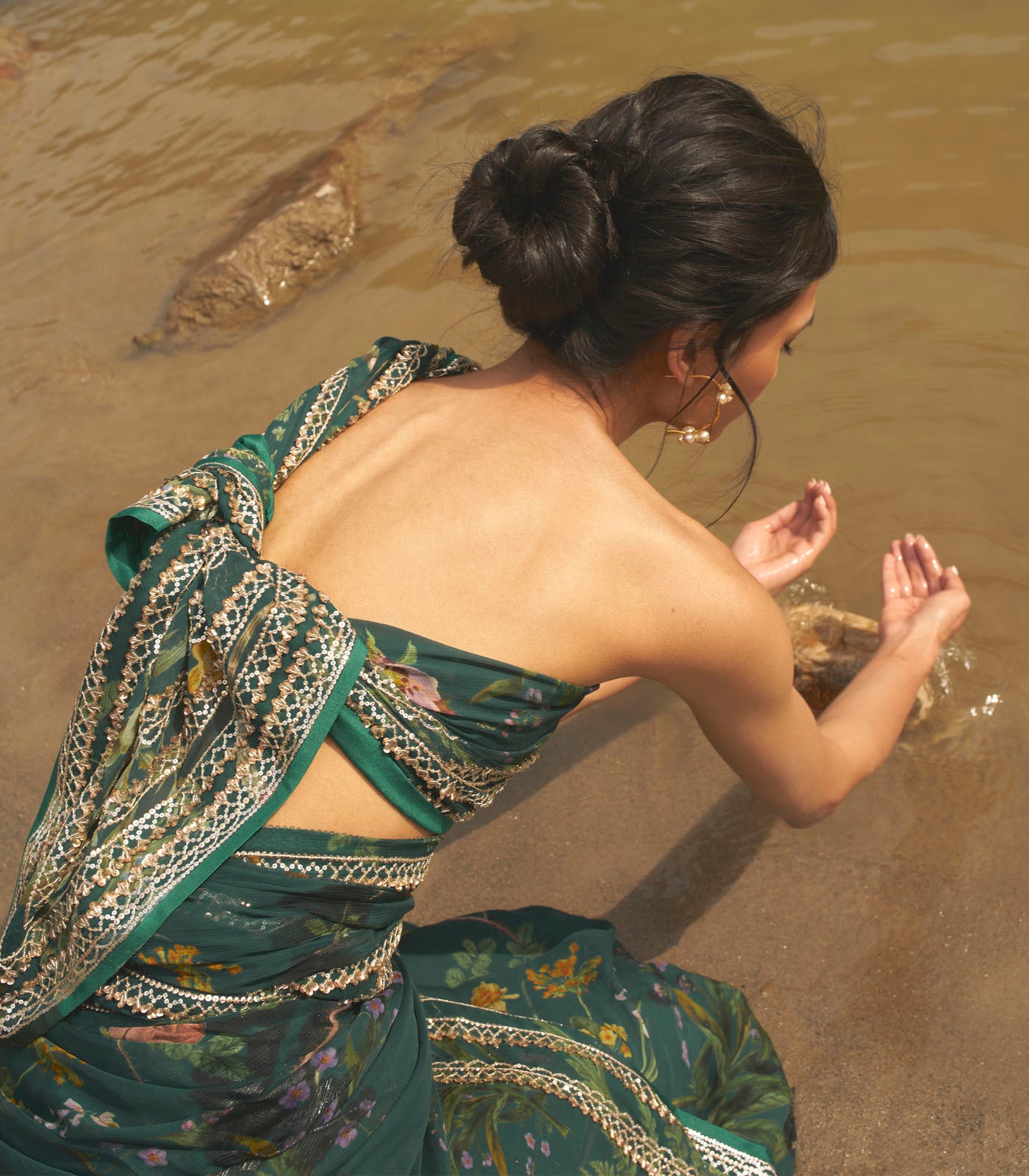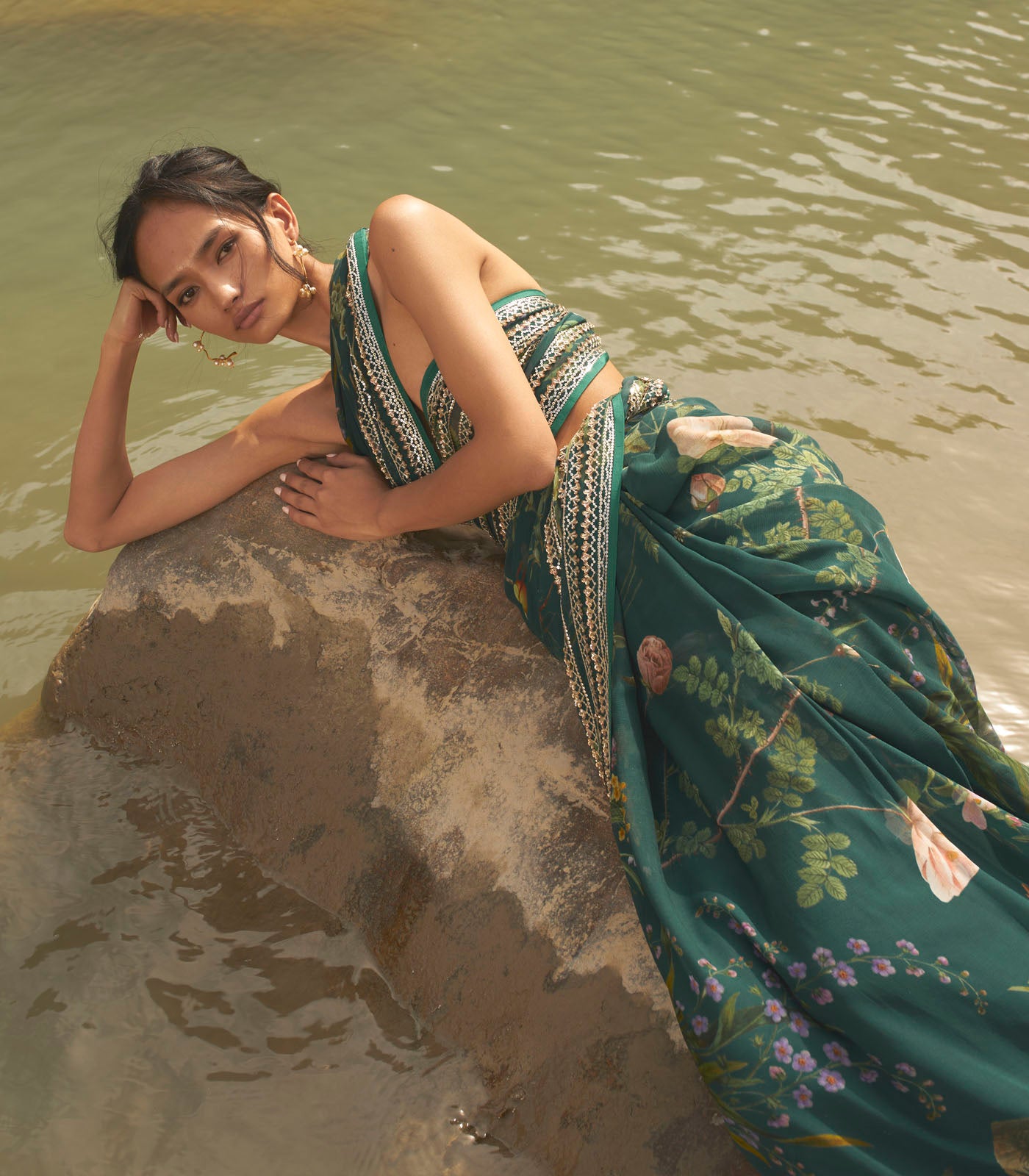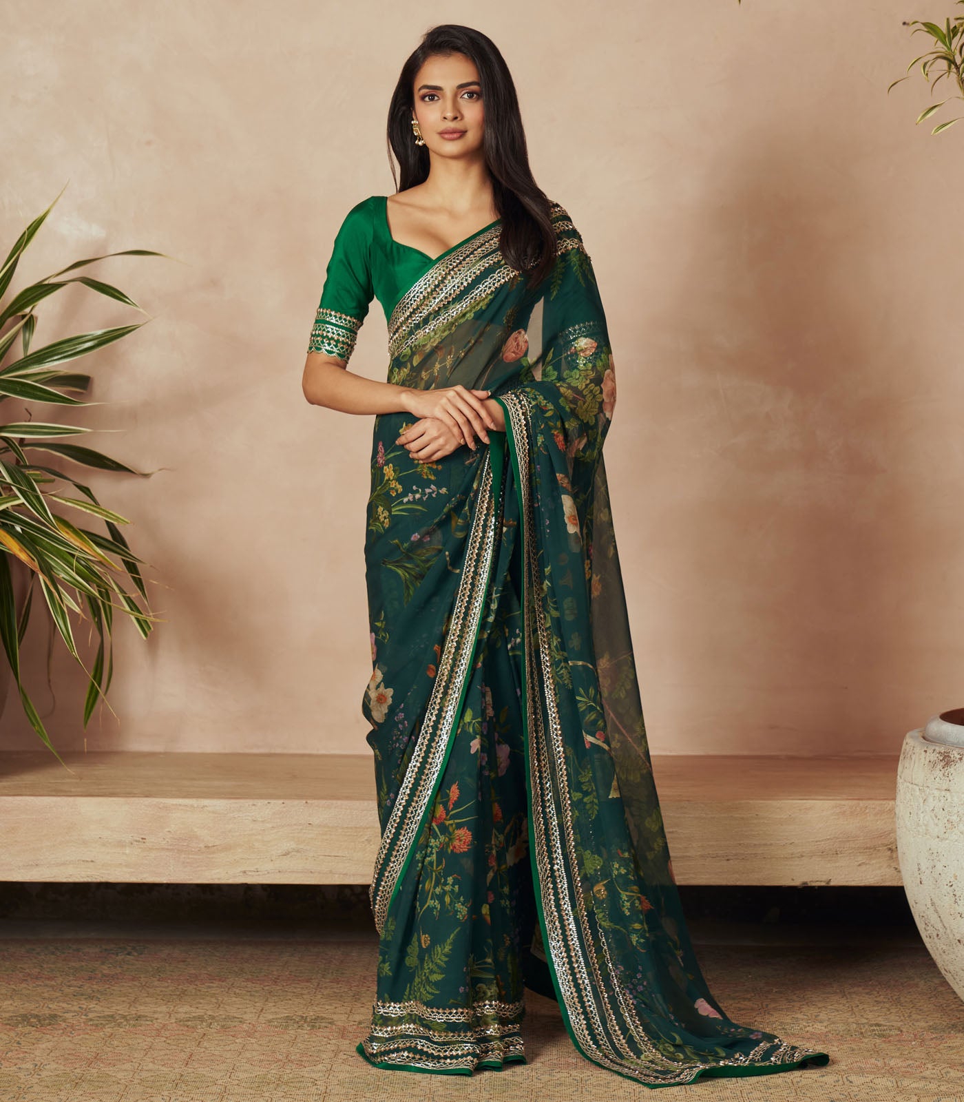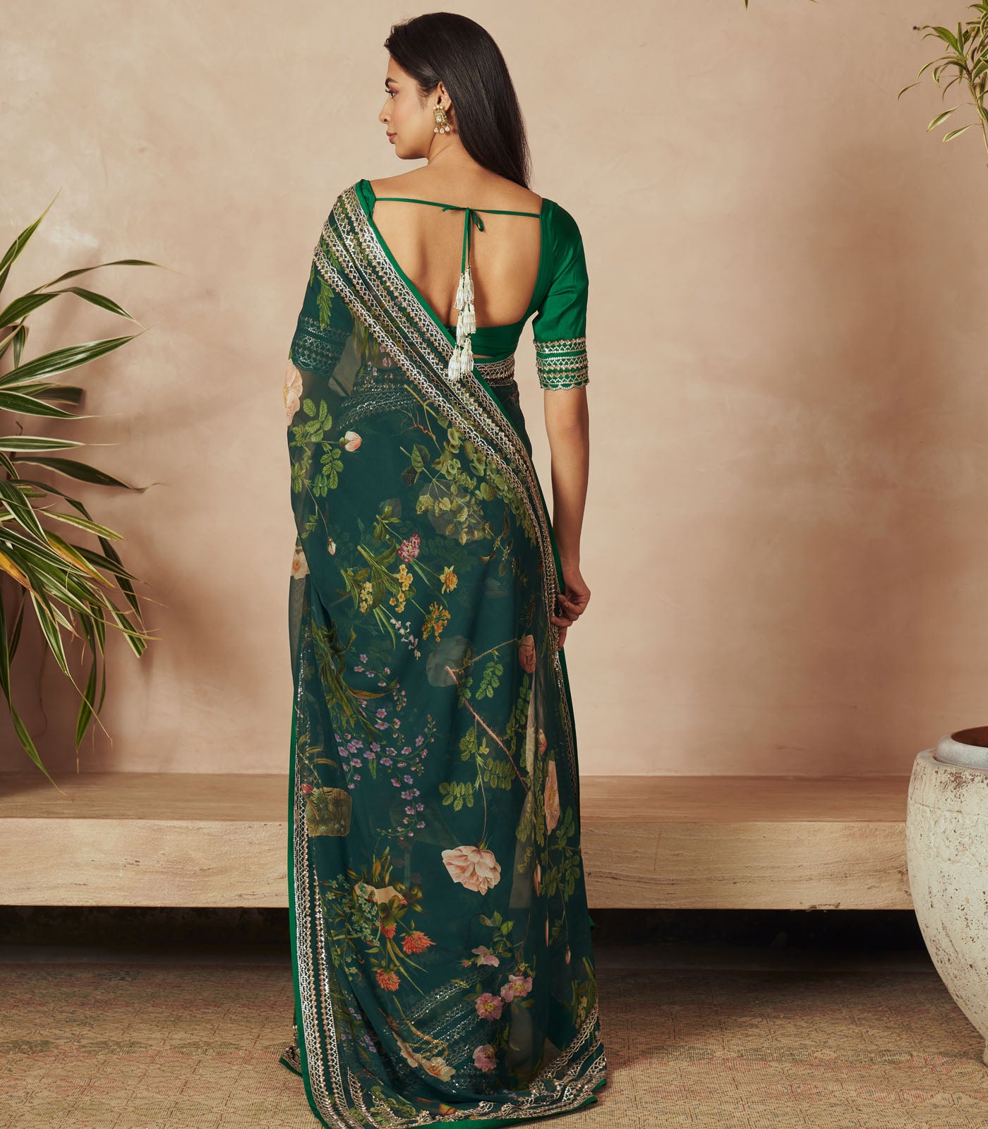 DARK GREEN PRINTED CHIFFON SEQUIN BORDER SAREE WITH UNSTITCHED BLOUSE FABRIC WITH EMBROIDERY ON SLEEVES.
