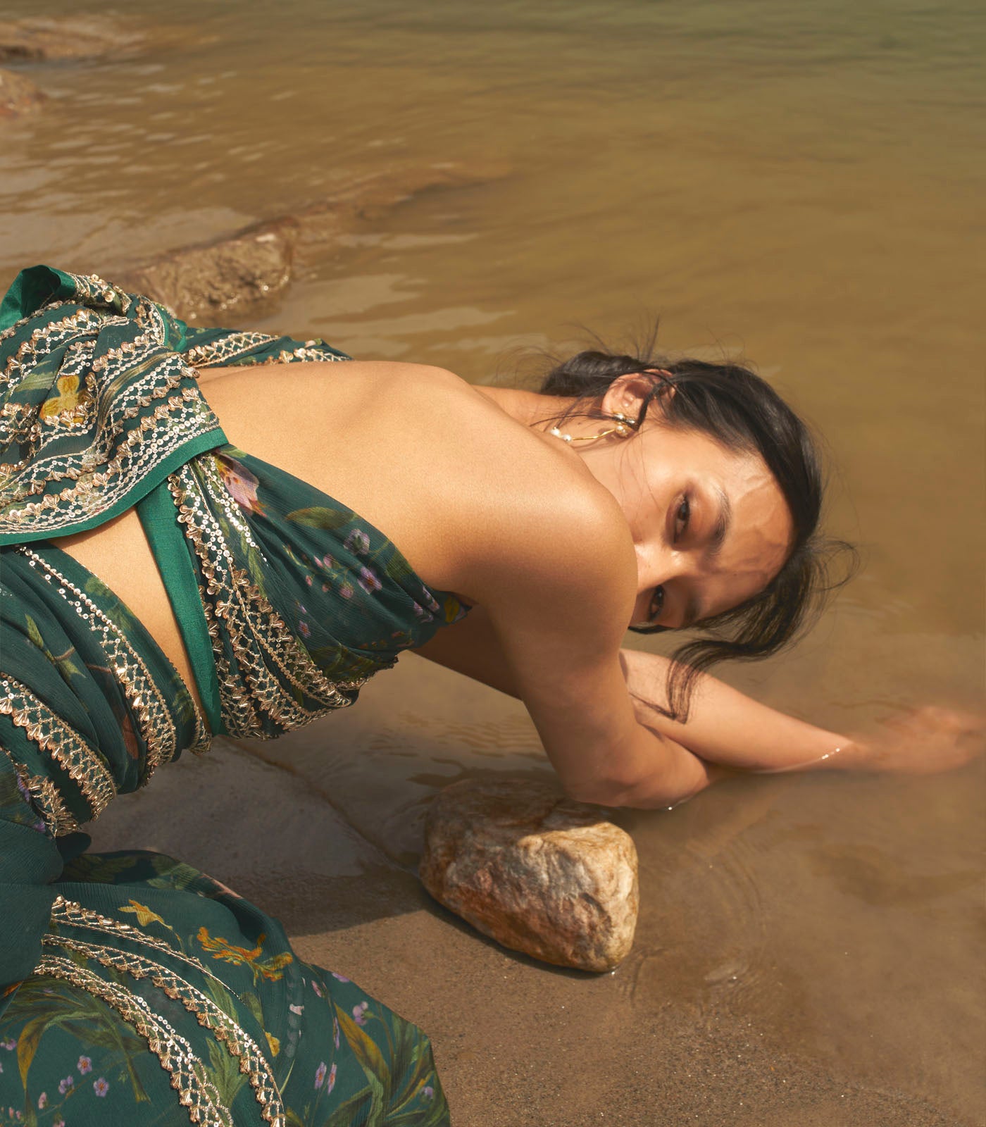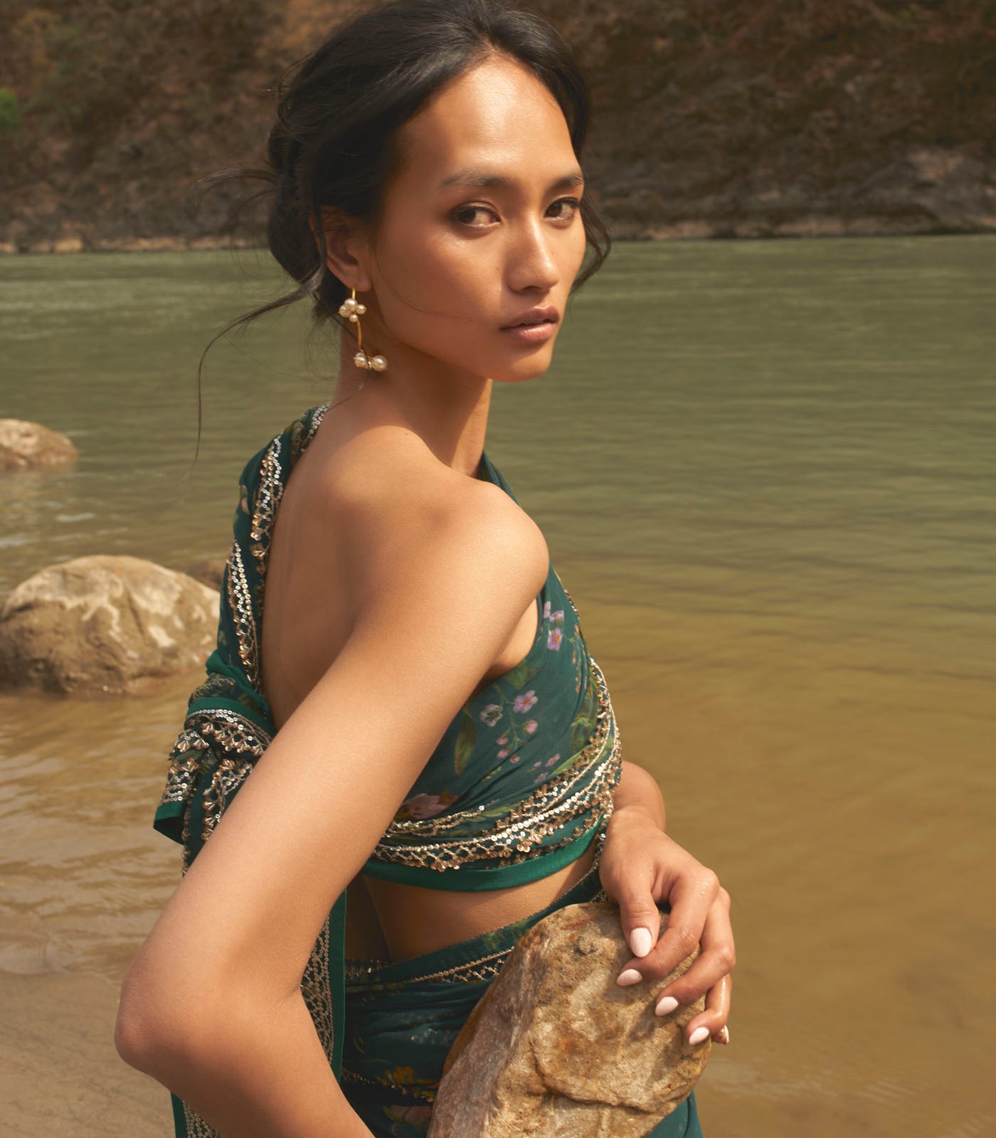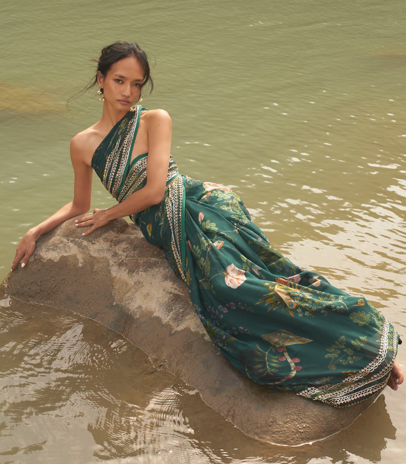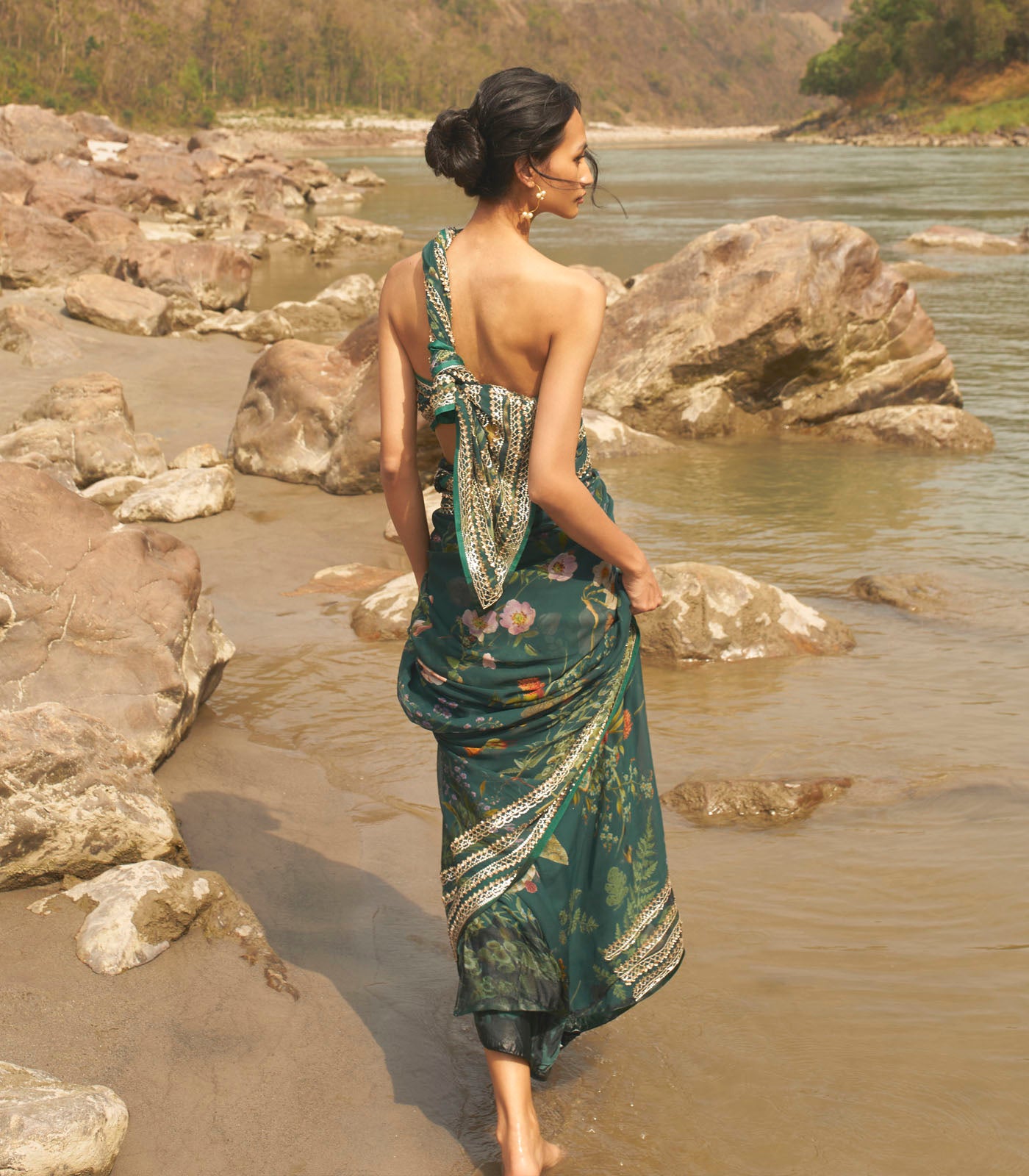 DARK GREEN PRINTED CHIFFON SEQUIN BORDER SAREE WITH UNSTITCHED BLOUSE FABRIC WITH EMBROIDERY ON SLEEVES.