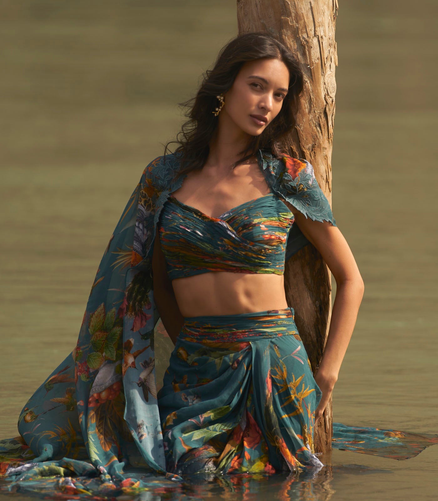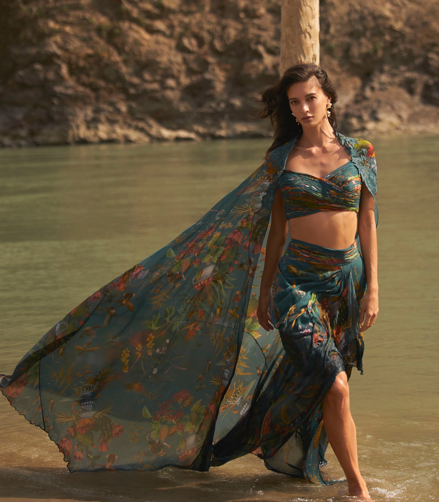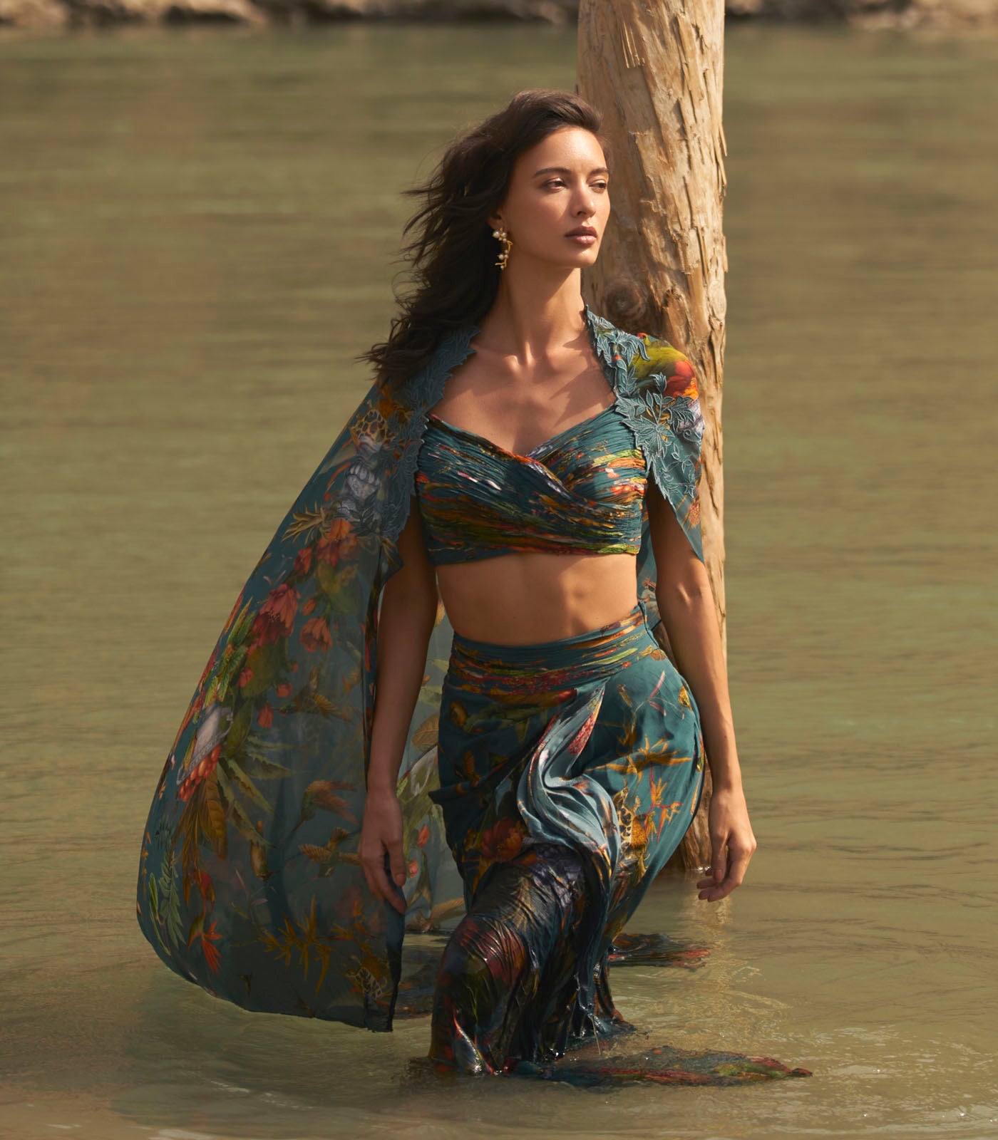 DARK TEAL CHIFFON RUCHED CROP TOP PAIRED WITH DRAPE SKIRT AND CAPE