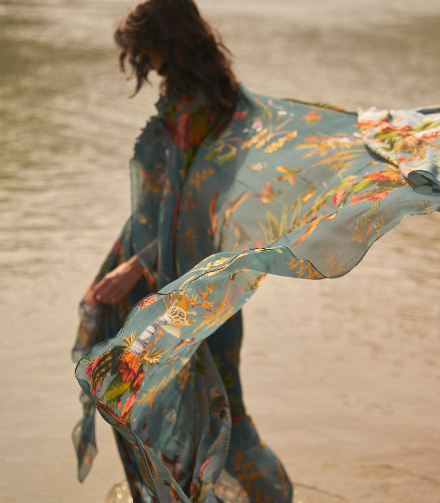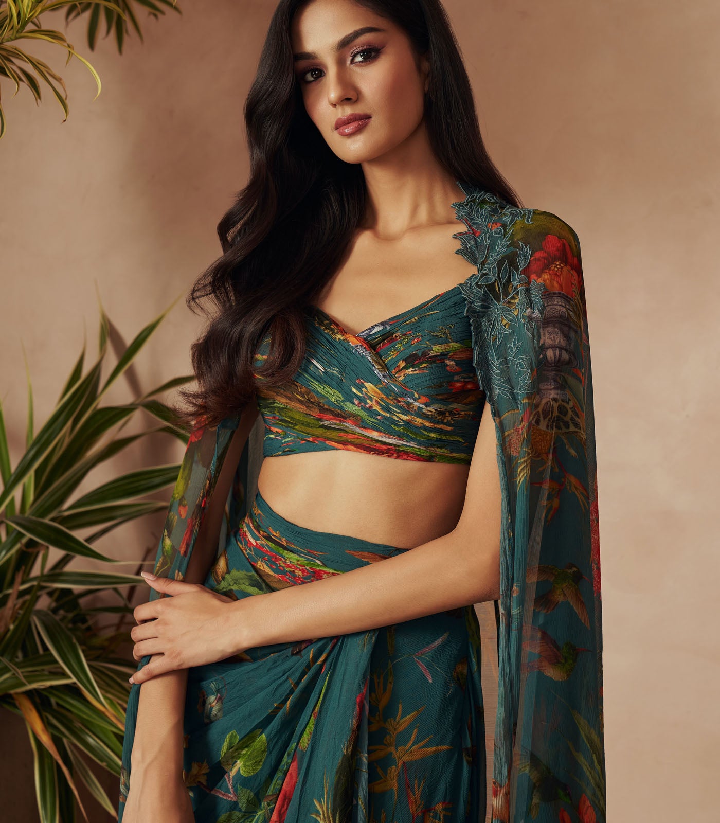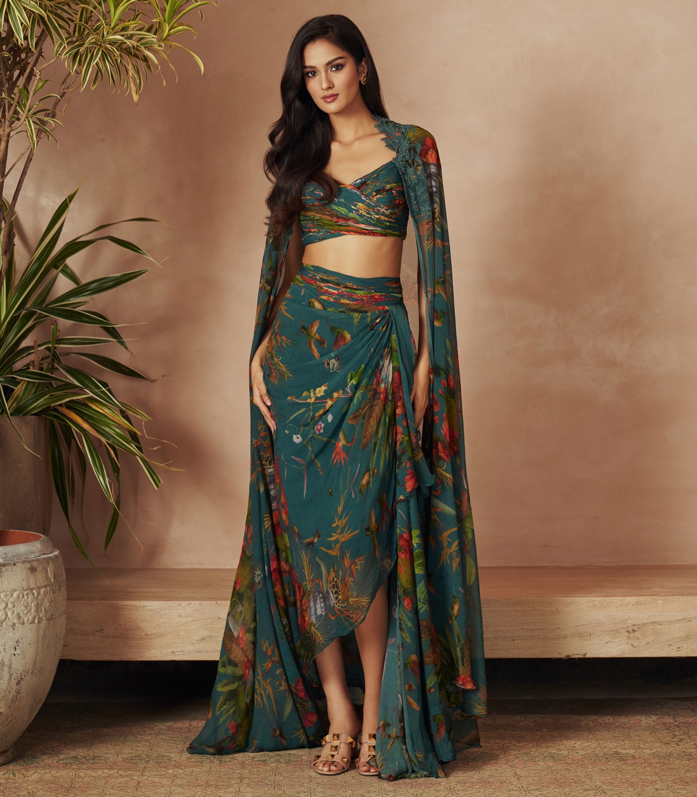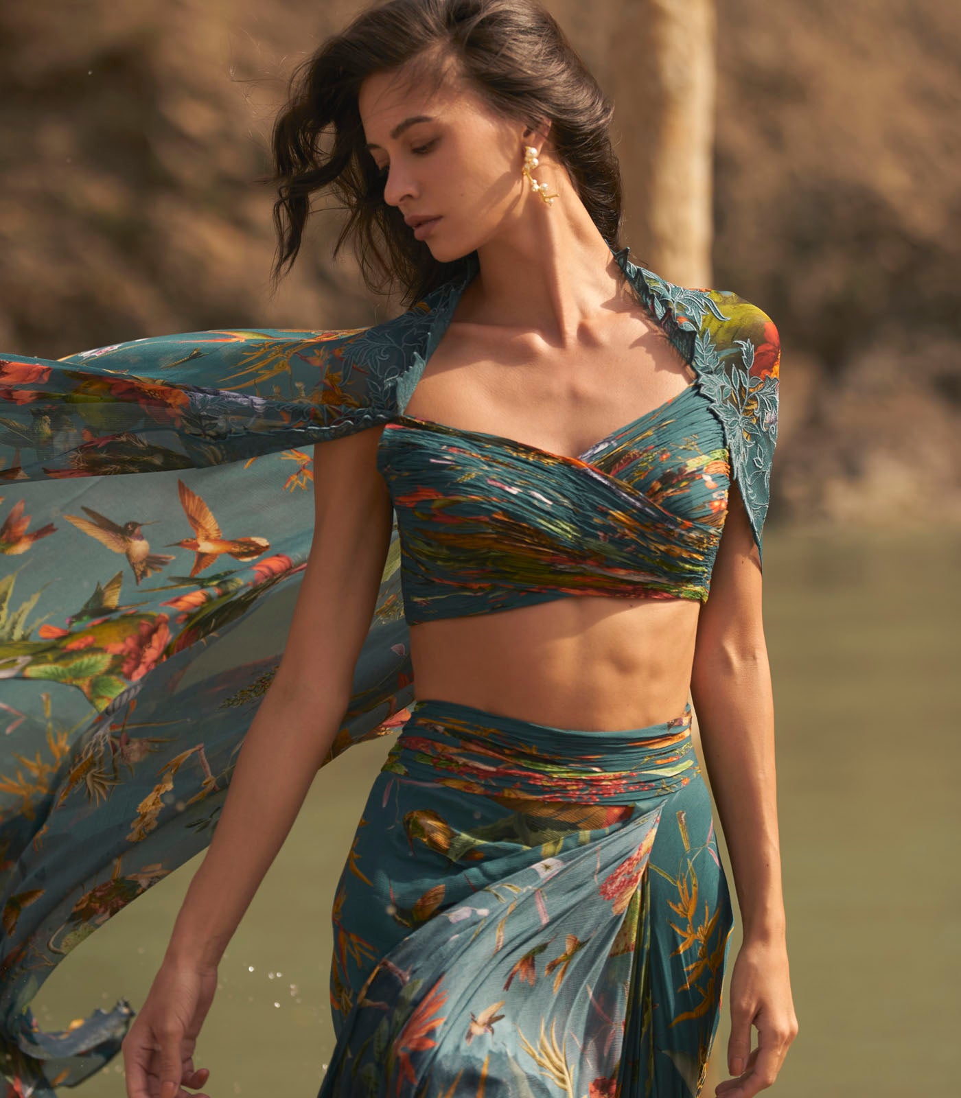 DARK TEAL CHIFFON RUCHED CROP TOP PAIRED WITH DRAPE SKIRT AND CAPE