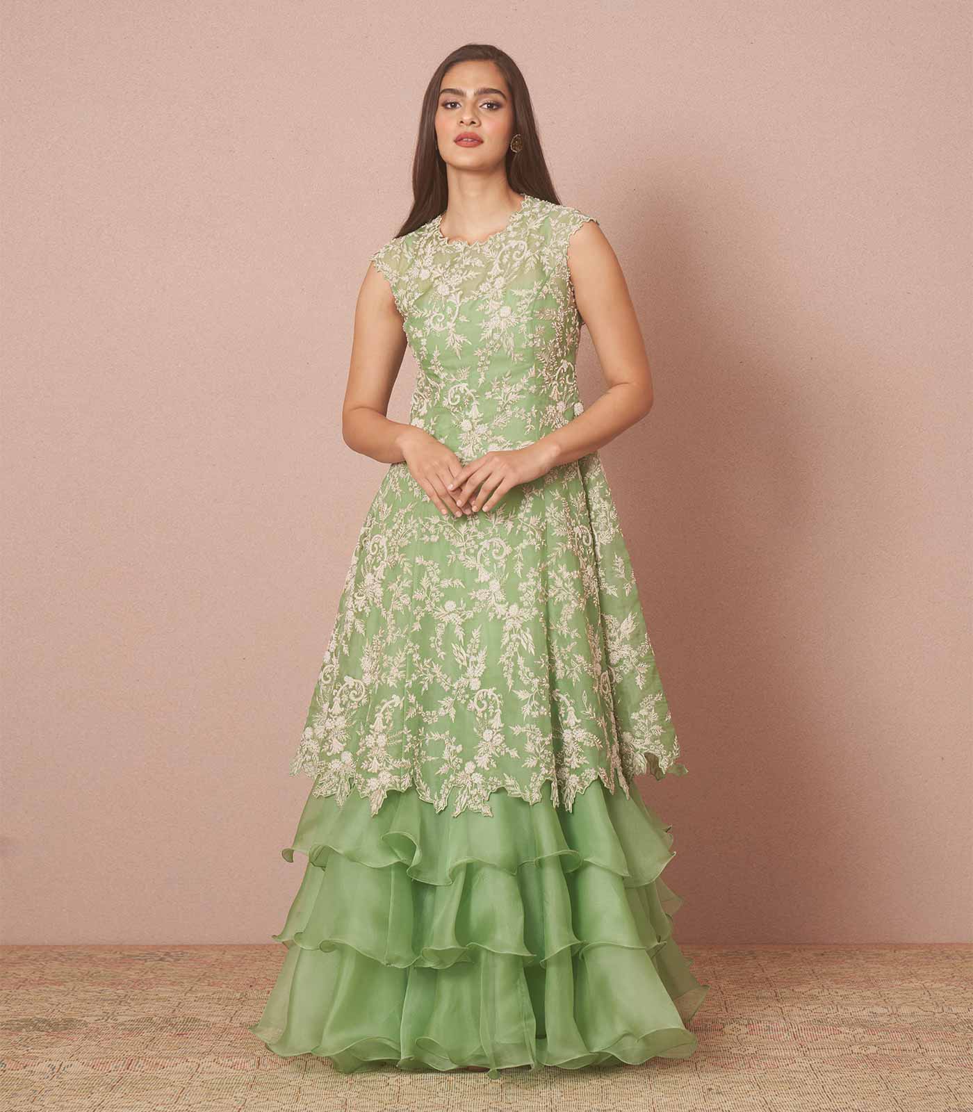 Like the lively beauty of a still pond, our sea green heavy embroidered cutwork kurta is perfected with pearl work and accompanies a pure crepe and organza layered ruffle slip dress.