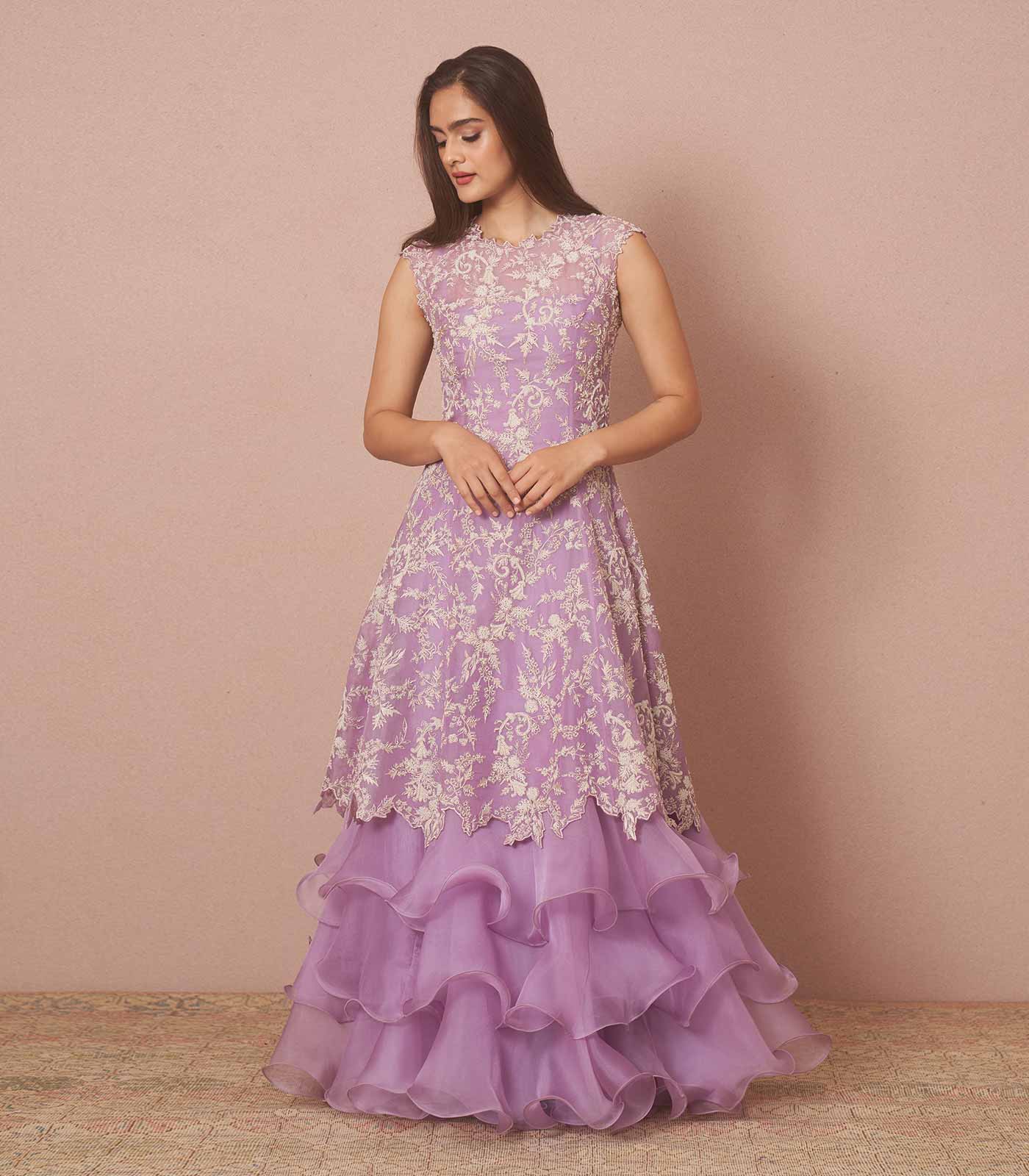 An emblem of the sweetest lullabies, our lavender 'Defne' ensemble comes with a pearl embroidered organza cutwork kurta paired with a pure crepe and organza layered ruffle slip dress.
