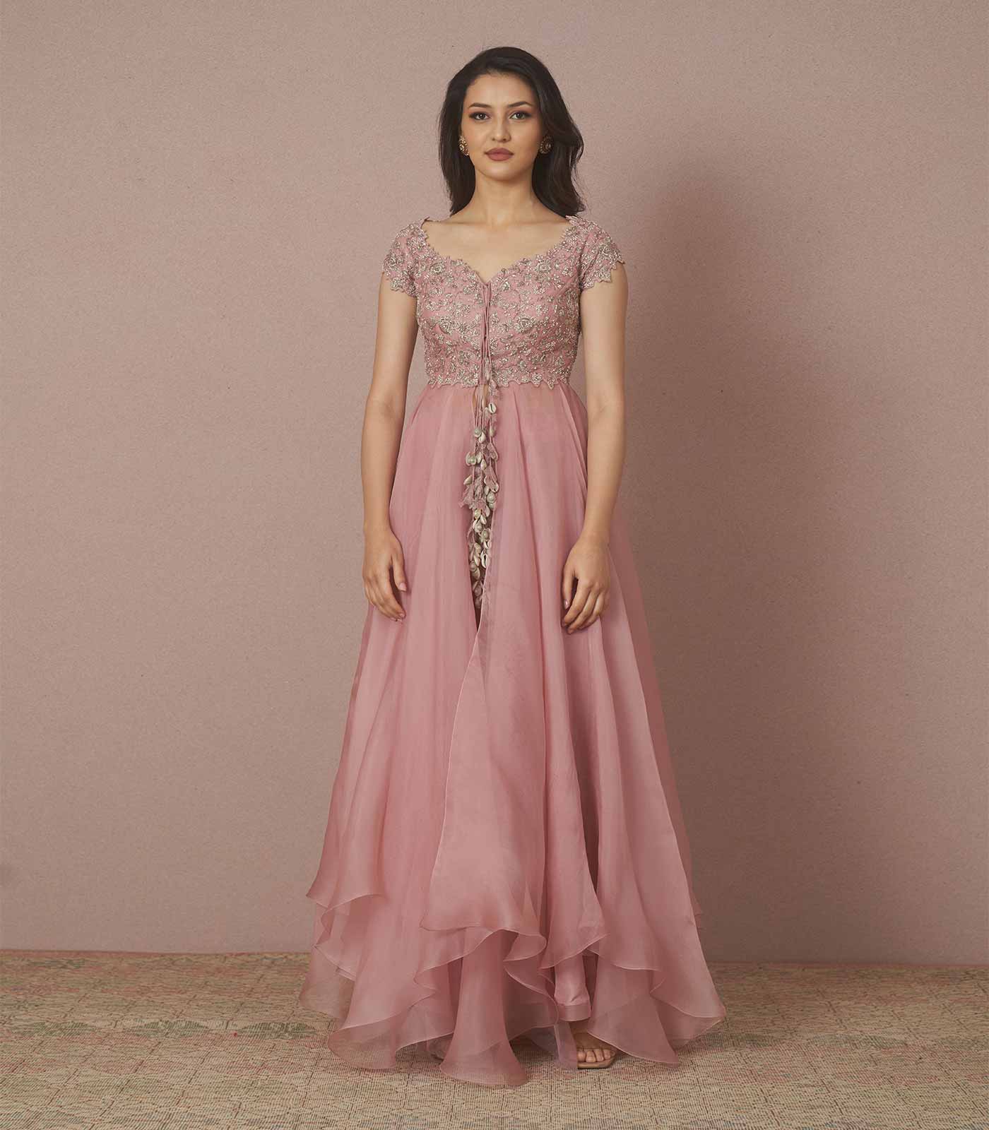 Shining with the luster of a red moon night, our 'Heather' co-ords comes with a pink organza front open jacket style kurta charming with shell tassels and wide leg flared pants completing the whole look.