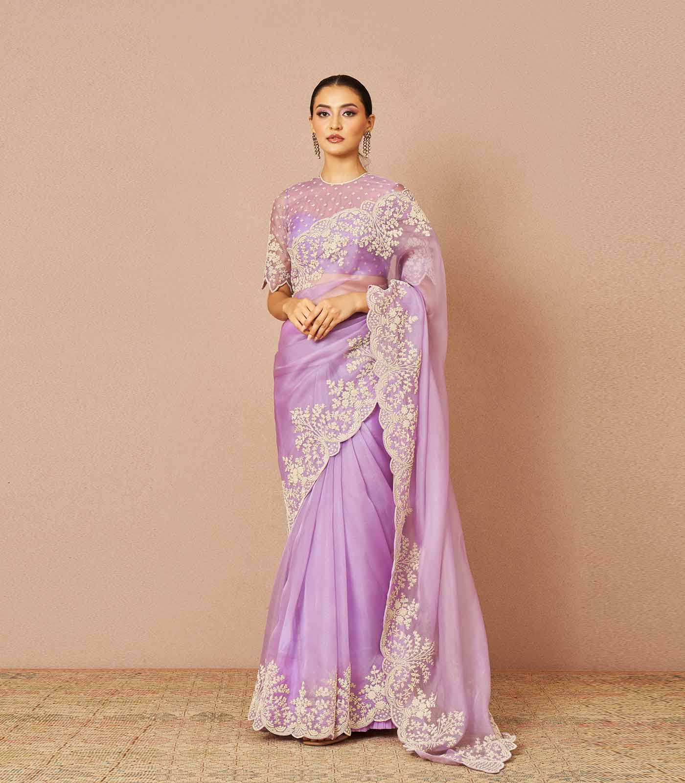 One made for a lovely evening, our 'Helen' organza saree set with blouse shall set you apart with its pearl cutwork and lavendar hue.