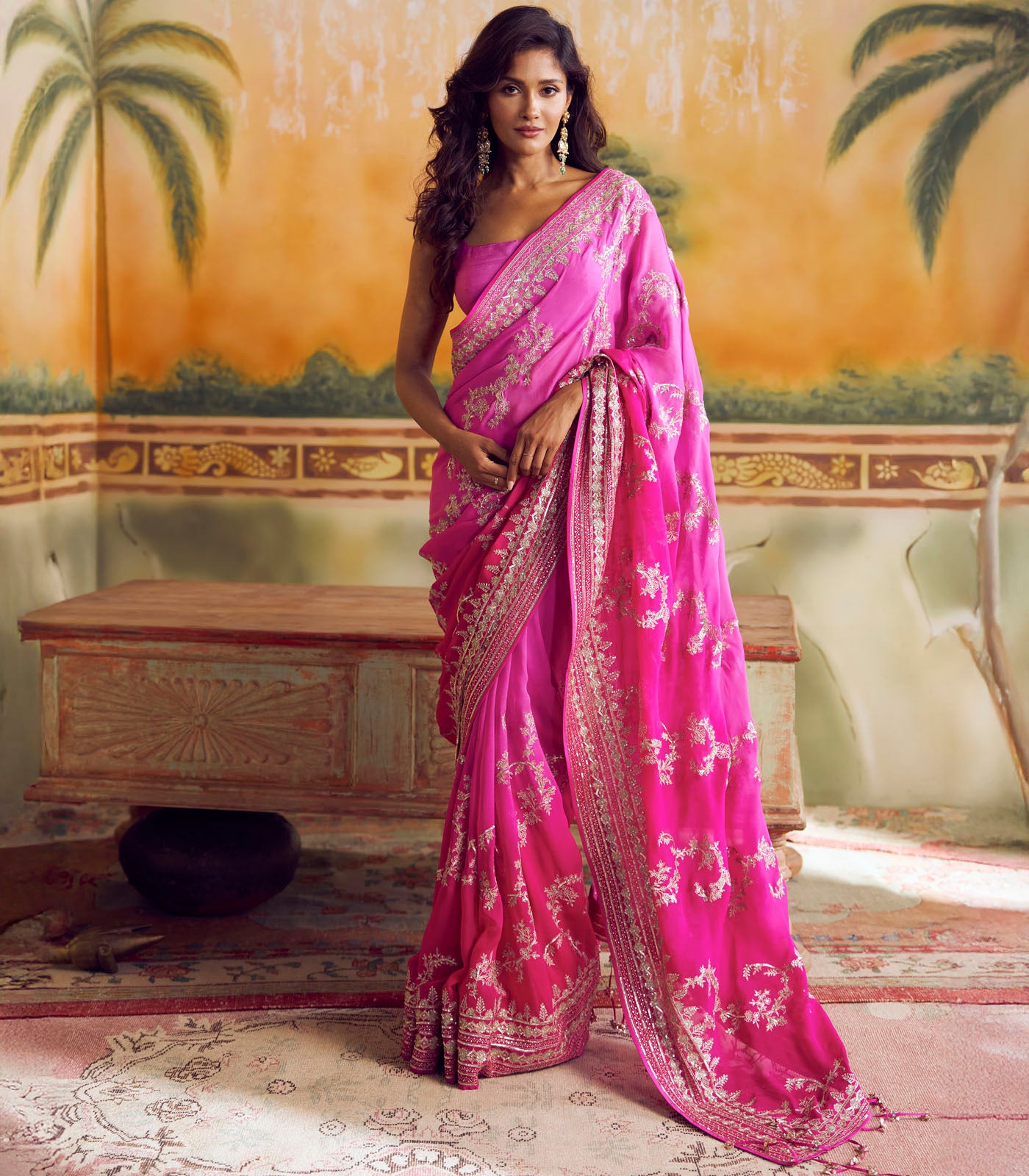 Hot Pink And Pink Ombre Aari Leheriya Saree Set