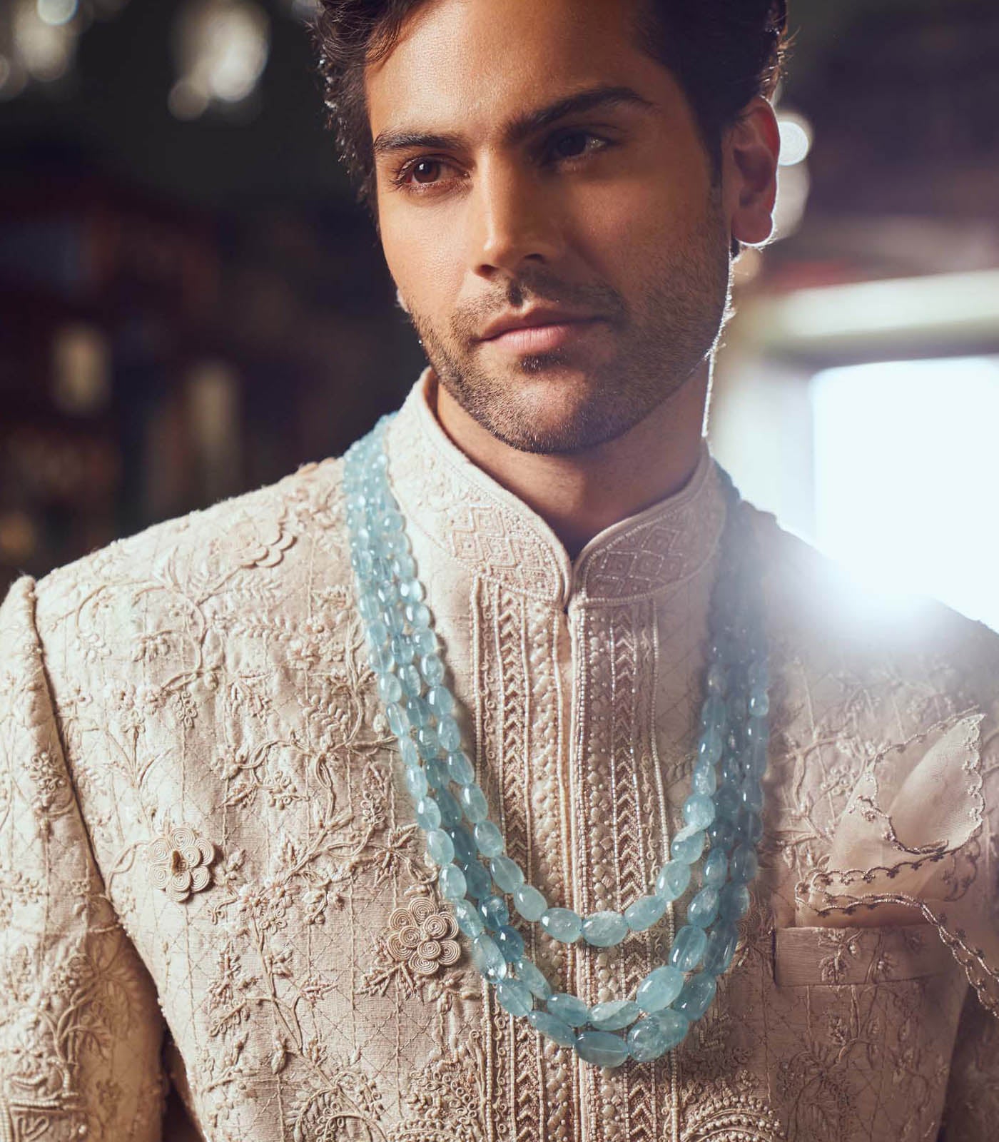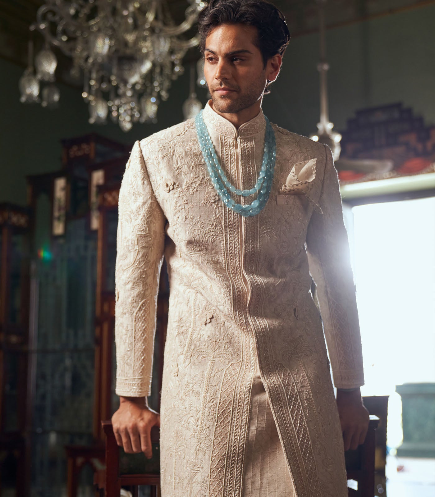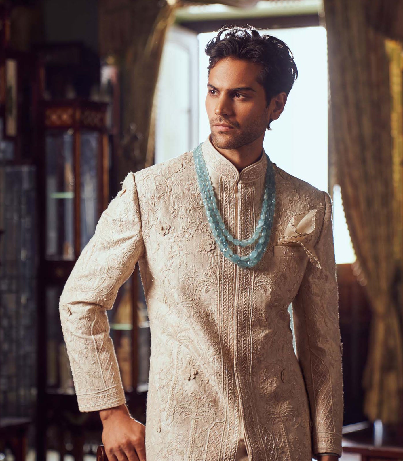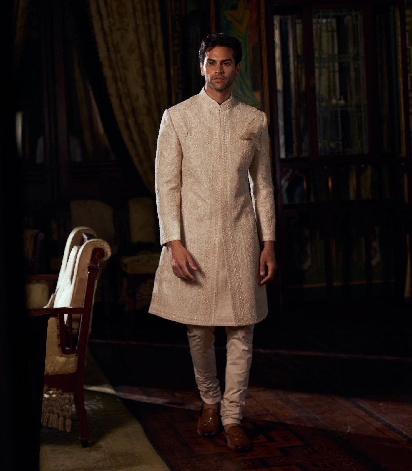 IVORY RAW SILK 3D PALM CREEPER SHERWANI SET