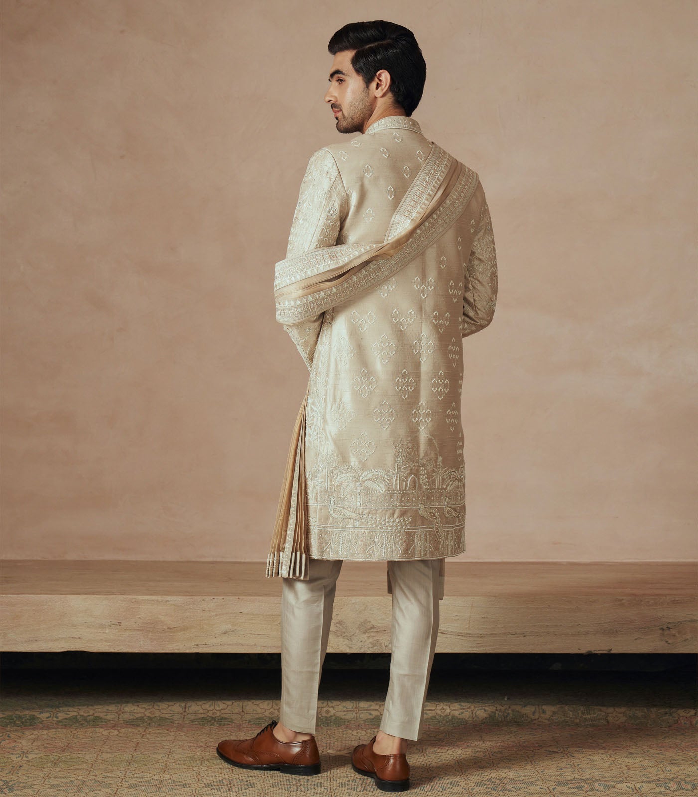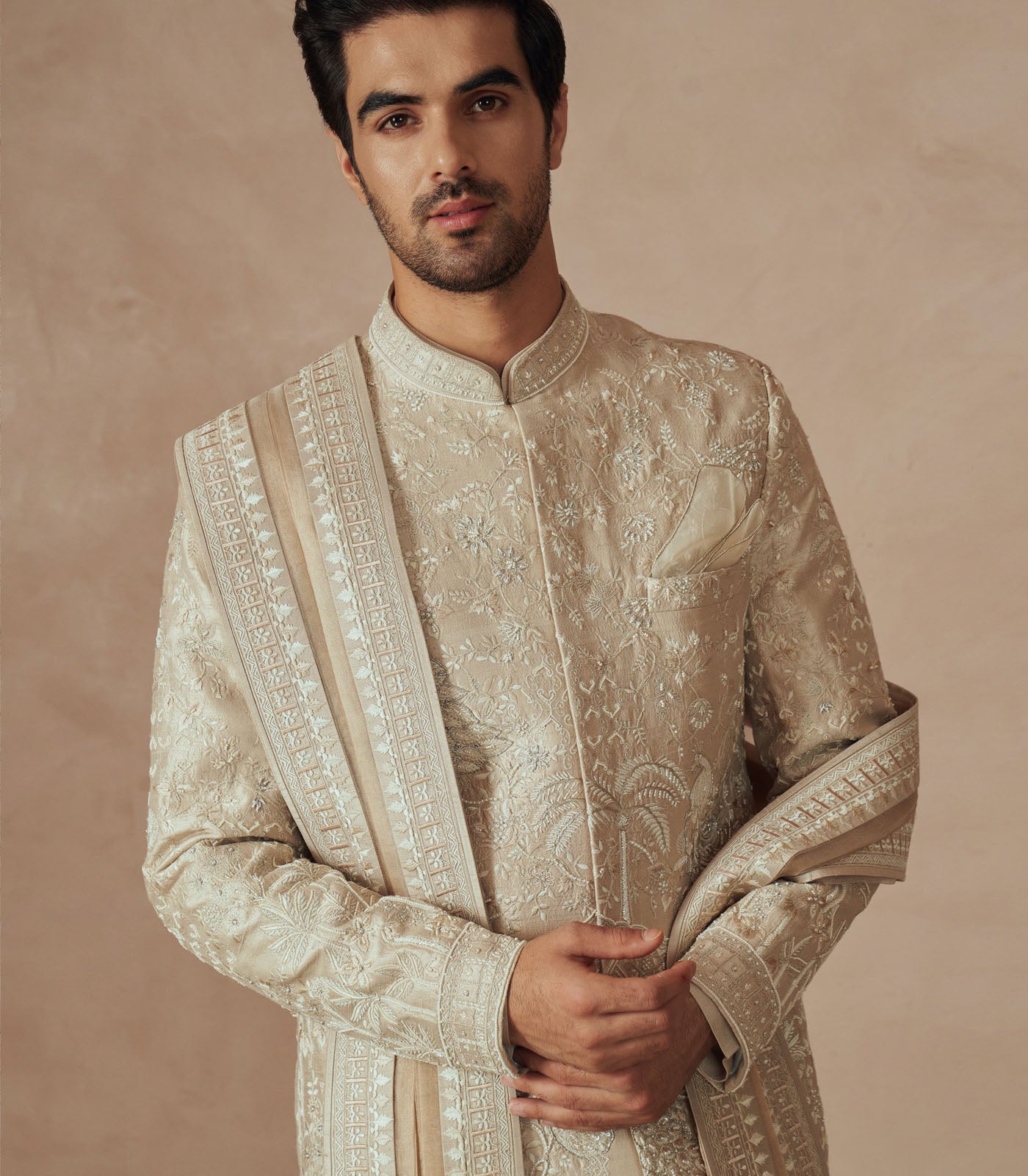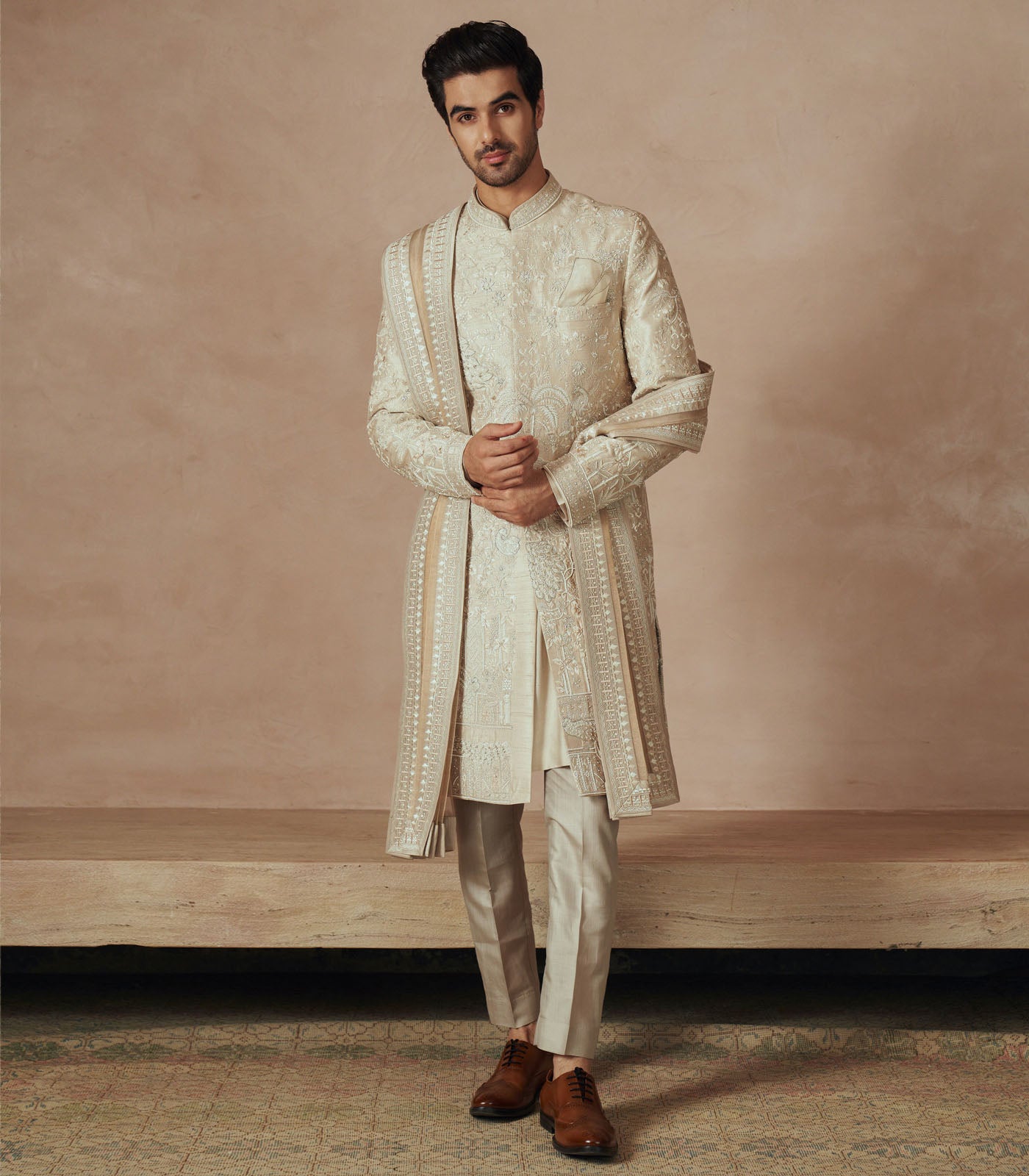 MATERIAL: RAW SILK SHERWANI + COTTON BLEND KURTA + TUSSAR SILK TROUSER + DUPION SILK DUPATTA + ORGANZA POCKET SQUARE