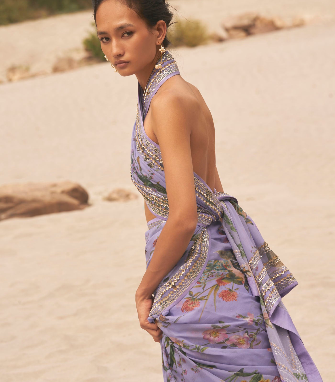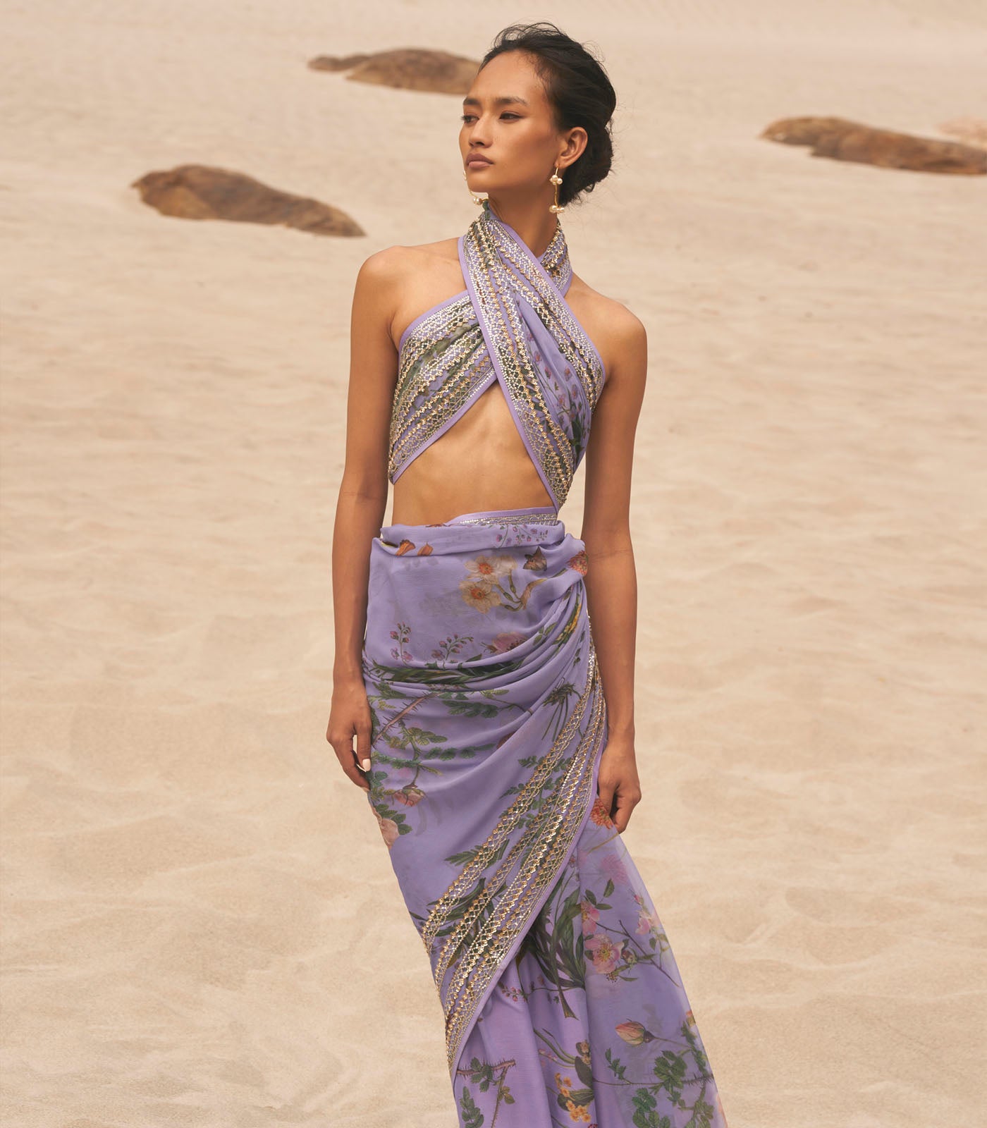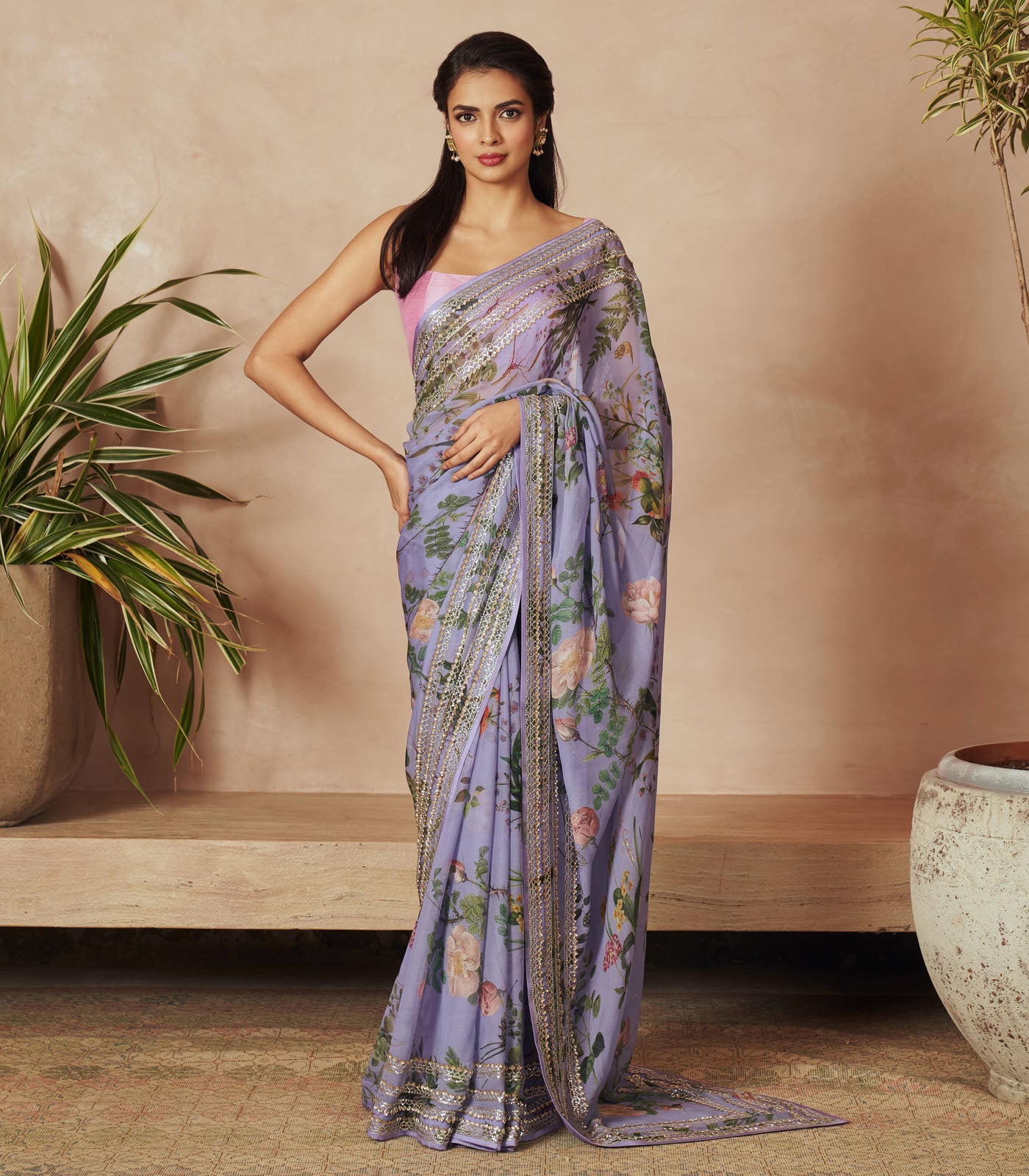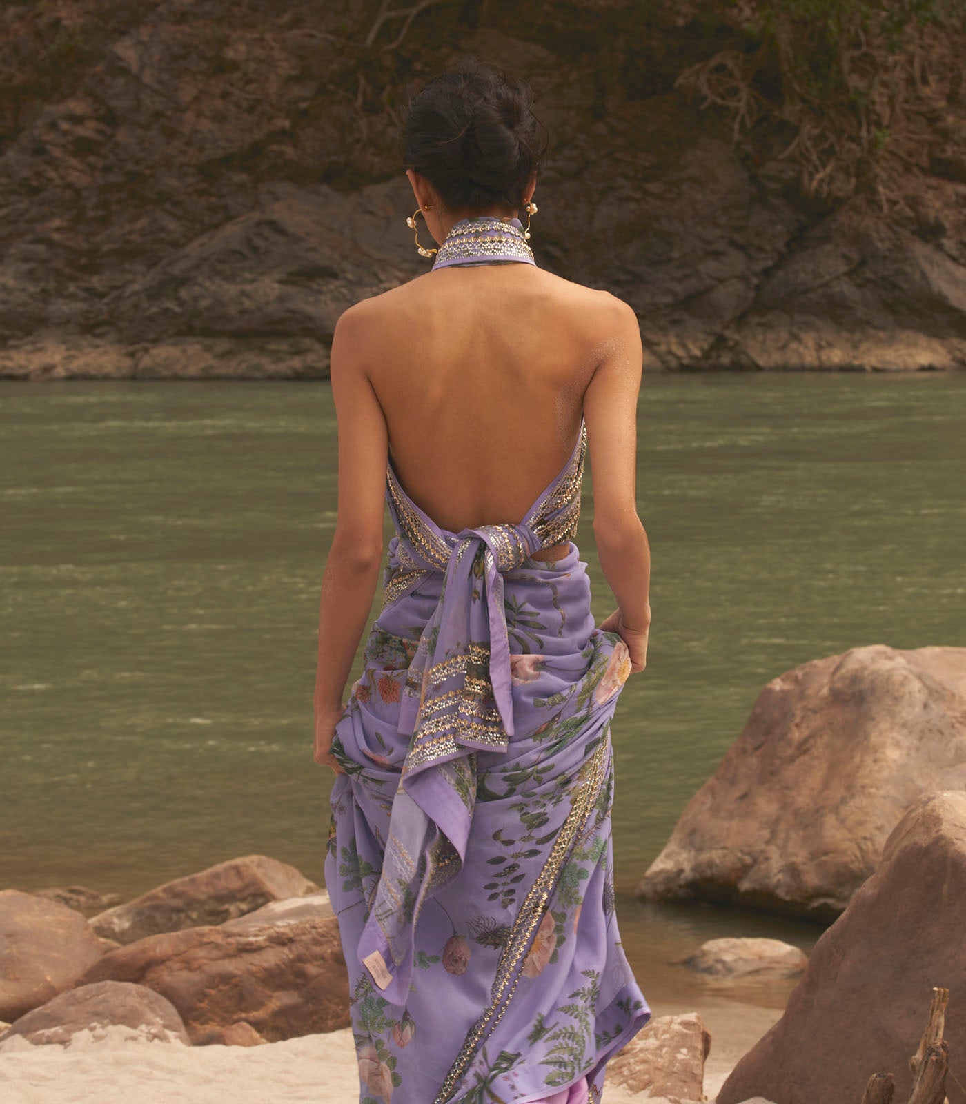 LAVENDER PRINTED CHIFFON 4 LINES SEQUENCE BORDER SAREE SET