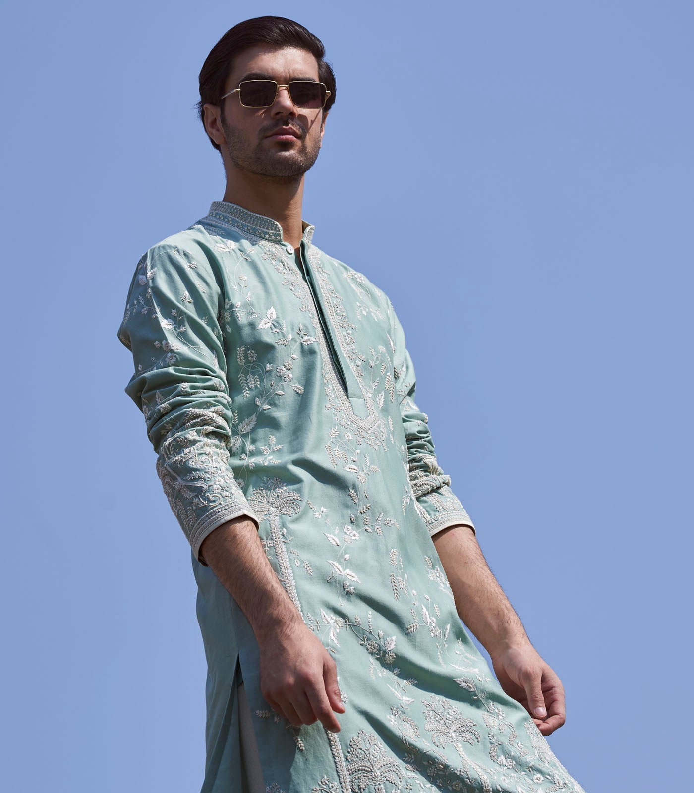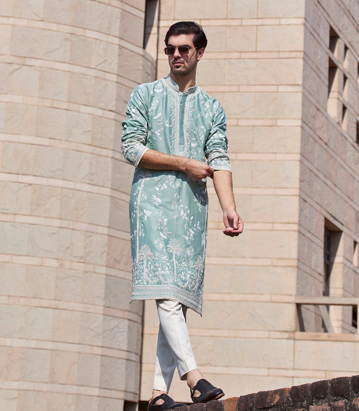 MINT GREEN CHANDERI LONG PALM TREE KURTA SET