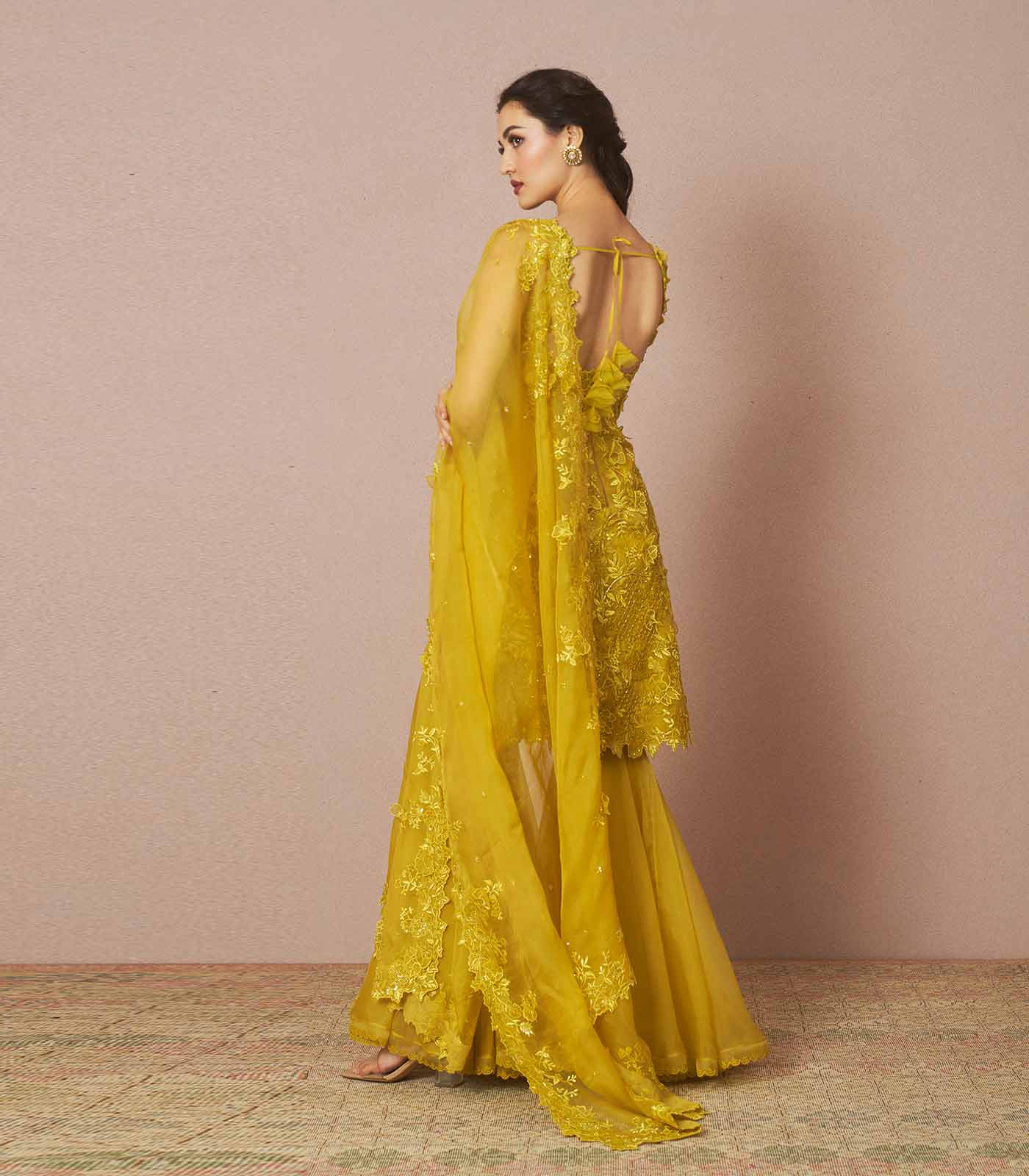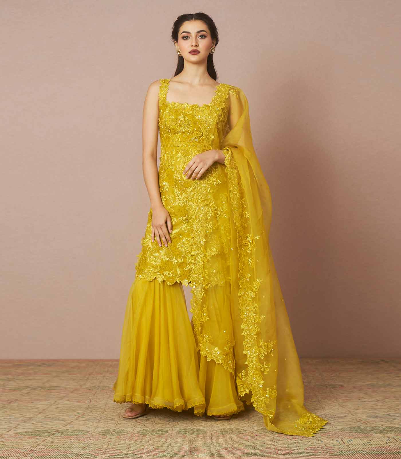 Stiched with sunshine in its palm, this 'Mirabelle' sharara set comes with a yellow organza Kurta embellished with cutdana, sequins, threadwork, and stunning 3d embroidered cutwork. It is further accompanied by a dupatta and sharara-style pants to complete the look.