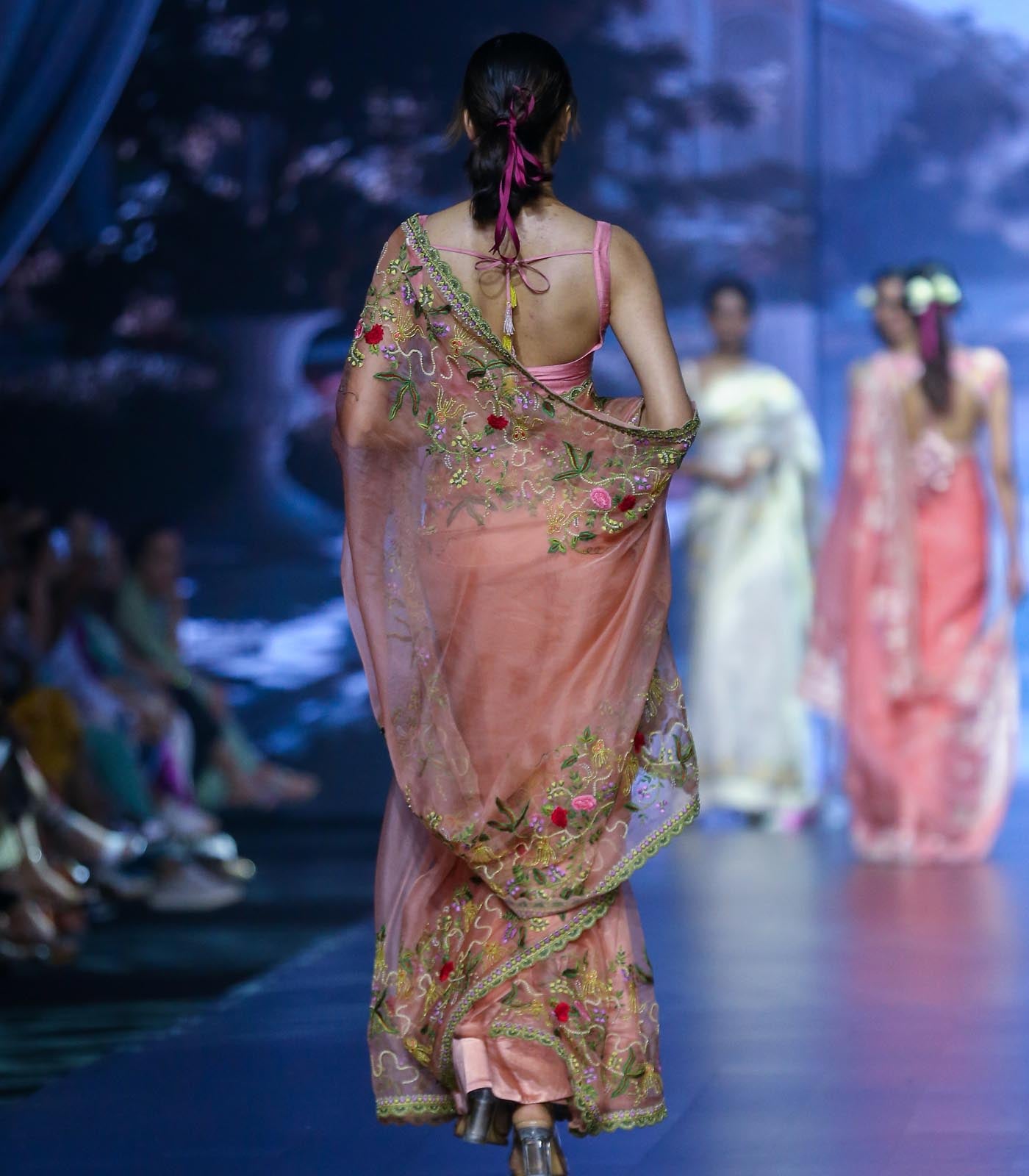 POWDER BLUE ORGANZA RED AND YELLOW THREAD EMN "NAADIM" SAREE AND BLOUSE
