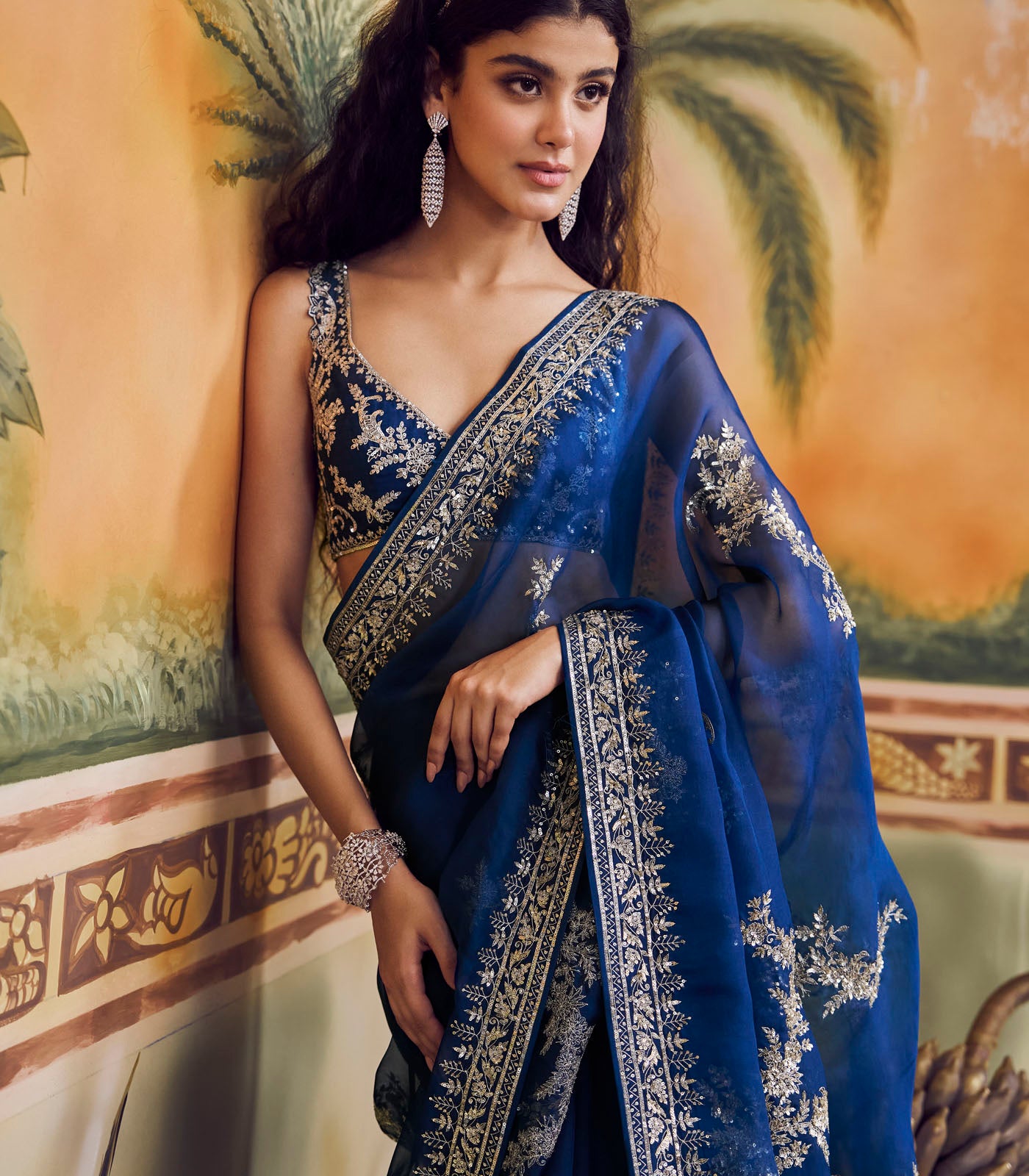 Navy Blue Aari Guchha Border Saree Set