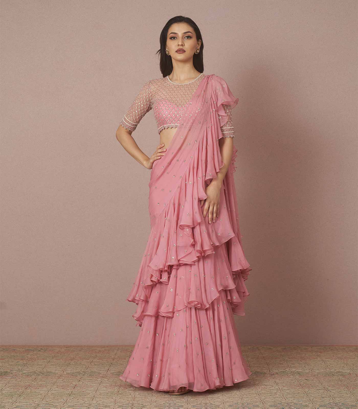 Our staple Nazia embroidered blouse in pink is adorned with cutdana embroidery in a corset lining pattern paired with chiffon saree set with able stitched ruffles.