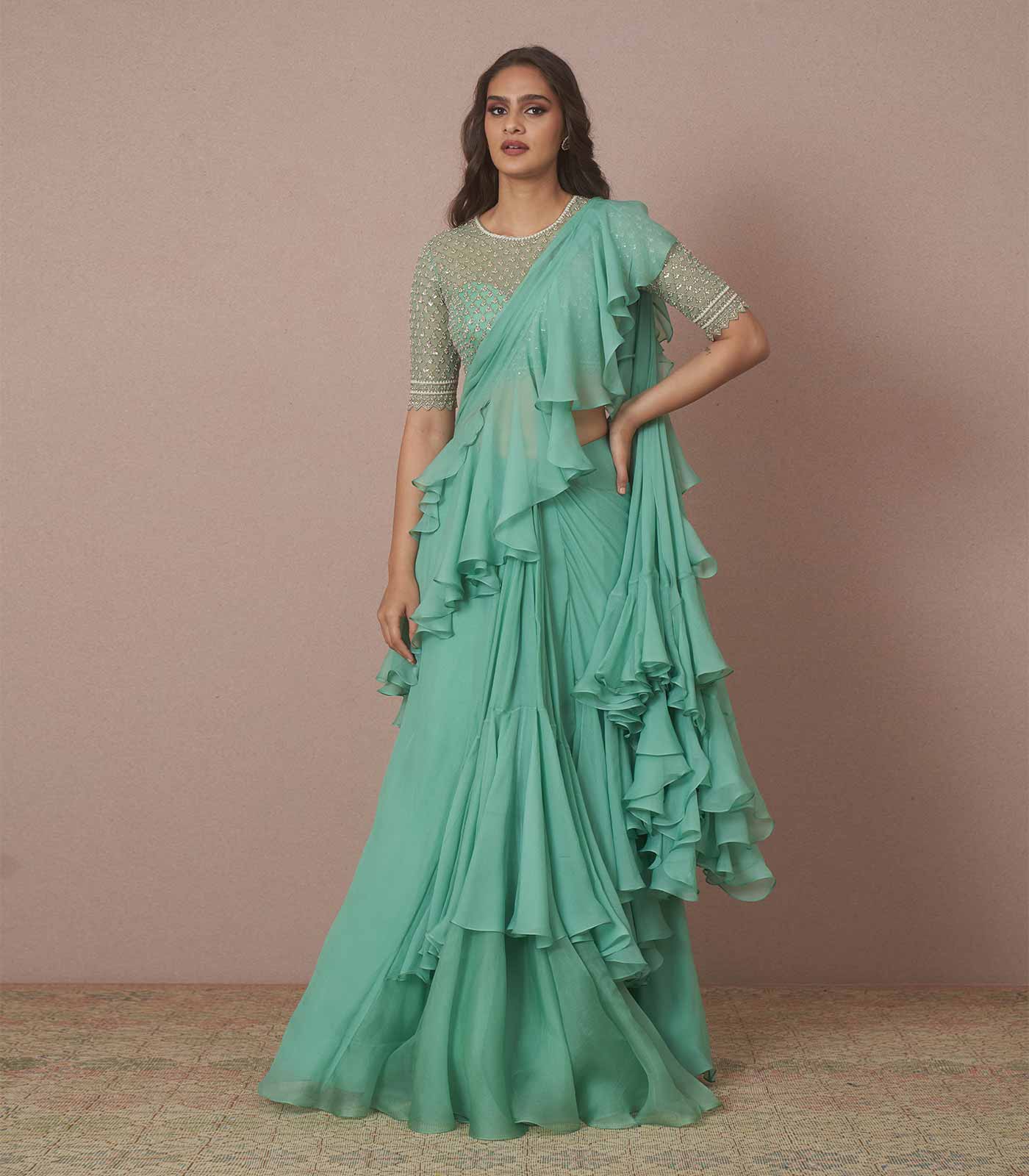 Our staple Nazia embroidered blouse in teal blue is adorned with cutdana embroidery in a corset lining pattern paired with chiffon saree set with able stitched ruffles.