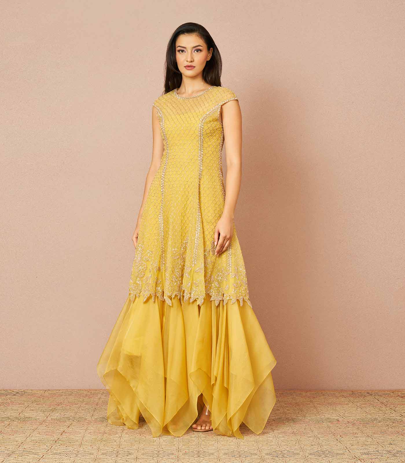 A yellow co-ord set made to enhance your natural beauty, with matching cutwork cutdana, embroidered net kurta with crepe and organza ruffle layered slip.