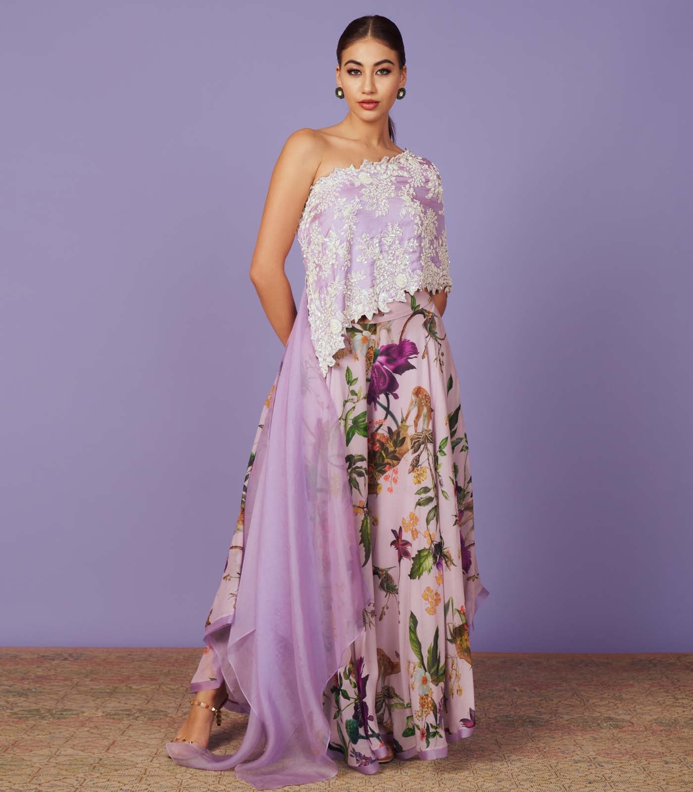 LAVENDER ORGANZA PEARL WORK ONE SHOULDER CAPE SET