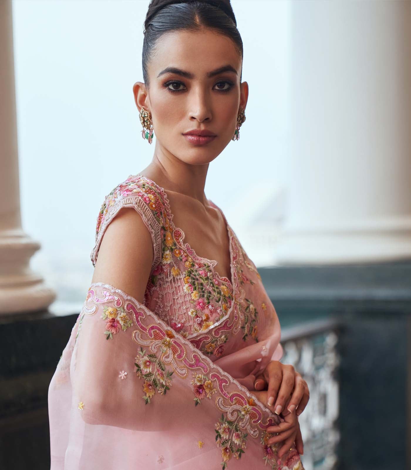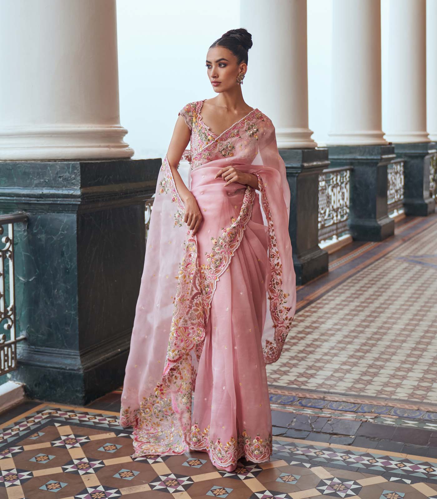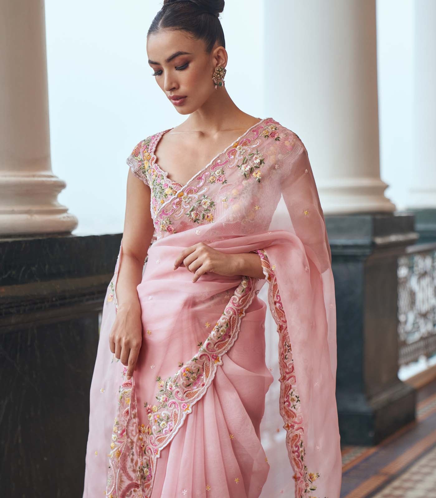 PINK ORGANZA MULTITHREAD FLORAL EMBROIDERED HILITED " ORCHID " SCALLOP CUTWORK SAREE SET