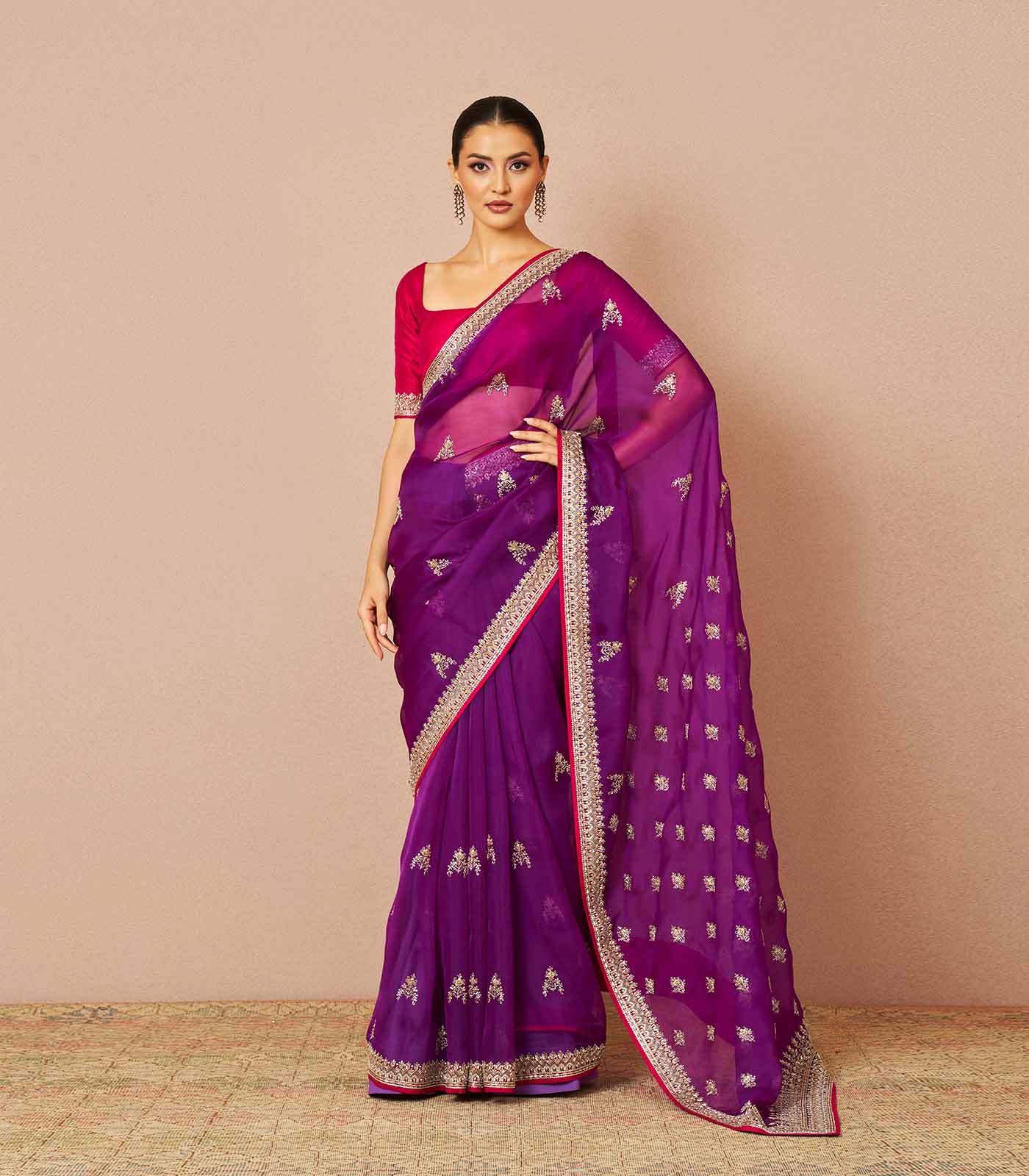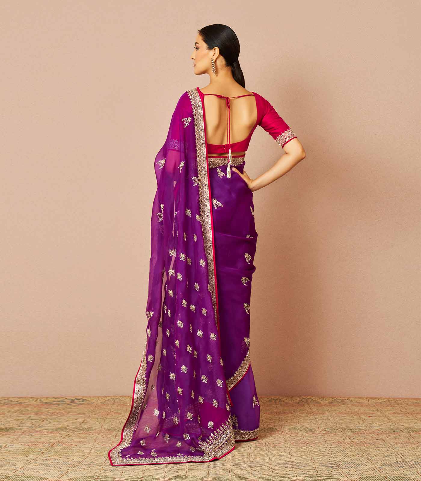 Our 'Pari' purple organza saree set with temple border is made for a beautiful day out. Made with cutdana and pearl embroidery paired with a red raw silk blouse.