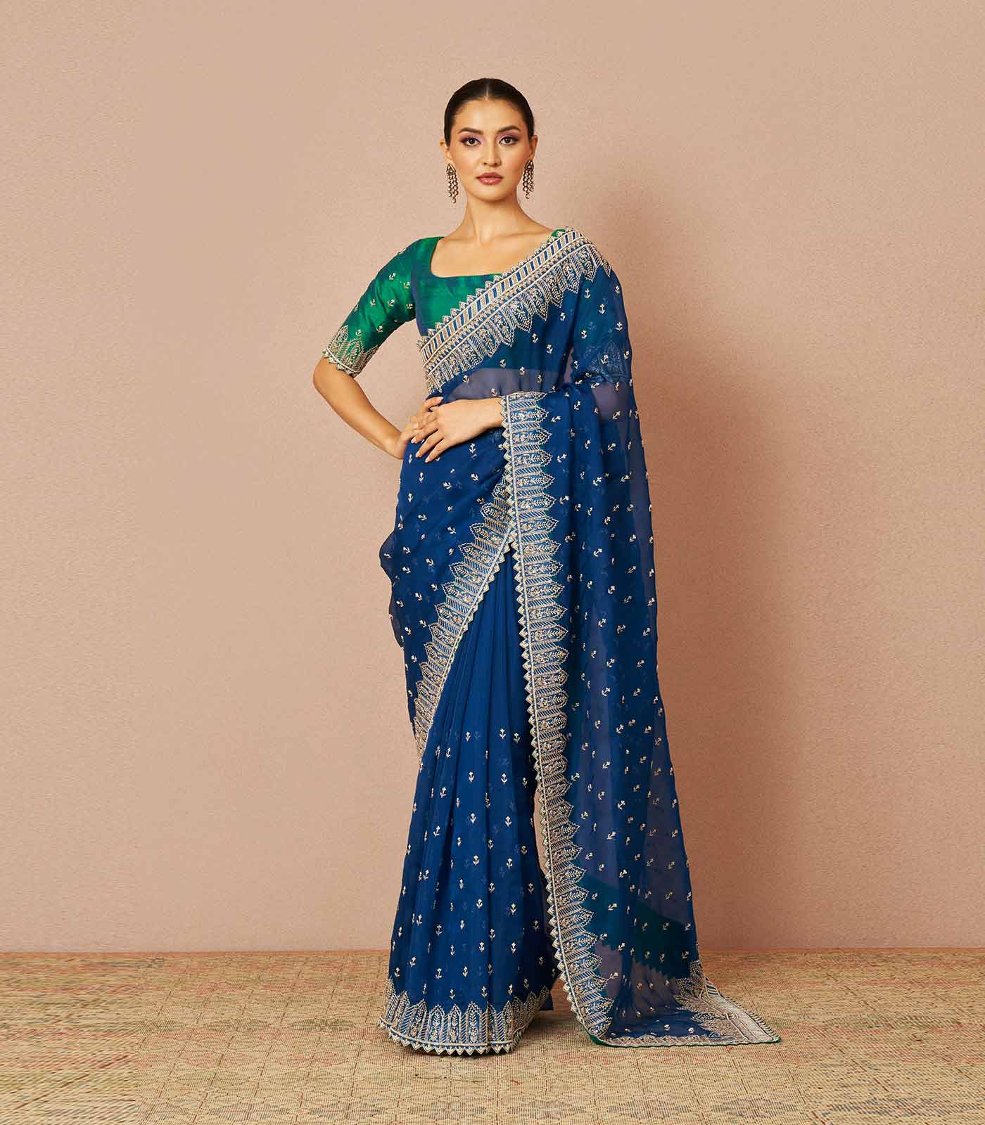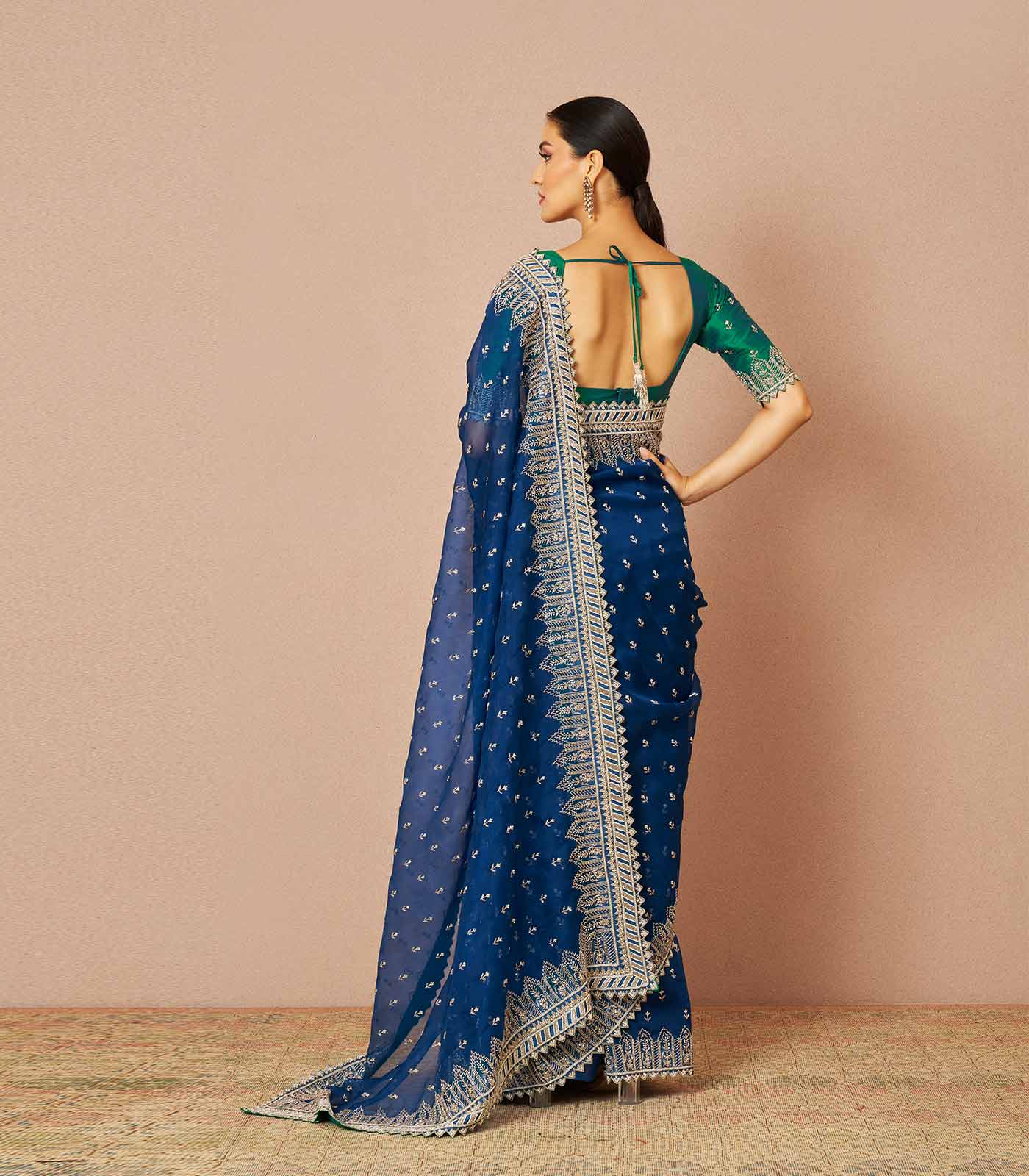 Our 'Pari' navy blue organza saree set with temple border is made for a beautiful day out. Made with cutdana and pearl embroidery paired with a dual-toned green raw silk blouse.