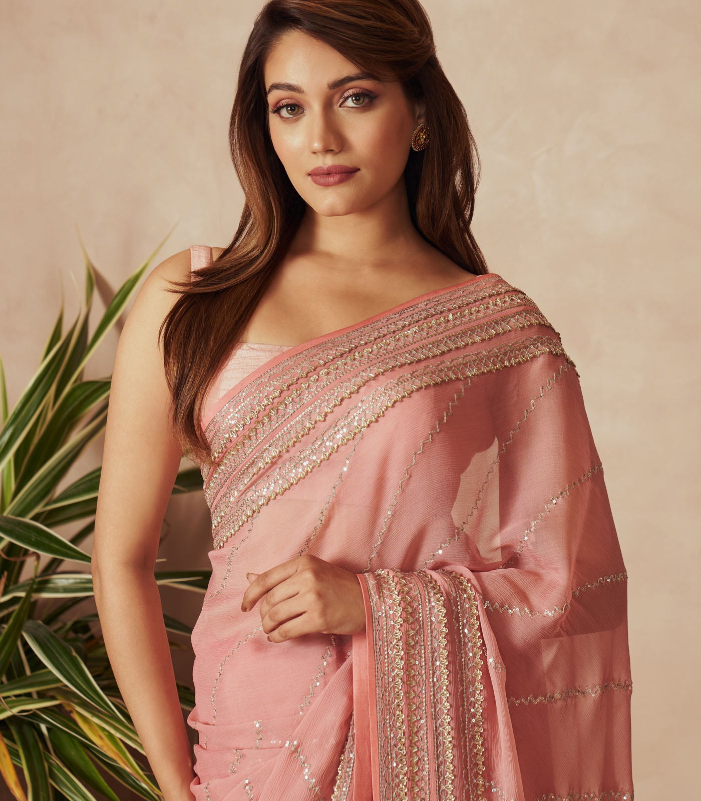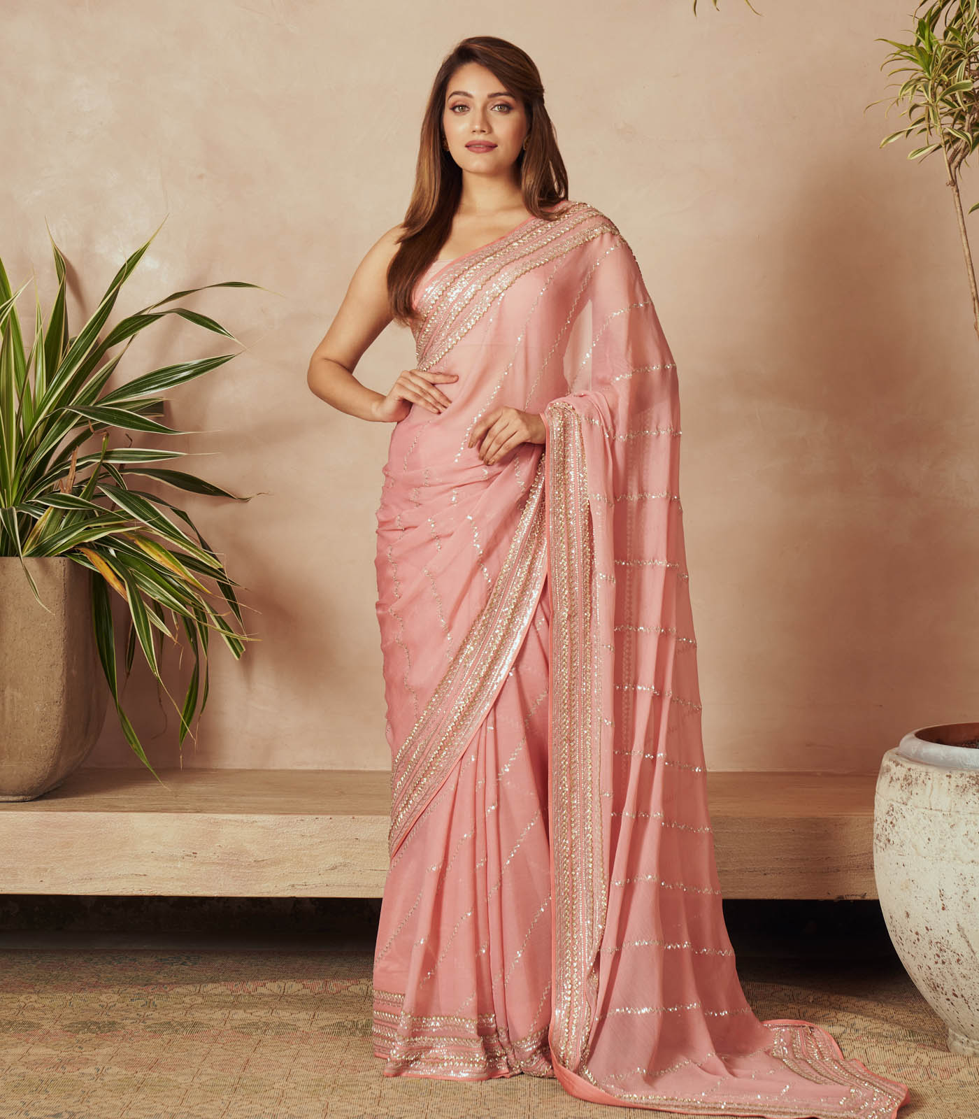 PINK CHIFFON 4 LINE SEQUENCE SAREE WITH BLOUSE