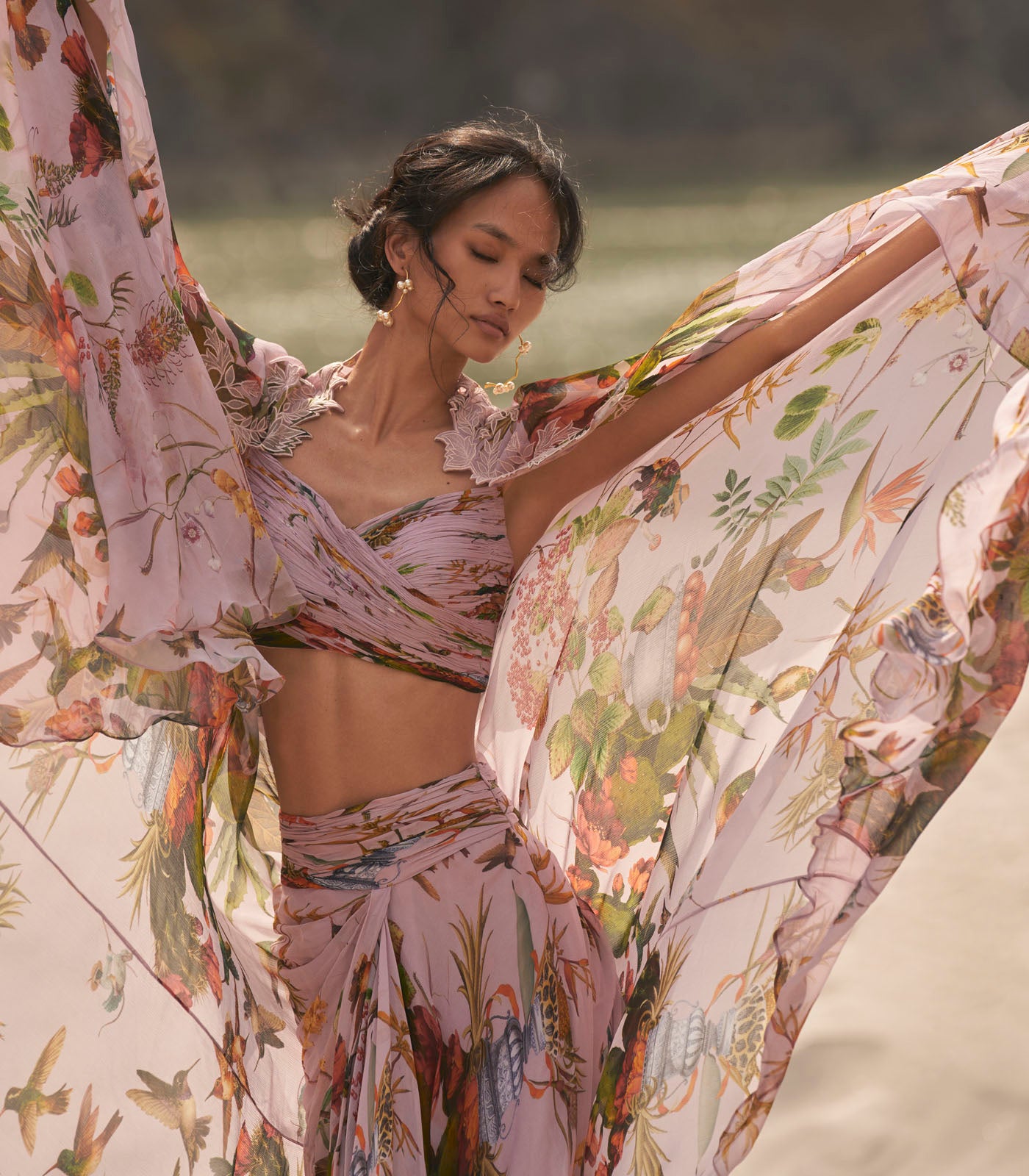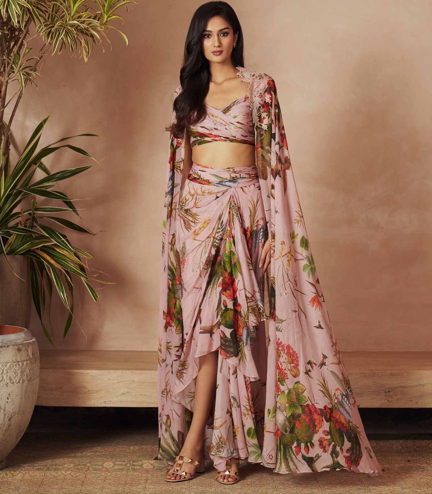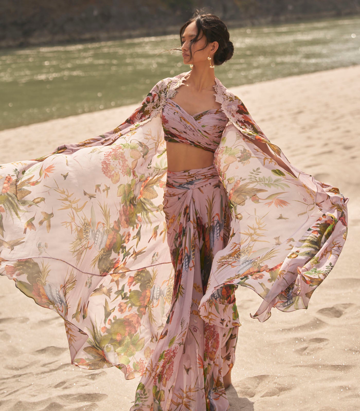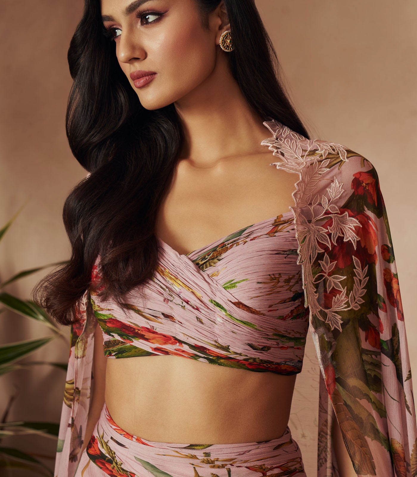 PINK CHIFFON RUCHED CROP TOP PAIRED WITH DRAPE SKIRT AND CAPE