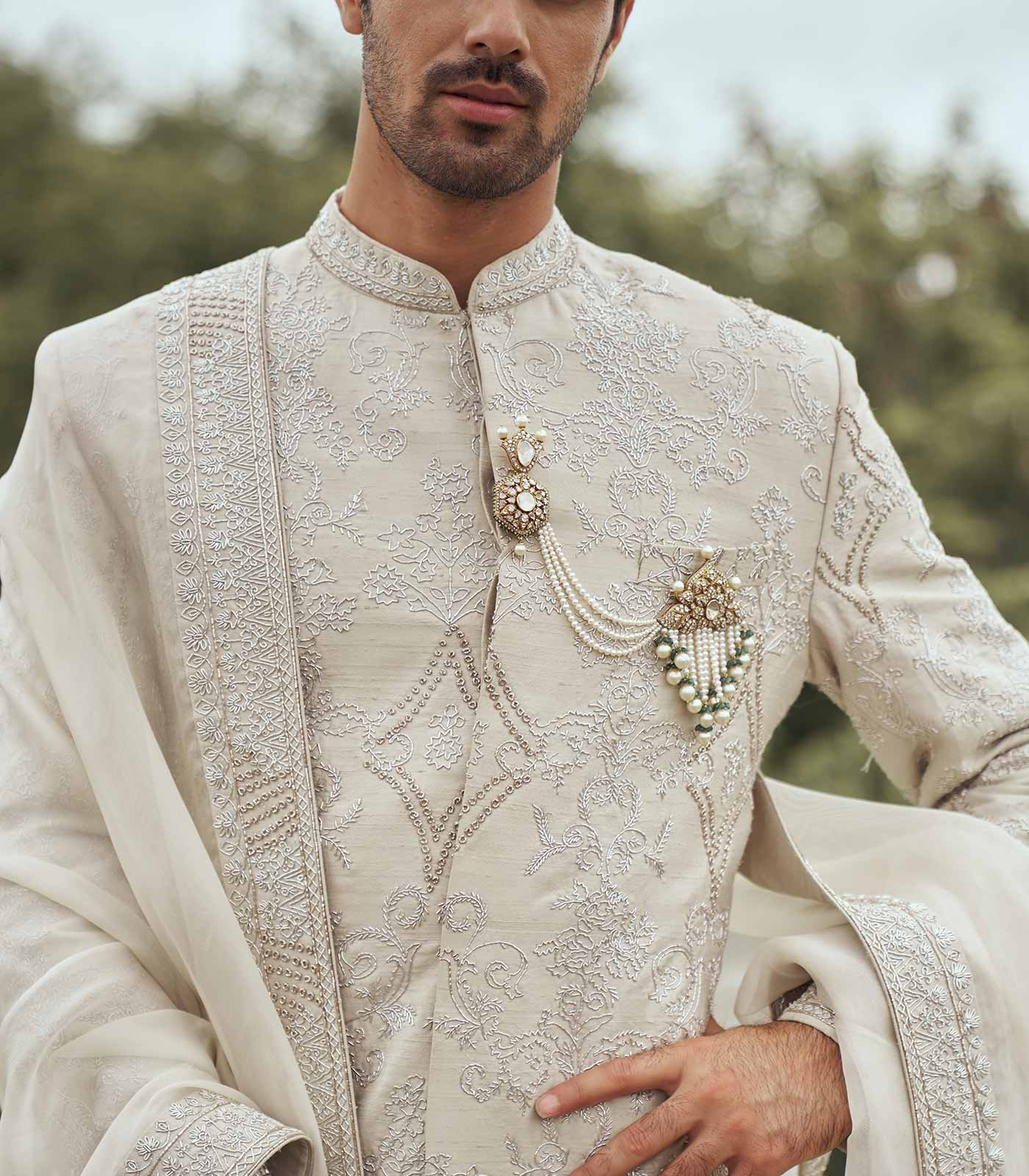 IVORY RAW SILK SAADI VINTAGE SHERWANI SET