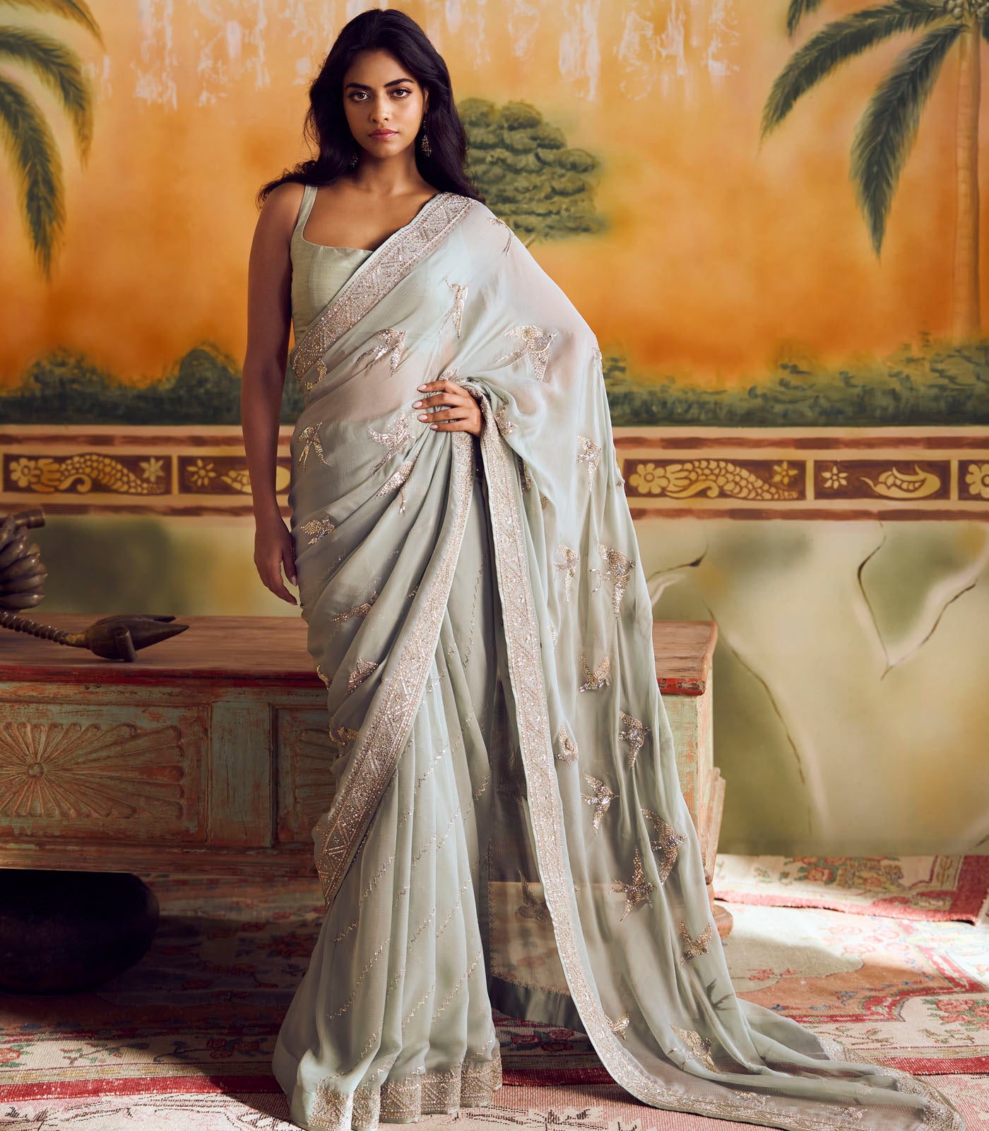 Material: Chiffon saree & Dupion silk blouse fabric only