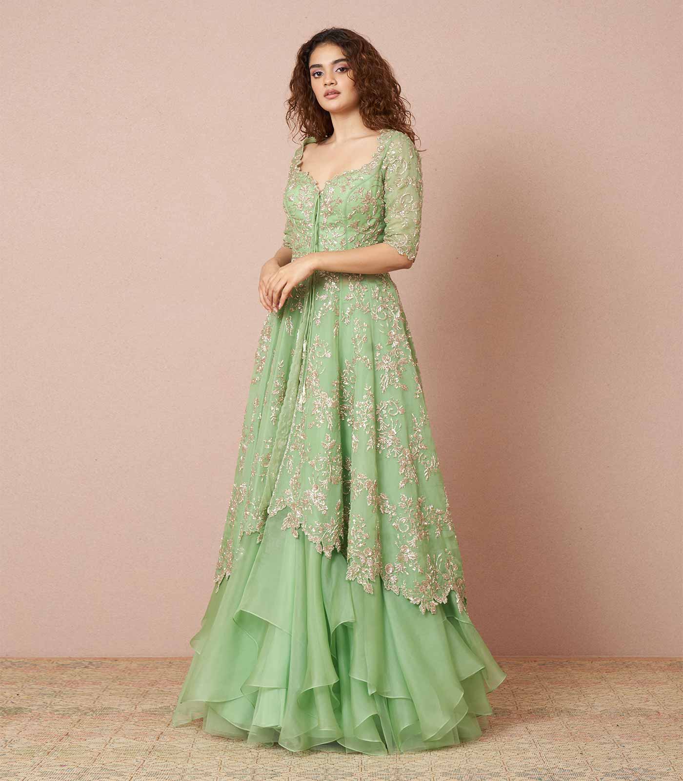 An exquisite mint green organza, cutdana embroidered jacket with layered organza skirt.