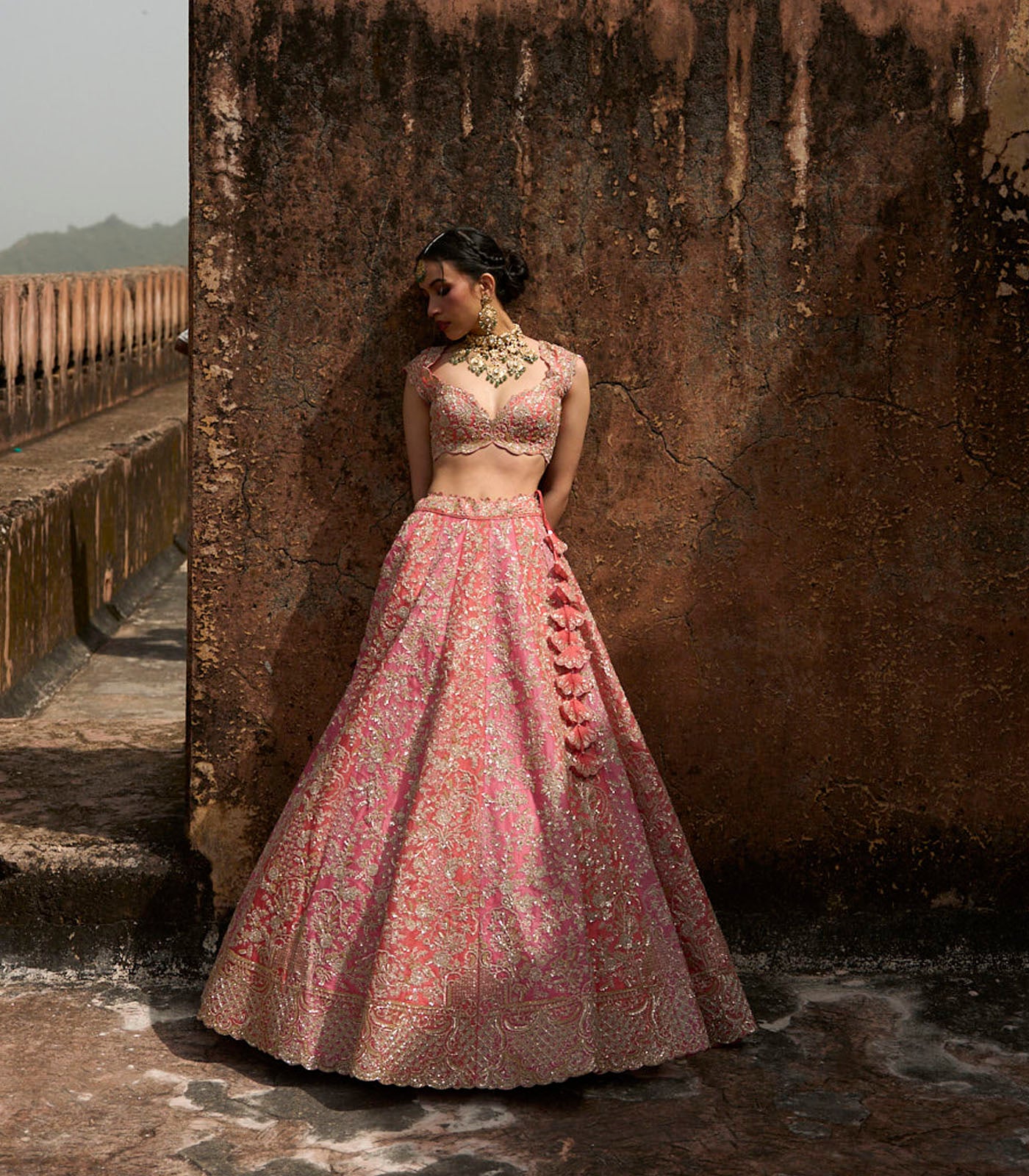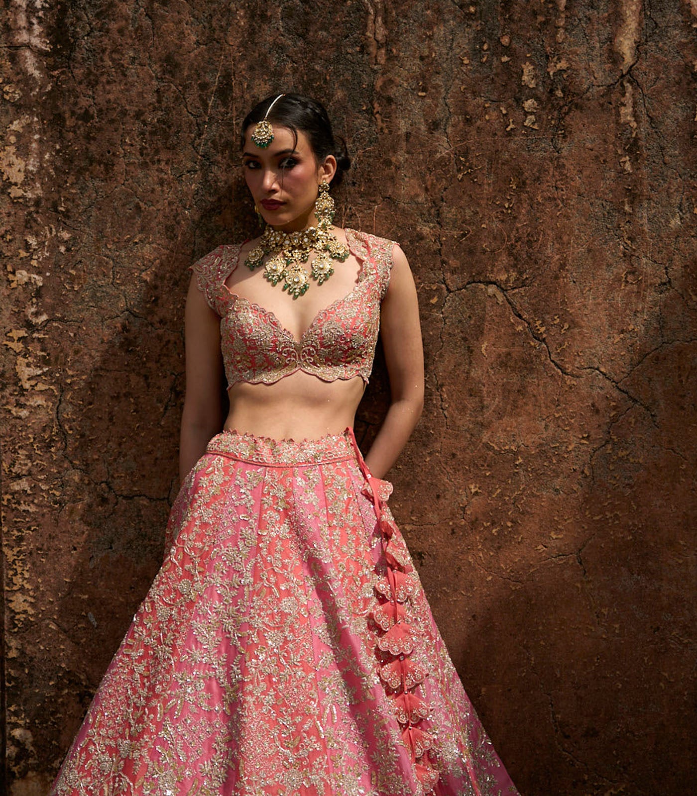 Color: Coral Pink Lehenga & Blouse with Green Dupatta