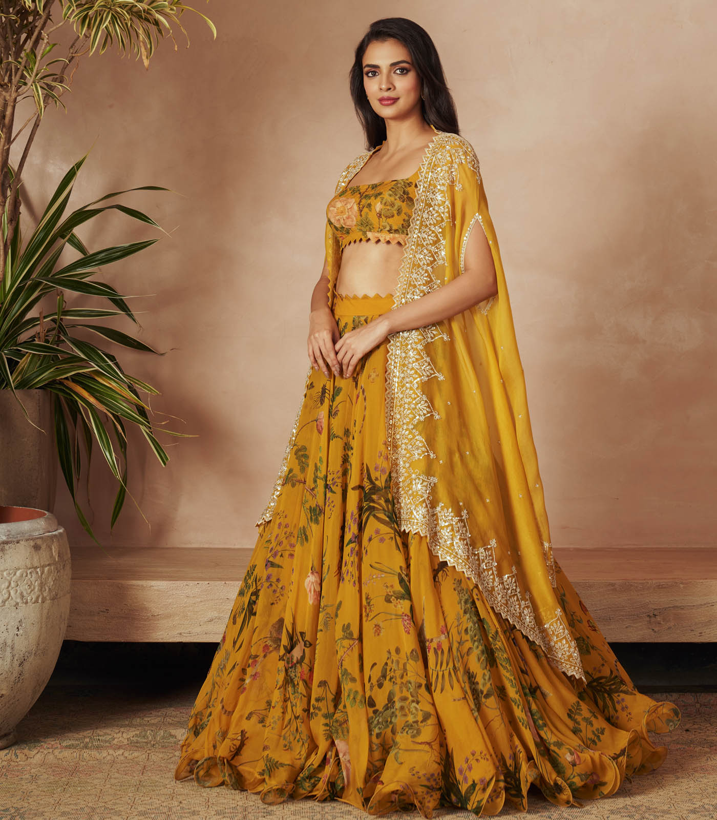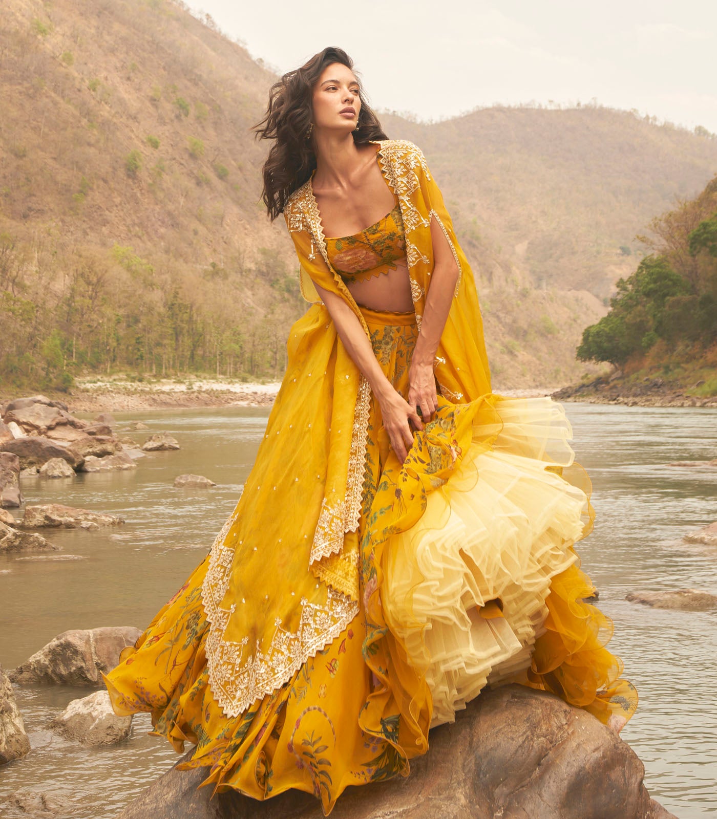 YELLOW PRINTED ORGANZA CROP TOP AND LEHENGA PAIRED WITH YELLOW ORGANZA MARYUL EMBROIDERED CAPE SET