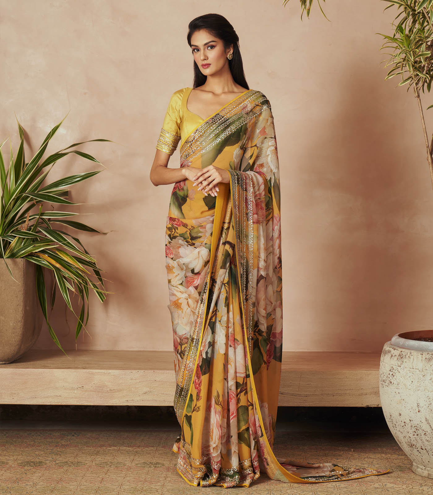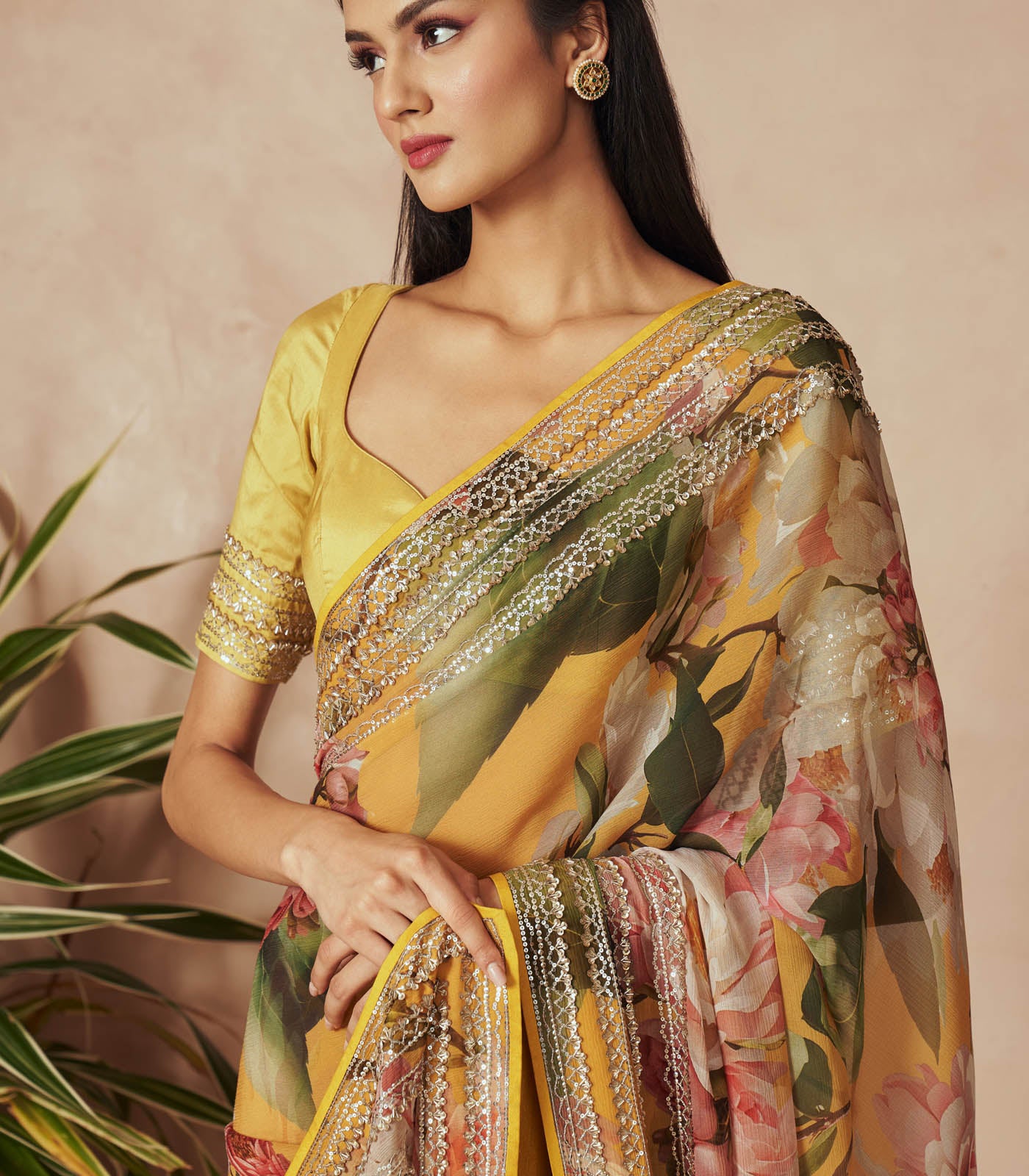 YELLOW PRINTED CHIFFON SEQUIN BORDER SAREE SET.